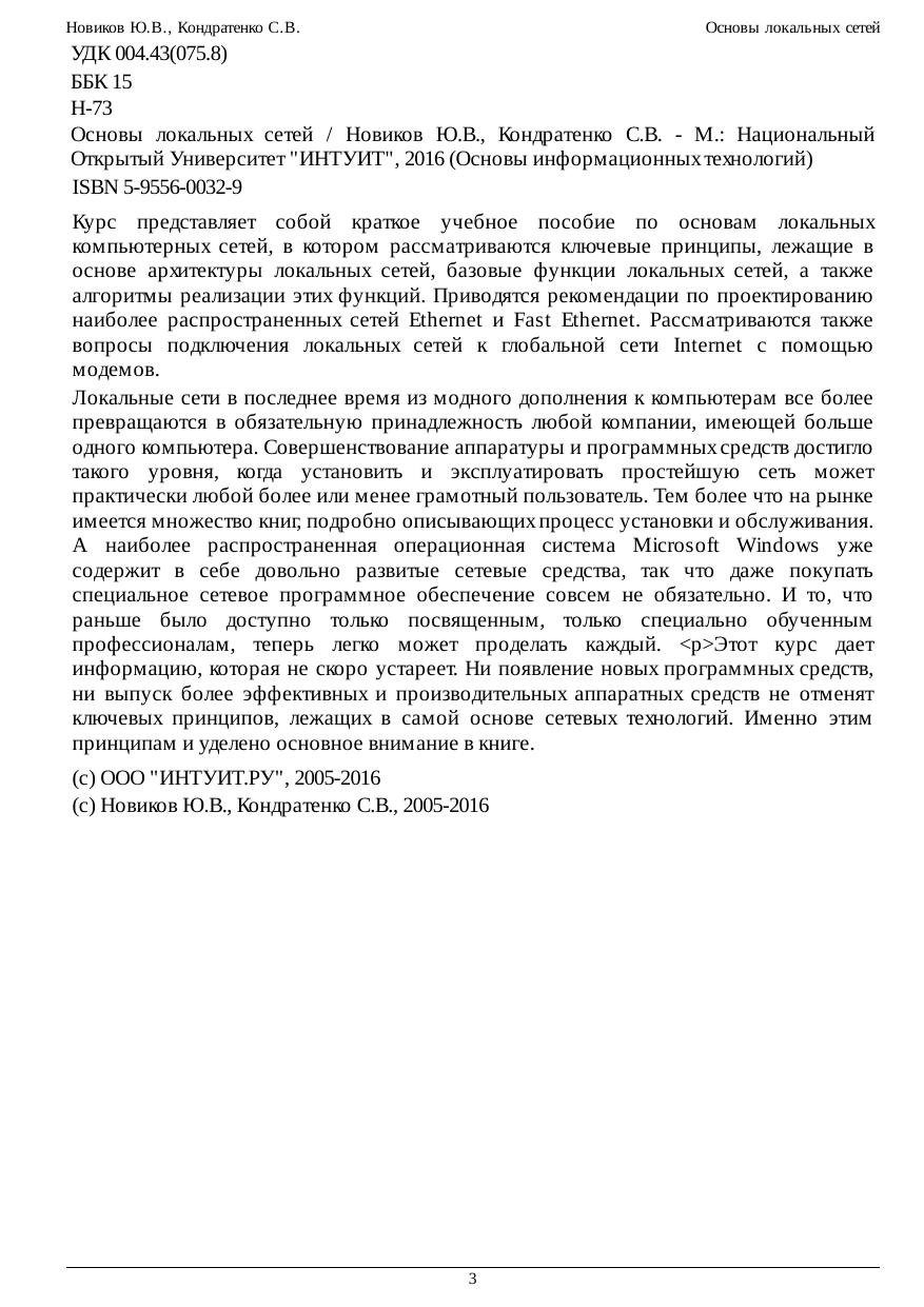 Курс представляет собой краткое учебное пособие по основам локальных компьютерных сетей, в котором рассматриваются ключевые принципы, лежащие в основе архитектуры локальных сетей, базовые функции локальных сетей, а также алгоритмы реализации этих функций. Приводятся рекомендации по проектированию наиболее распространенных сетей Ethernet и Fast Ethernet. Рассматриваются также вопросы подключения локальных сетей к глобальной сети Internet с помощью модемов. Локальные сети в последнее время из модного дополнения к компьютерам все более превращаются в обязательную принадлежность любой компании, имеющей больше одного компьютера. Совершенствование аппаратуры и программных средств достигло такого уровня, когда установить и эксплуатировать простейшую сеть может практически любой более или менее грамотный пользователь. Тем более что на рынке имеется множество книг, подробно описывающих процесс установки и обслуживания. А наиболее распространенная операционная система Microsoft Windows уже содержит в себе довольно развитые сетевые средства, так что даже покупать специальное сетевое программное обеспечение совсем не обязательно. И то, что раньше было доступно только посвященным, только специально обученным профессионалам, теперь легко может проделать каждый. Этот курс дает информацию, которая не скоро устареет. Ни появление новых программных средств, ни выпуск более эффективных и производительных аппаратных средств не отменят ключевых принципов, лежащих в самой основе сетевых технологий. Именно этим принципам и уделено основное внимание в книге.