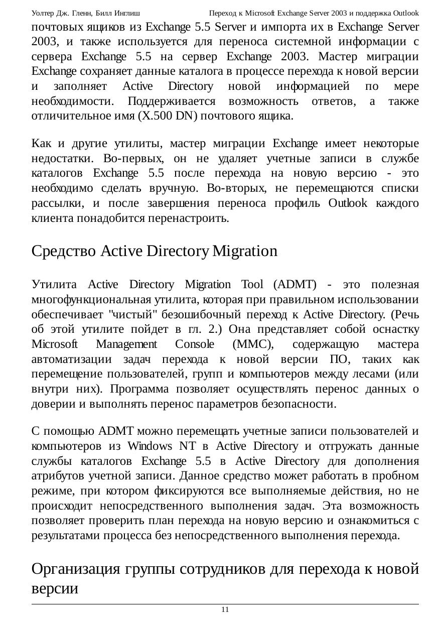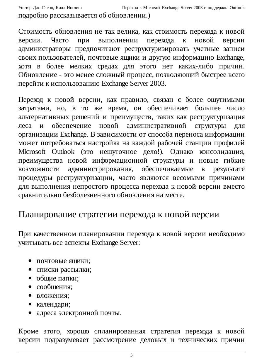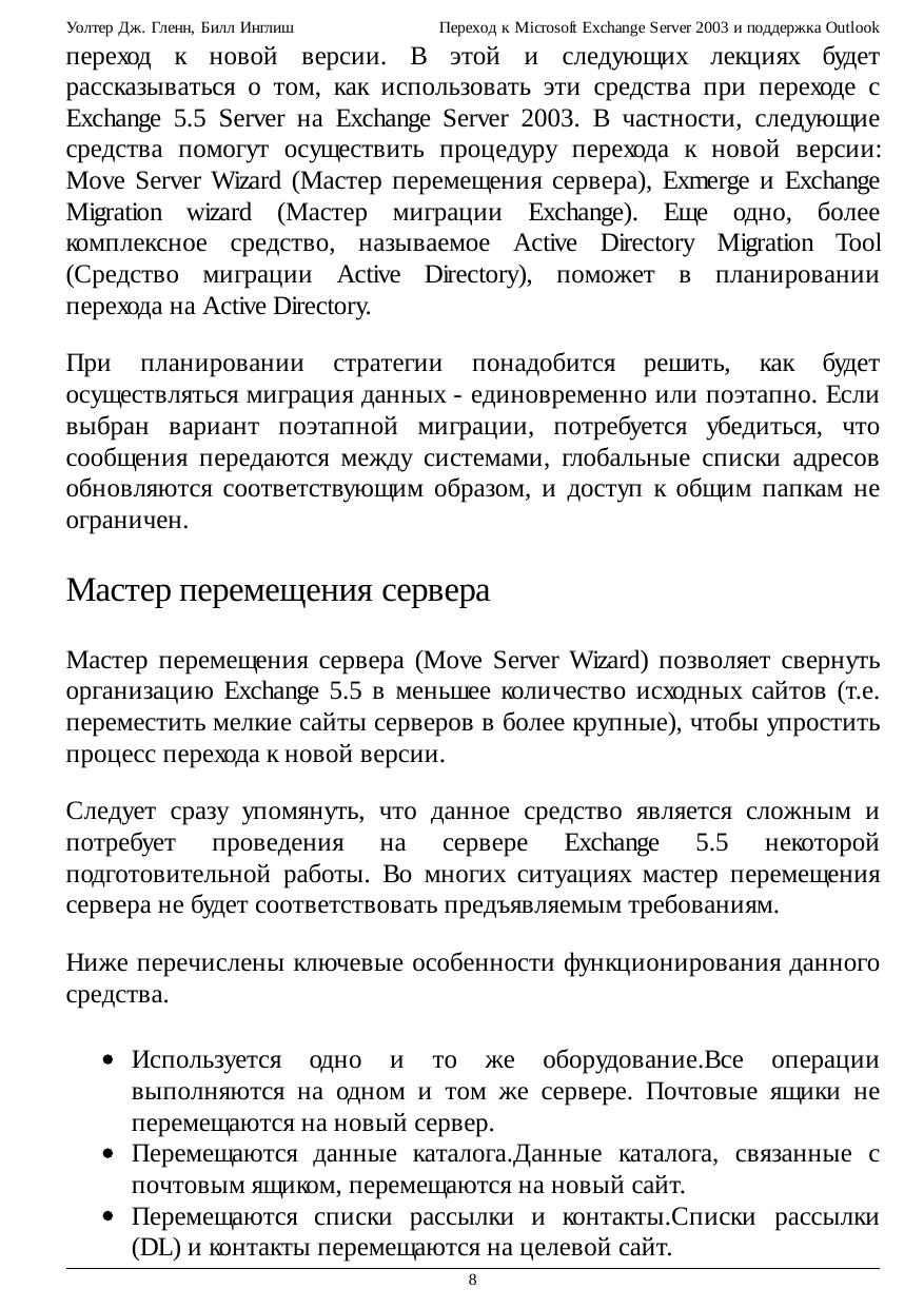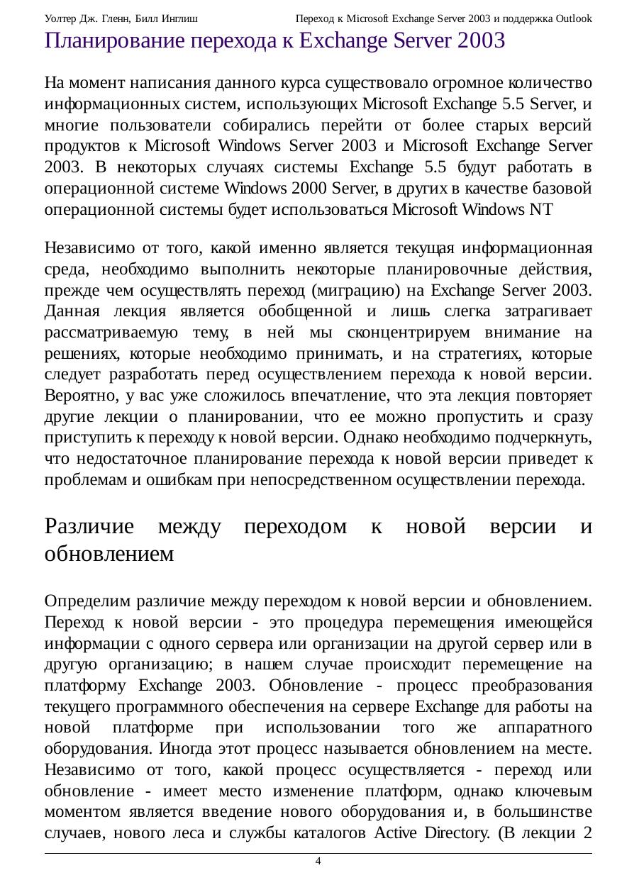 В курсе рассматриваются вопросы перехода к Exchange Server 2003 с более ранних версий и поддержка основных типов клиентов Microsoft Outlook. Показывается, как перемещать пользователей и осуществлять миграцию общих папок в Exchange 2003, а также обсуждаются вопросы сосуществования с предыдущими версиями. Подробно описан процесс развертывания Outlook 2003 и поддержка Outlook Web Access, протоколов интернета и SMTP.