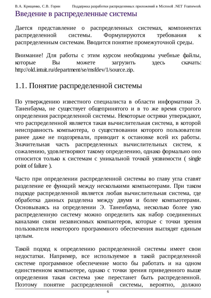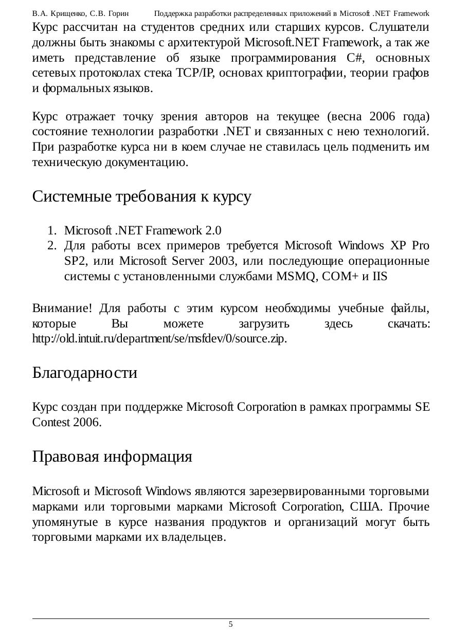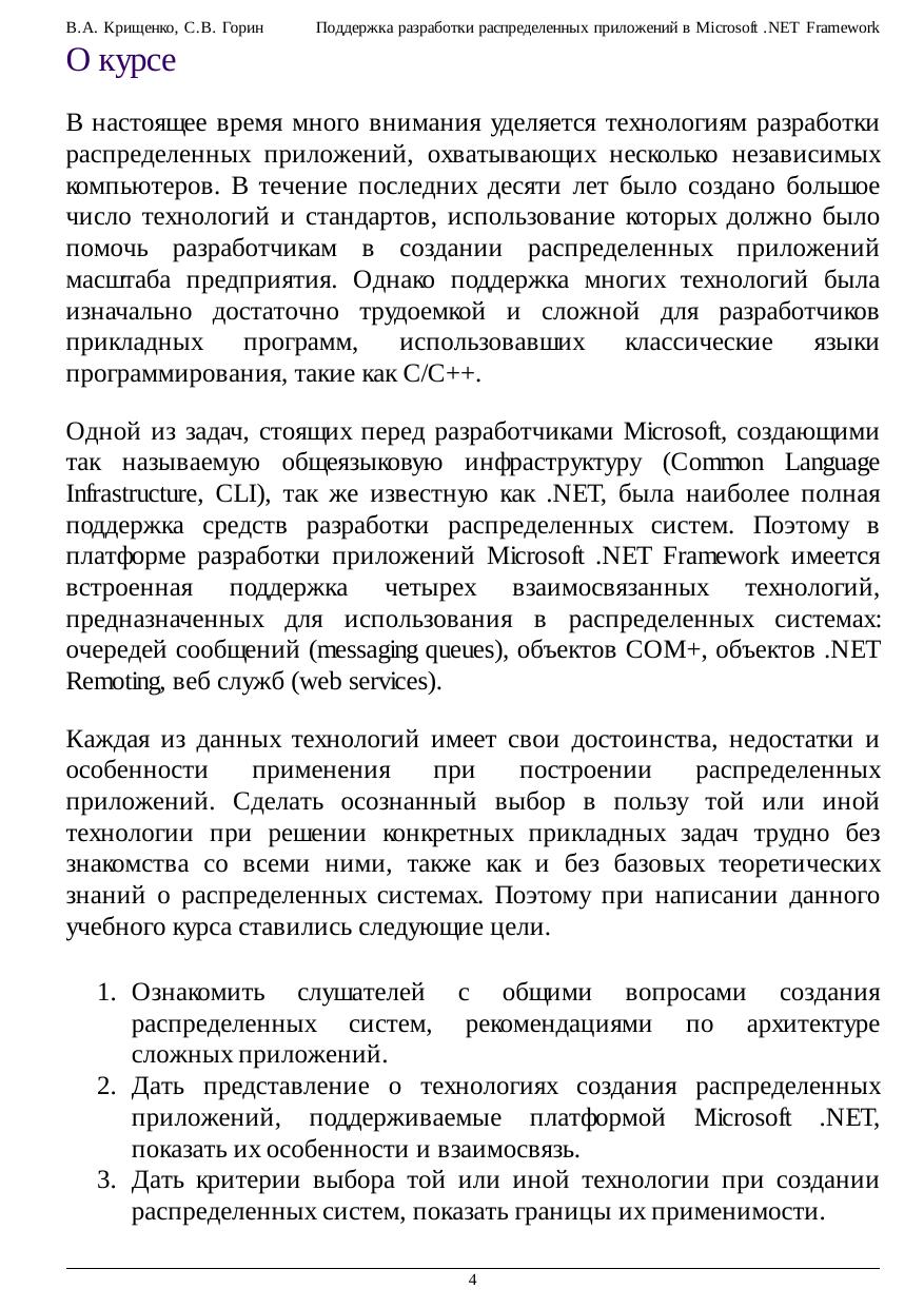 В курсе подробно описаны методы создания распределенных приложений, рекомендации по архитектуре сложных приложений, стандарты по обмену информацией между удаленными системами, а также обеспечение сетевой безопасности. Рассматривается создание распределенных систем на платформе Microsoft (COM+, MSMQ, IIS) с использованием Microsoft .NET Framework.