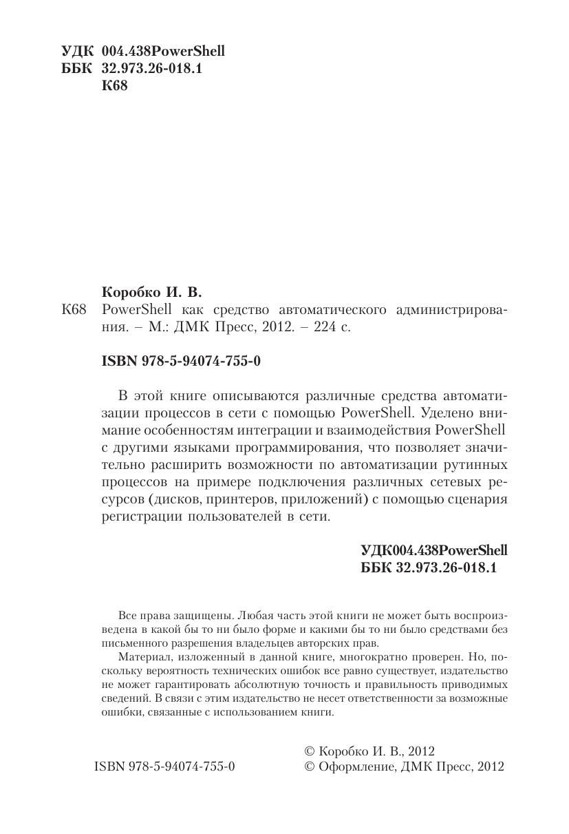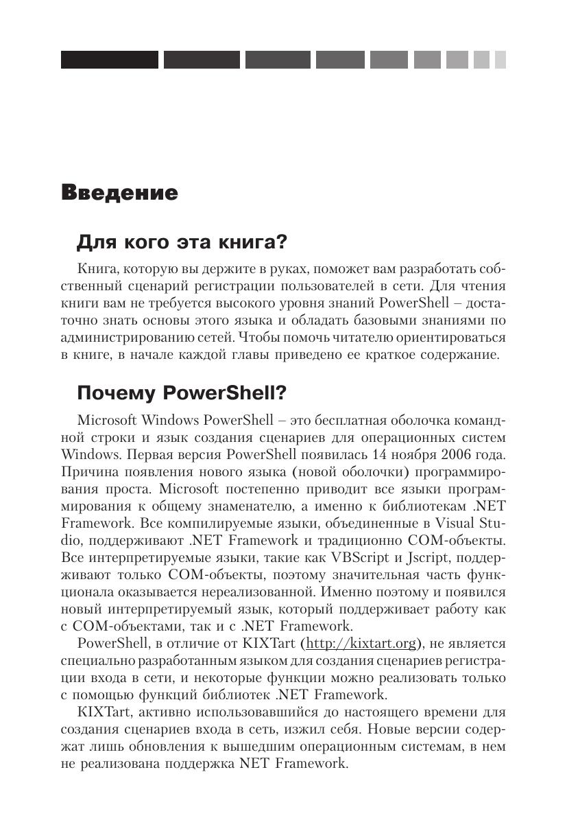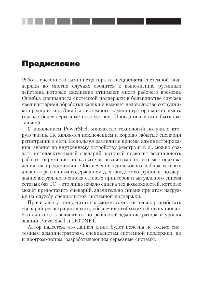 В этой книге описываются различные средства автоматизации процессов в сети с помощью PowerShell. Уделено внимание особенностям интеграции и взаимодействия PowerShell с другими языками программирования, что позволяет значительно расширить возможности по автоматизации рутинных процессов на примере подключения различных сетевых ресурсов (дисков, принтеров, приложений) с помощью сценария регистрации пользователей в сети.