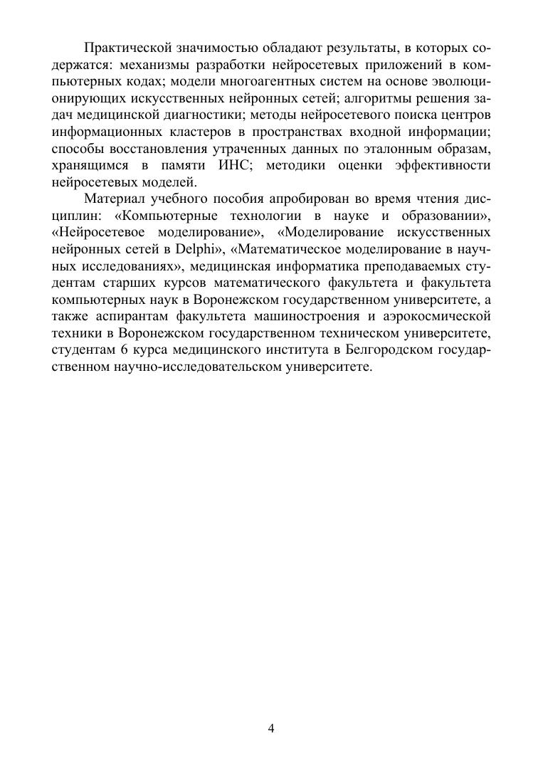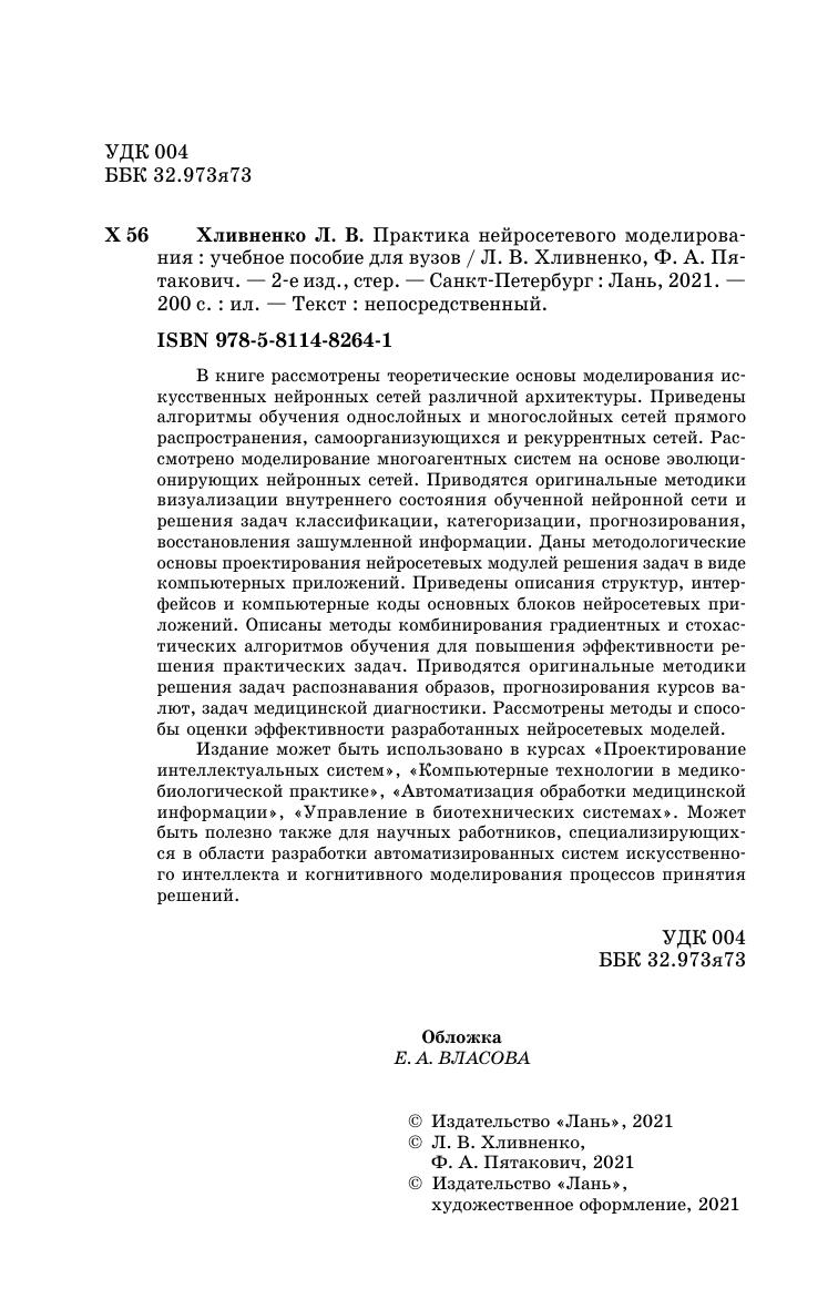 В книге рассмотрены теоретические основы моделирования искусственных нейронных сетей различной архитектуры. Приведены алгоритмы обучения однослойных и многослойных сетей прямого распространения, самоорганизующихся и рекуррентных сетей. Рассмотрено моделирование многоагентных систем на основе эволюционирующих нейронных сетей. Приводятся оригинальные методики визуализации внутреннего состояния обученной нейронной сети и решения задач классификации, категоризации, прогнозирования, восстановления зашумленной информации. Даны методологические основы проектирования нейросетевых модулей решения задач в виде компьютерных приложений. Приведены описания структур, интерфейсов и компьютерные коды основных блоков нейросетевых приложений. Описаны методы комбинирования градиентных и стохастических алгоритмов обучения для повышения эффективности решения практических задач. Приводятся оригинальные методики решения задач распознавания образов, прогнозирования курсов валют, задач медицинской диагностики. Рассмотрены методы и способы оценки эффективности разработанных нейросетевых моделей.