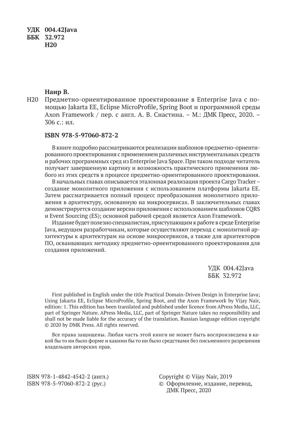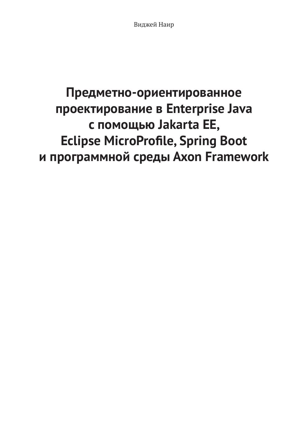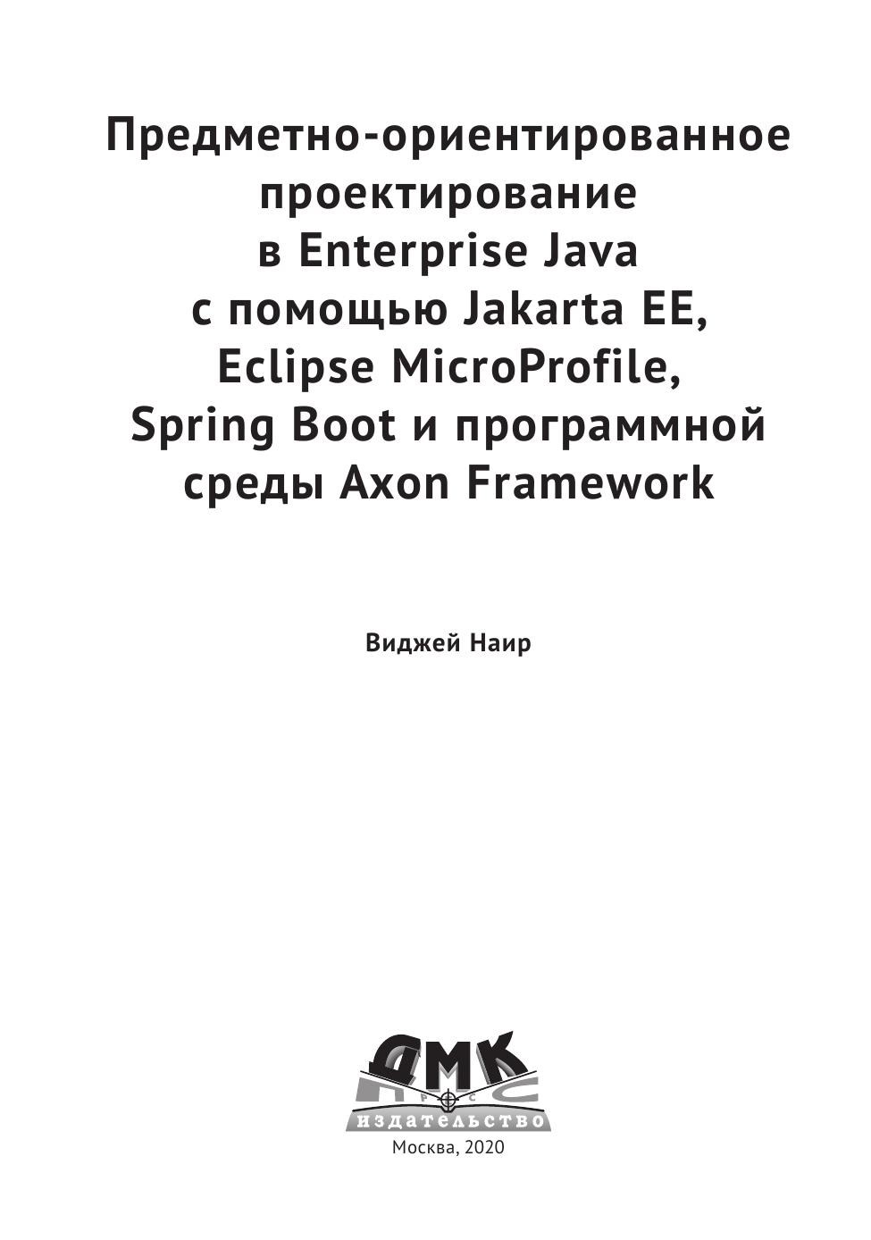 В начальных главах описывается эталонная реализация проекта Cargo Tracker – создание монолитного приложения с использованием платформы Jakarta EE. Затем рассматривается полный процесс преобразования монолитного приложения в архитектуру, основанную на микросервисах. В заключительных главах демонстрируется создание версии приложения с использованием шаблонов CQRS и Event Sourcing (ES); основной рабочей средой является Axon Framework.