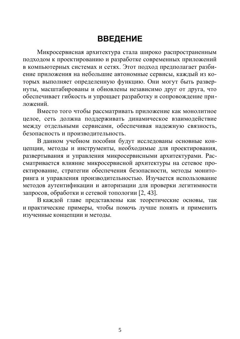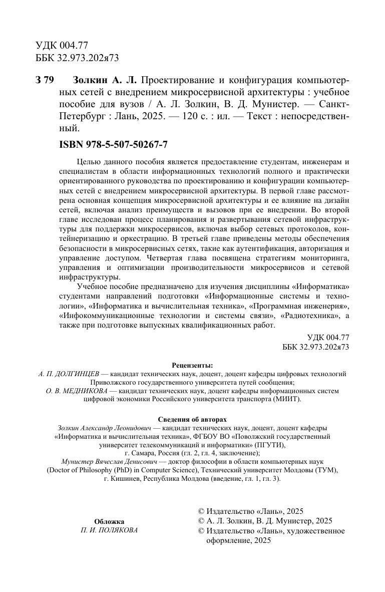 Целью данного пособия является предоставление студентам, инженерам и специалистам в области информационных технологий полного и практически ориентированного руководства по проектированию и конфигурации компьютерных сетей с внедрением микросервисной архитектуры. В первой главе рассмотрена основная концепция микросервисной архитектуры и ее влияние на дизайн сетей, включая анализ преимуществ и вызовов при ее внедрении. Во второй главе исследован процесс планирования и развертывания сетевой инфраструктуры для поддержки микросервисов, включая выбор сетевых протоколов, контейнеризацию и оркестрацию. В третьей главе приведены методы обеспечения безопасности в микросервисных сетях, такие как аутентификация, авторизация и управление доступом. Четвертая глава посвящена стратегиям мониторинга, управления и оптимизации производительности микросервисов и сетевой инфраструктуры. Учебное пособие предназначено для изучения дисциплины «Информатика» студентами направлений подготовки «Информационные системы и технологии», «Информатика и вычислительная техника», «Программная инженерия», «Инфокоммуникационные технологии и системы связи», «Радиотехника», а также при подготовке выпускных квалификационных работ.