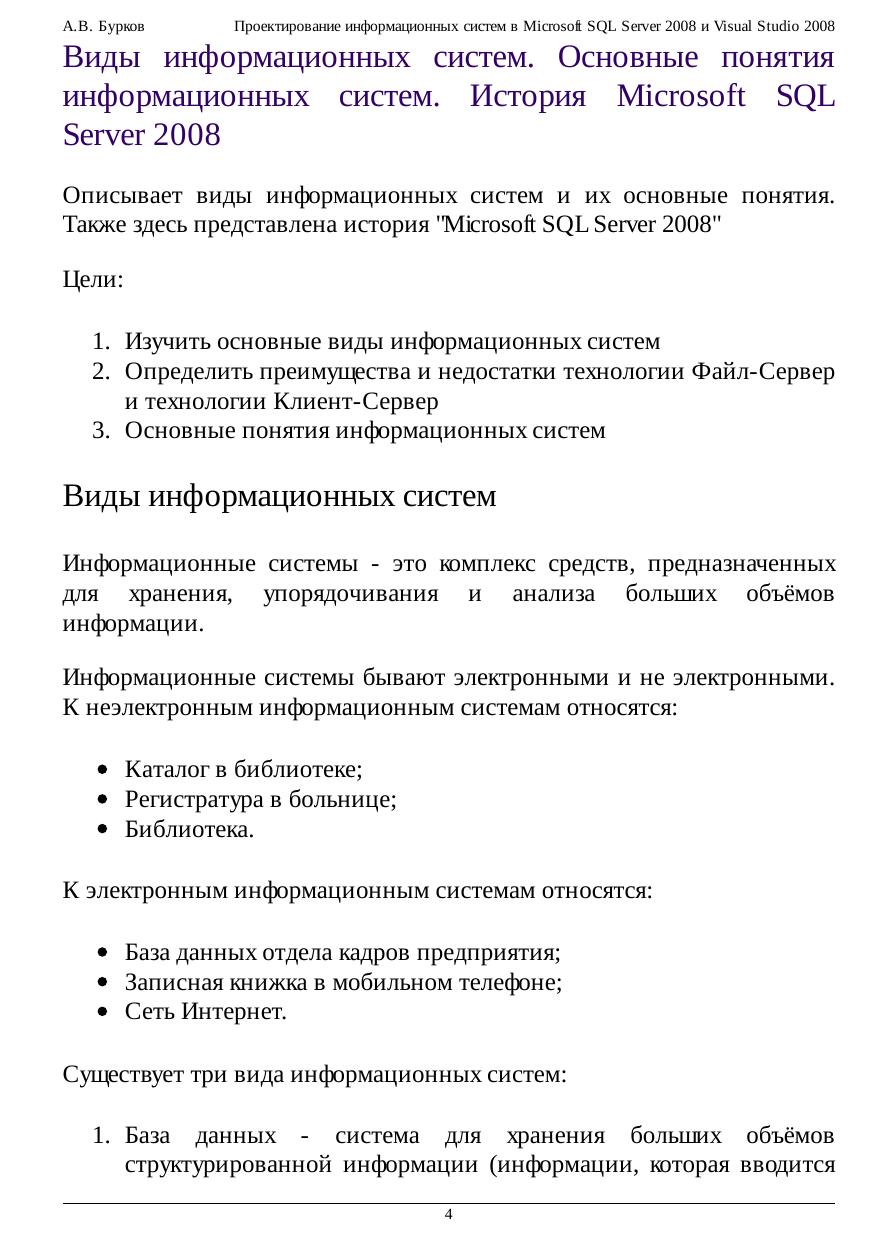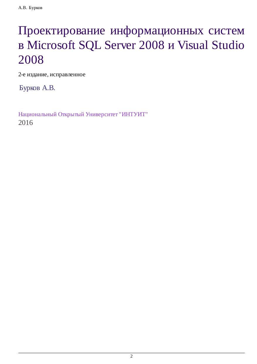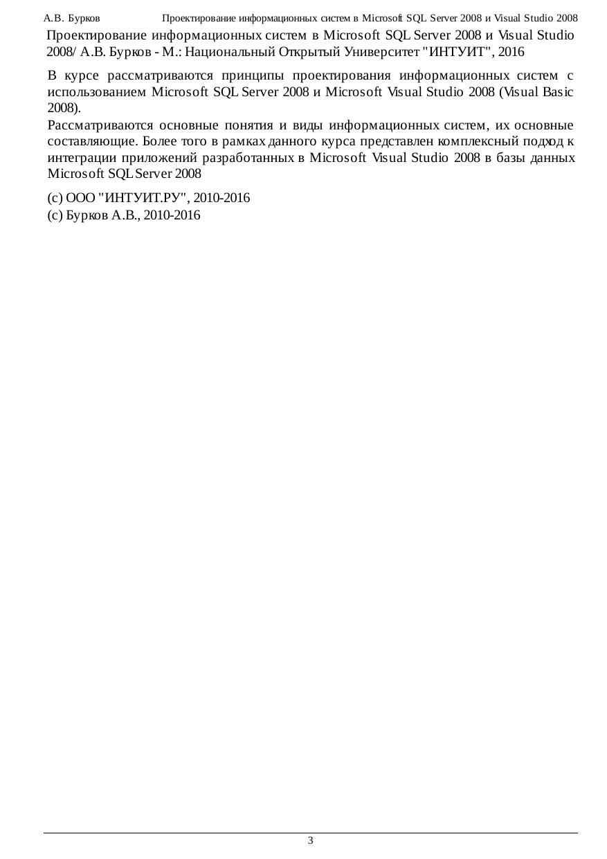 В курсе рассматриваются принципы проектирования информационных систем с использованием Microsoft SQL Server 2008 и Microsoft Visual Studio 2008 (Visual Basic 2008). Рассматриваются основные понятия и виды информационных систем, их основные составляющие. Более того в рамках данного курса представлен комплексный подход к интеграции приложений разработанных в Microsoft Visual Studio 2008 в базы данных Microsoft SQL Server 2008