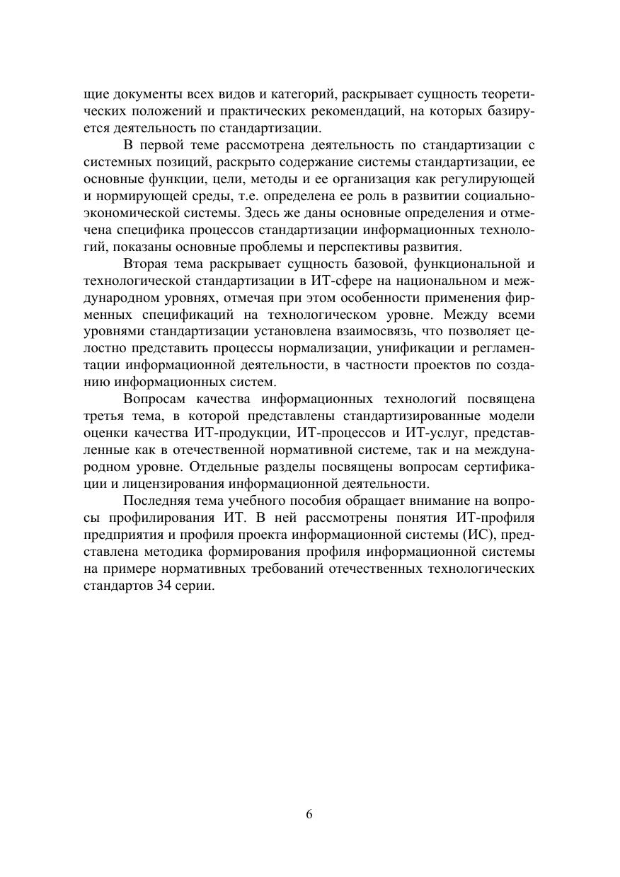 Учебное пособие посвящено разработке и стандартизации ин-формационных технологий и прикладных информационных систем. В пособии приведена классификация информационных технологий (ИТ), рассматриваются характеристики и принципы стандартизации в сфере ИТ как на национальном, так и международном уровне, а также дея-тельность по сертификации и лицензировании информационных про-цессов, продуктов и услуг, представлены современные модели оценки их качества, применяемые в мировом сообществе. Подробно рассмот-рены функциональные и технологические области стандартизации ИТ, изучены методологические основы проектирования информационных систем, установлены взаимосвязи между требованиями нормативных документов в соответствии со сферами их применения.