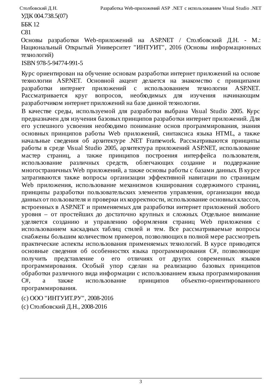 Курс ориентирован на обучение основам разработки интернет приложений на основе технологии ASP.NET. Основной акцент делается на знакомство с принципами разработки интернет приложений с использованием технологии ASP.NET. Рассматривается круг вопросов, необходимых для изучения начинающим разработчиком интернет приложений на базе данной технологии. В качестве среды, используемой для разработки выбрана Visual Studio 2005. Курс предназначен для изучения базовых принципов разработки интернет приложений. Для его успешного усвоения необходимо понимание основ программирования, знания основных принципов работы Web приложений, синтаксиса языка HTML, а также начальные сведения об архитектуре .NET Framework. Рассматриваются принципы работы в среде Visual Studio 2005, архитектура приложений ASP.NET, использование мастер страниц, а также принципов построения интерфейса пользователя, использование различных средств, облегчающих создание и поддержание многостраничных Web приложений, а также основы работы с базами данных. В курсе затрагиваются также вопросы организации эффективной навигации по страницам Web приложения, использование механизмов кэширования содержимого страниц, принципы разработки пользовательских элементов управления, организации ввода данных от пользователя и проверки их корректности, использование основных классов, встроенных в ASP.NET и применяемых для разработки интернет приложений любого уровня – от простейших до достаточно крупных и сложных. Отдельное внимание уделяется созданию и управлению оформления страниц Web приложения с использованием каскадных таблиц стилей и тем. Все рассматриваемые вопросы снабжены большим количеством примеров, позволяющих в полной мере рассмотреть практические аспекты использования применяемых технологий. В курсе приводятся основные сведения об особенностях языка программирования C#, позволяющие получить представление о его отличиях от других современных языков программирования. Особый упор сделан на реализацию базовых принципов обработки различного вида информации с использованием языка программирования C#, а также использование принципов объектно-ориентированного программирования.