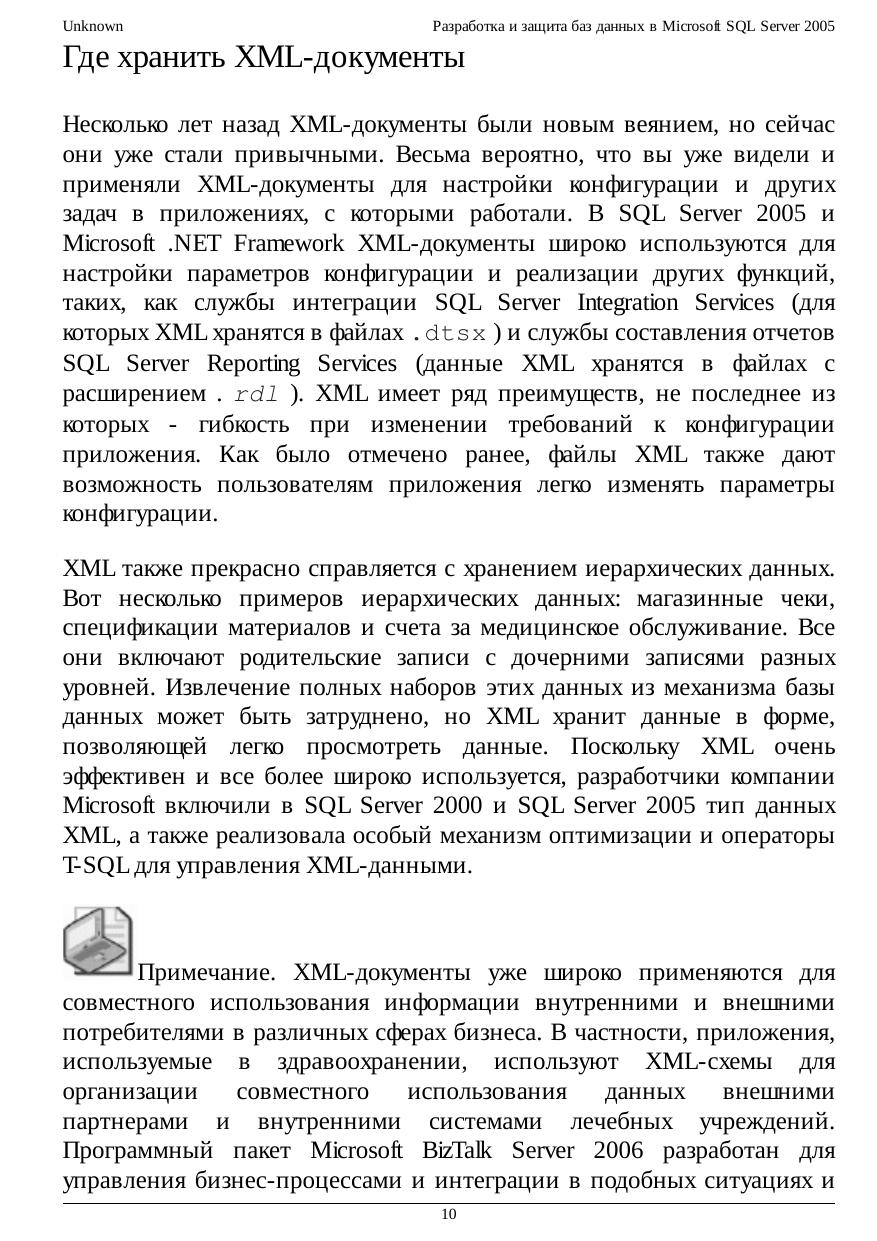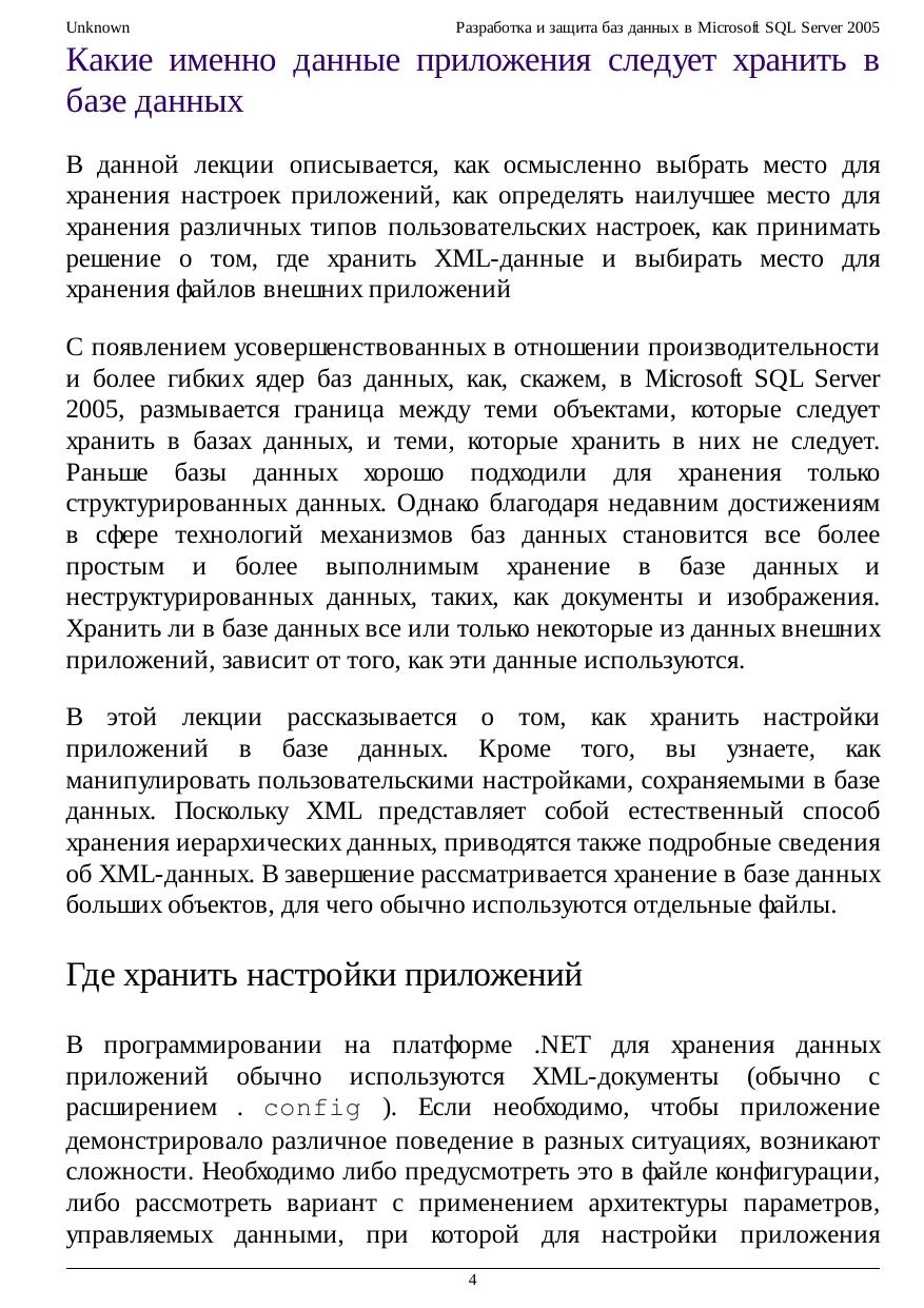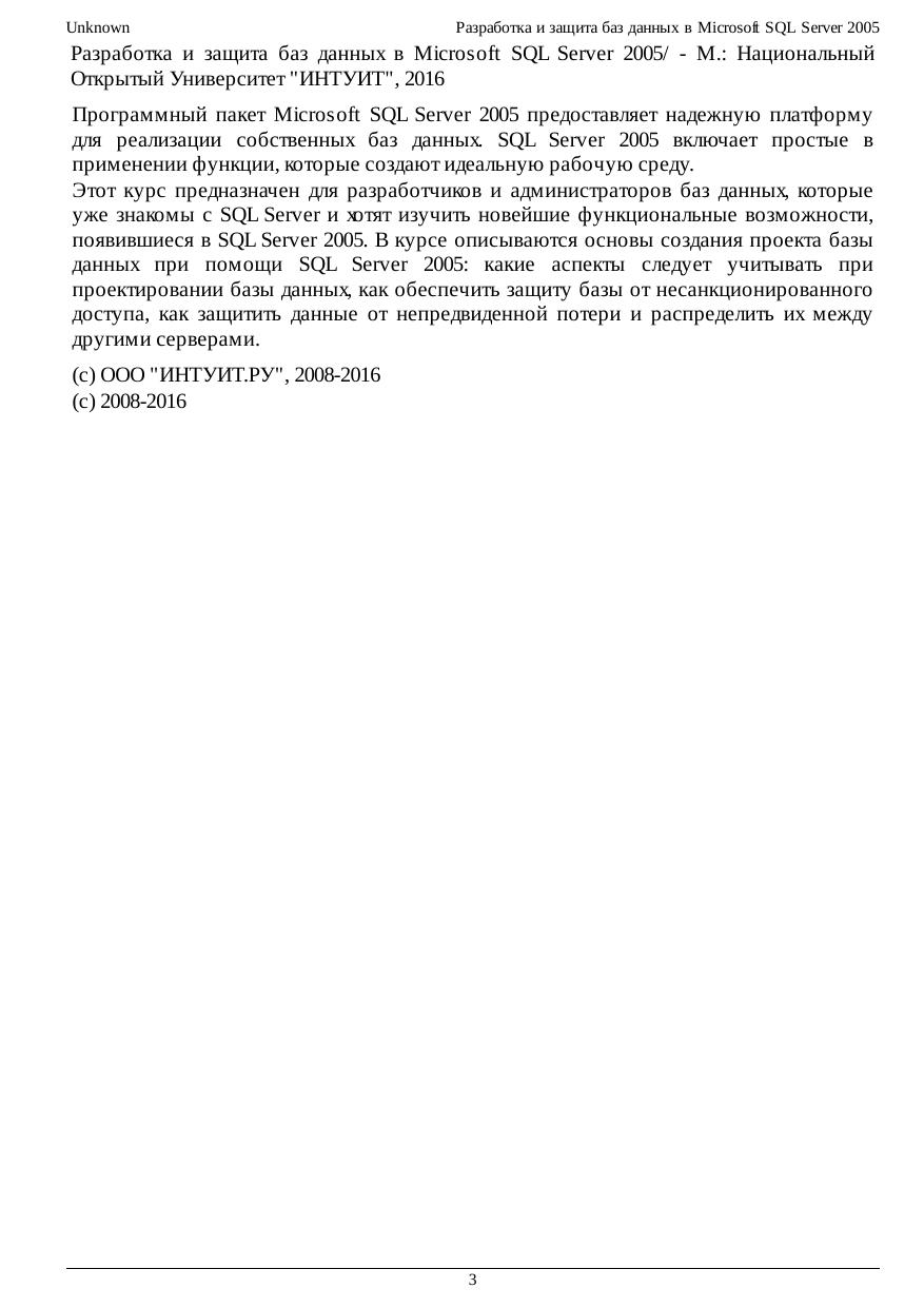 Программный пакет Microsoft SQL Server 2005 предоставляет надежную платформу для реализации собственных баз данных. SQL Server 2005 включает простые в применении функции, которые создают идеальную рабочую среду. Этот курс предназначен для разработчиков и администраторов баз данных, которые уже знакомы с SQL Server и хотят изучить новейшие функциональные возможности, появившиеся в SQL Server 2005. В курсе описываются основы создания проекта базы данных при помощи SQL Server 2005: какие аспекты следует учитывать при проектировании базы данных, как обеспечить защиту базы от несанкционированного доступа, как защитить данные от непредвиденной потери и распределить их между другими серверами.