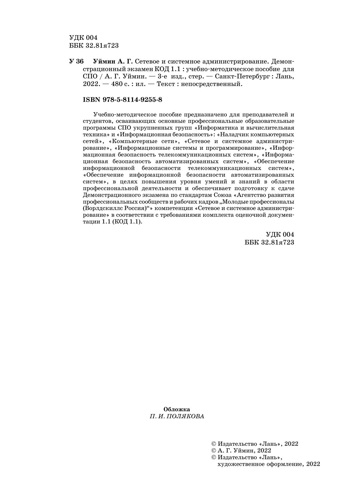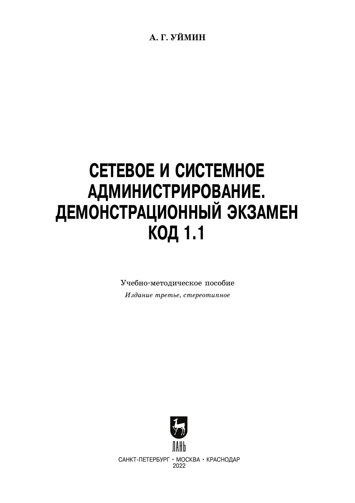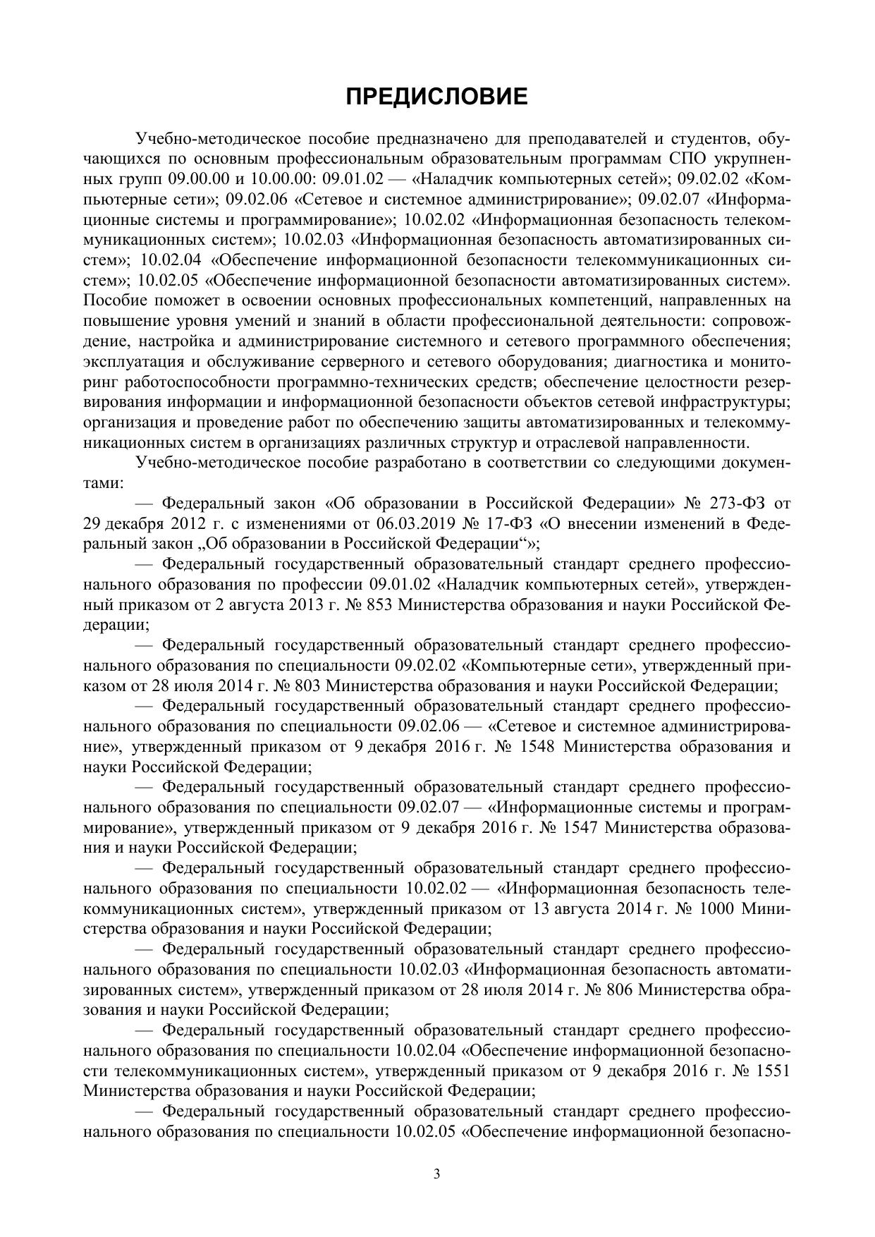 Учебное пособие предназначено для преподавателей и студентов, осваивающих основные профессиональные образовательные программы СПО укрупненных групп «Информатика и вычислительная техника» и «Информационная безопасность»: «Наладчик компьютерных сетей», «Компьютерные сети», «Сетевое и системное администрирование», «Информационные системы и программирование», «Информационная безопасность телекоммуникационных систем», «Информационная безопасность автоматизированных систем», «Обеспечение информационной безопасности телекоммуникационных систем», «Обеспечение информационной безопасности автоматизированных систем» в целях повышения уровня умений и знаний в области профессиональной деятельности и обеспечивает подготовку к сдаче Демонстрационного экзамена по стандартам Союза «Агентство развития профессиональных сообществ и рабочих кадров „Молодые профессионалы (Ворлдскиллс Россия)“» компетенции «Сетевое и системное администрирование» в соответствии с требованиями комплекта оценочной документации 1.1 (КОД 1.1).