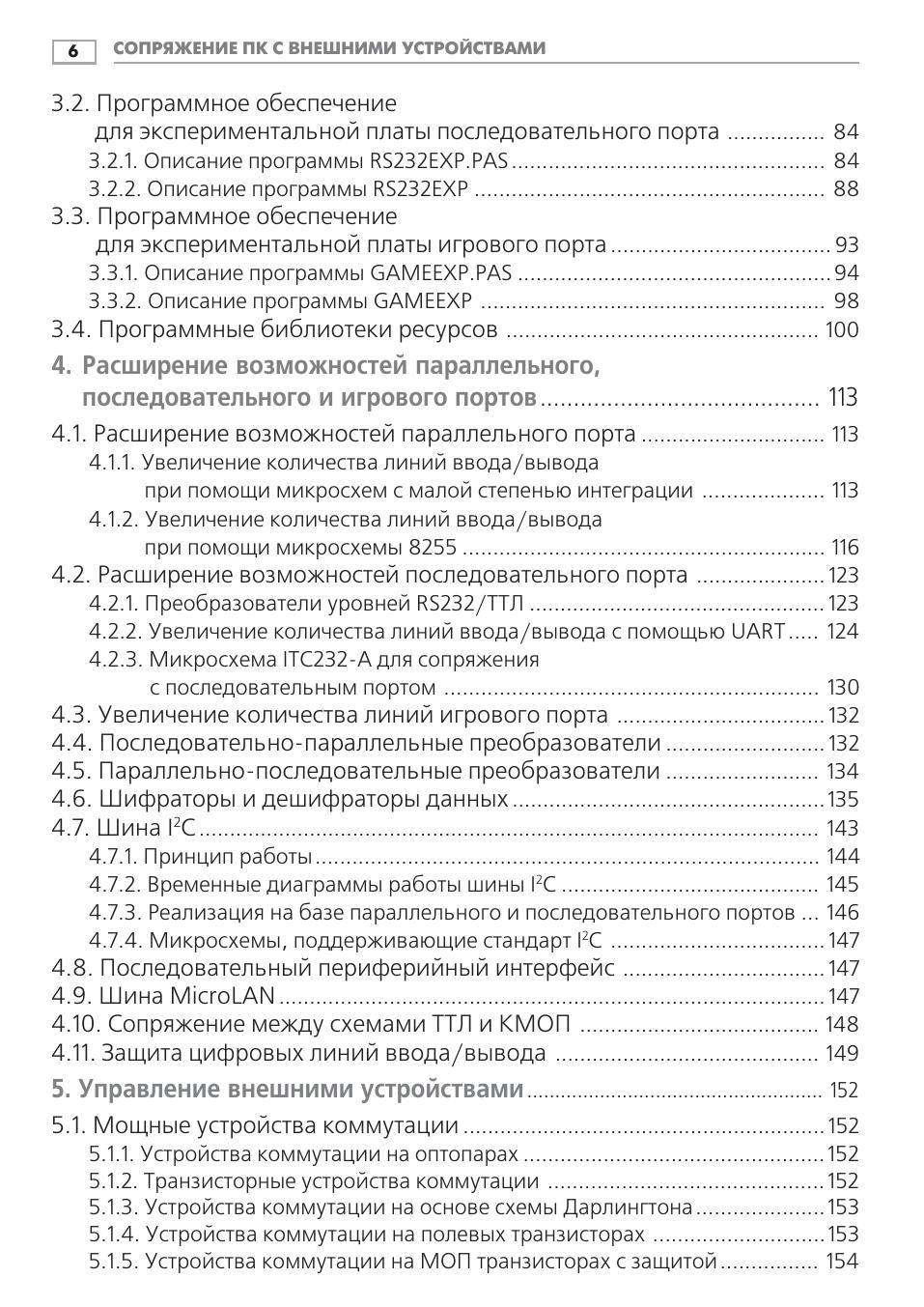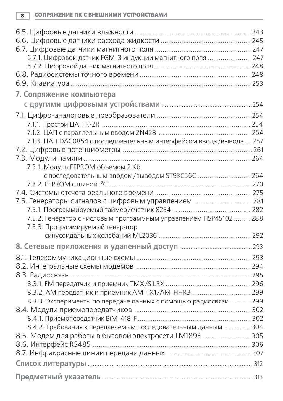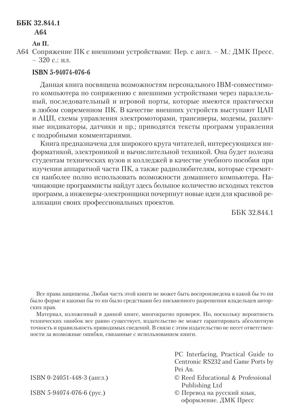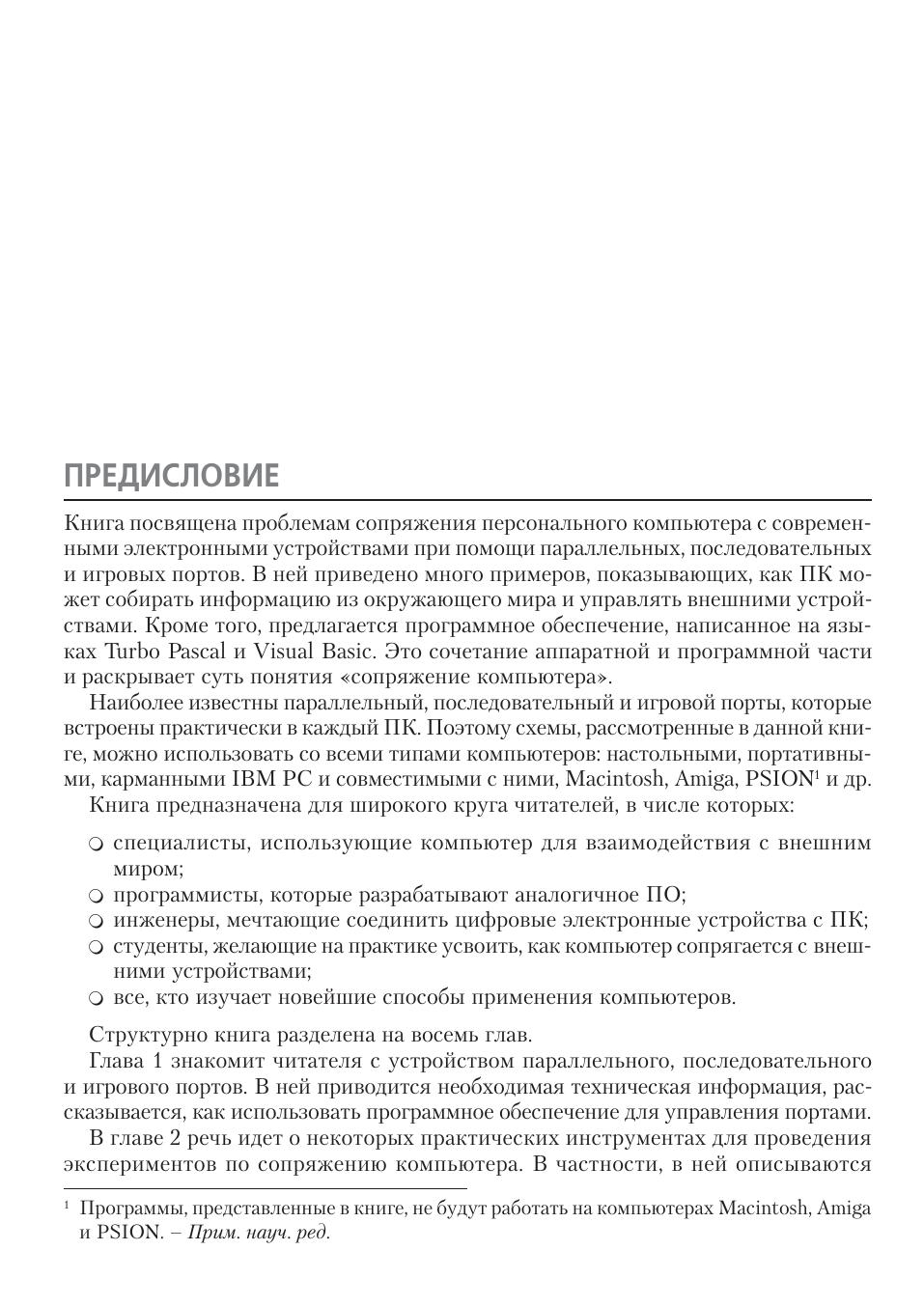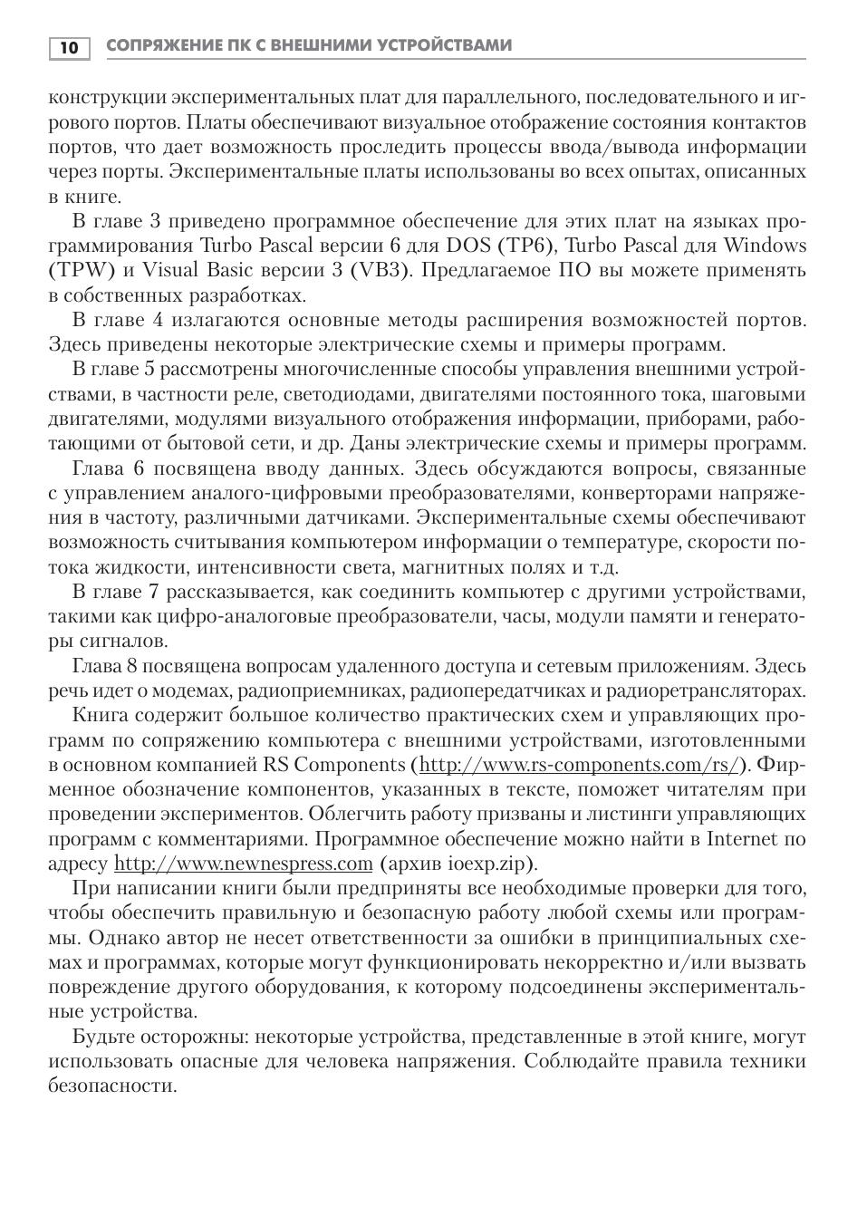 Данная книга посвящена возможностям персонального IBM-совместимого компьютера по сопряжению с внешними устройствами через параллельный, последовательный и игровой порты, которые имеются практически в любом современном ПК. В качестве внешних устройств выступают ЦАП и АЦП, схемы управления электромоторами, трансиверы, модемы, различные индикаторы, датчики и пр., приводятся тексты программ управления с подробными комментариями. Книга предназначена для широкого круга читателей, интересующихся информатикой, электроникой и вычислительной техникой. Она будет полезна студентам технических вузов и колледжей в качестве учебного пособия при изучении аппаратной части ПК, а также радиолюбителям, которые стремятся наиболее полно использовать возможности домашнего компьютера. Начинающие программисты найдут здесь большое количество исходных текстов программ, а инженеры электронщики почерпнут новые идеи для красивой реализации своих профессиональных проектов.