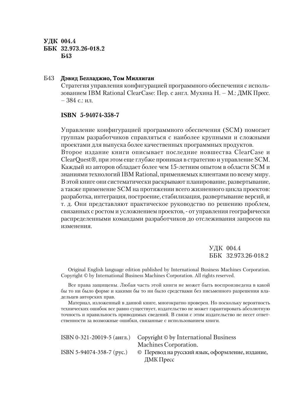 Управление конфигурацией программного обеспечения (SCM) помогает группам разработчиков справляться с наиболее крупными и сложными проектами для выпуска более качественных программных продуктов. Второе издание книги описывает последние новшества ClearCase и ClearQuest®, при этом еще глубже проникая в стратегию и управление SCM. Каждый из авторов обладает более чем 15 летним опытом в области SCM и знаниями технологий IBM Rational, применяемых клиентами по всему миру. В этой книге они систематически раскрывают планирование, развертывание, а также применение SCM на протяжении всего жизненного цикла проектов: разработка, интеграция, построение, стабилизация, развертывание версий, и т. д. Они представляют практическое руководство по решению проблем, связанных с ростом и усложнением проектов, от управления географически распределенными командами разработчиков до отслеживания запросов на изменения.