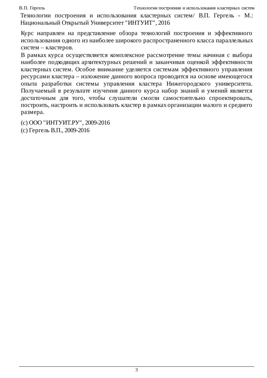 Курс направлен на представление обзора технологий построения и эффективного использования одного из наиболее широкого распространенного класса параллельных систем – кластеров. В рамках курса осуществляется комплексное рассмотрение темы начиная с выбора наиболее подходящих архитектурных решений и заканчивая оценкой эффективности кластерных систем. Особое внимание уделяется системам эффективного управления ресурсами кластера – изложение данного вопроса проводится на основе имеющегося опыта разработки системы управления кластера Нижегородского университета. Получаемый в результате изучения данного курса набор знаний и умений является достаточным для того, чтобы слушатели смогли самостоятельно спроектировать, построить, настроить и использовать кластер в рамках организации малого и среднего размера.