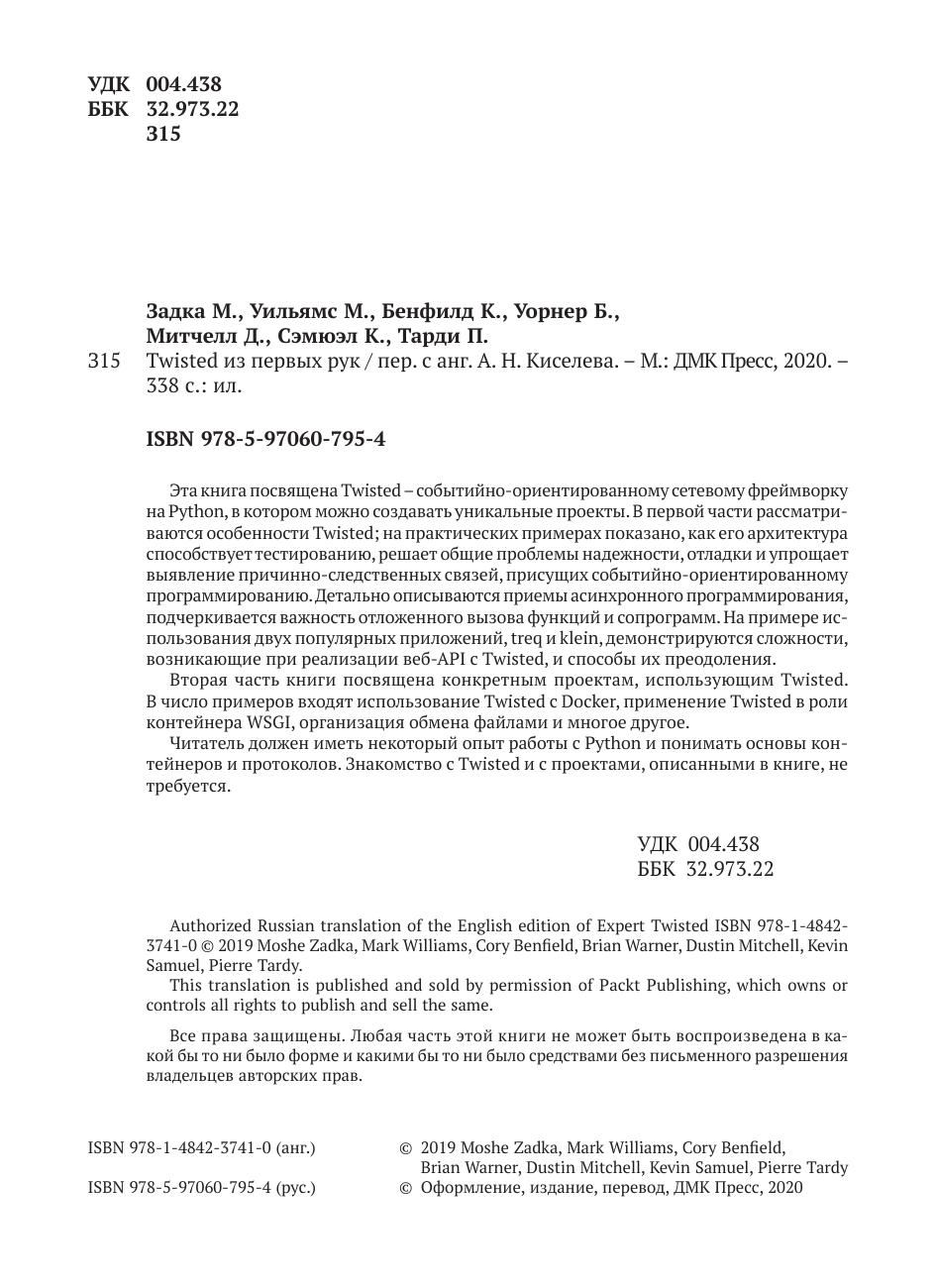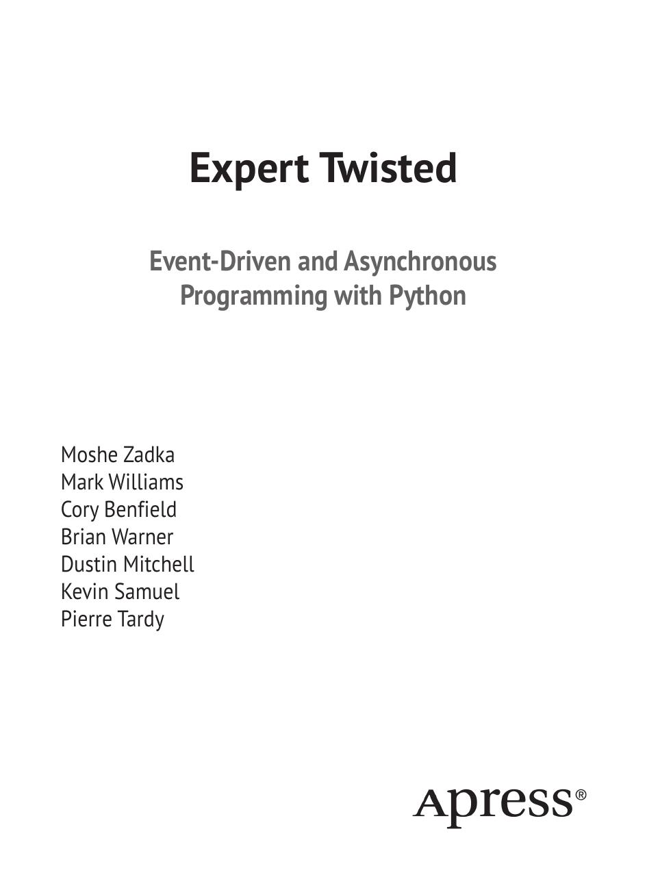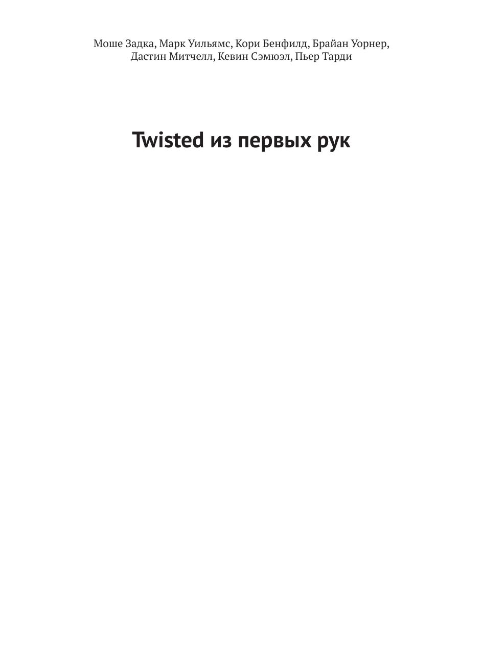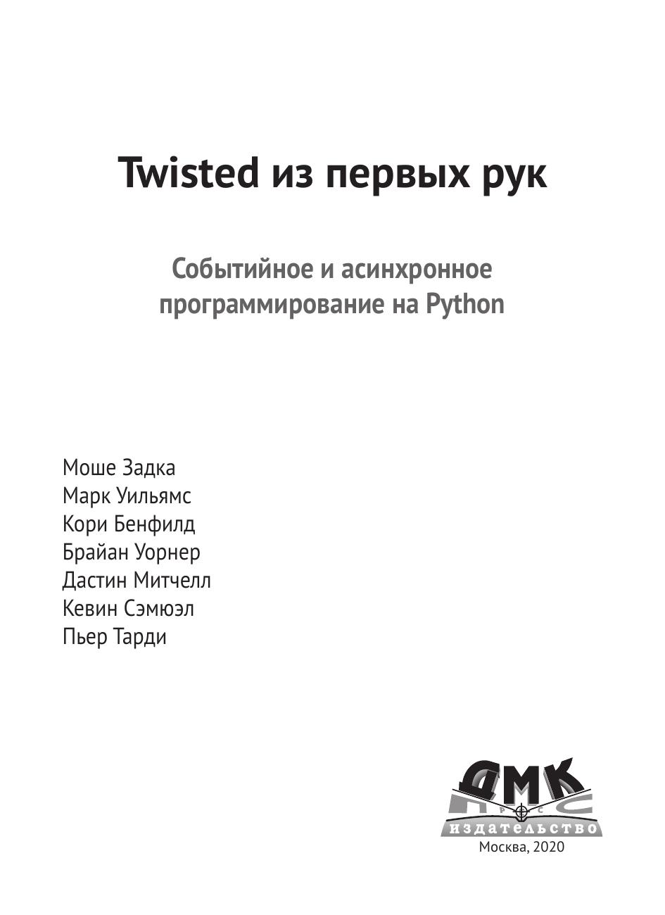 Twisted – событийно-ориентированный сетевой фреймворк на языке Python. Данная книга написана ведущими специалистами по Twisted, которые продемонстрируют, в чем состоит уникальность этого фреймворка, и ознакомят вас с проектами, в которые они лично внесли свой вклад.