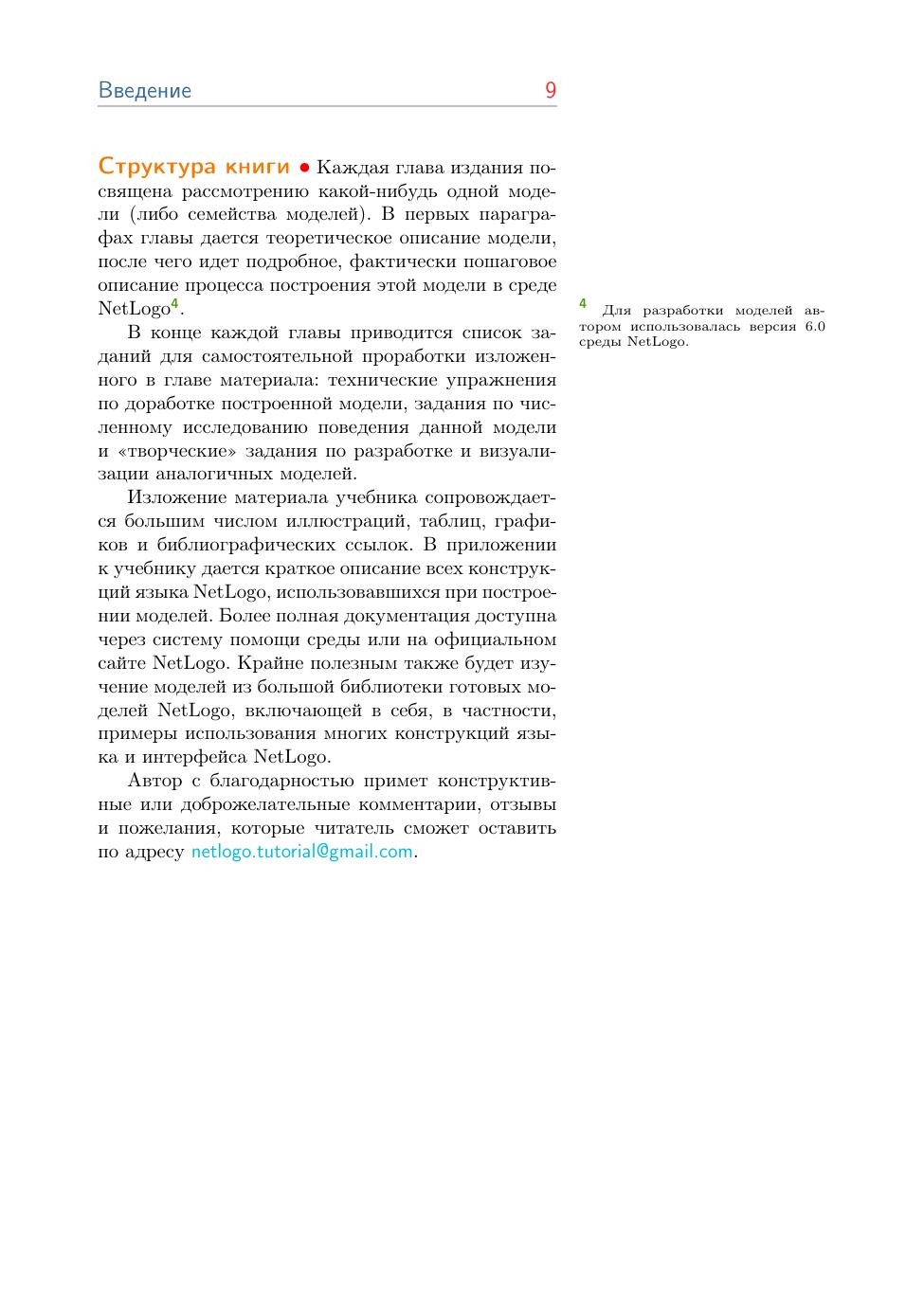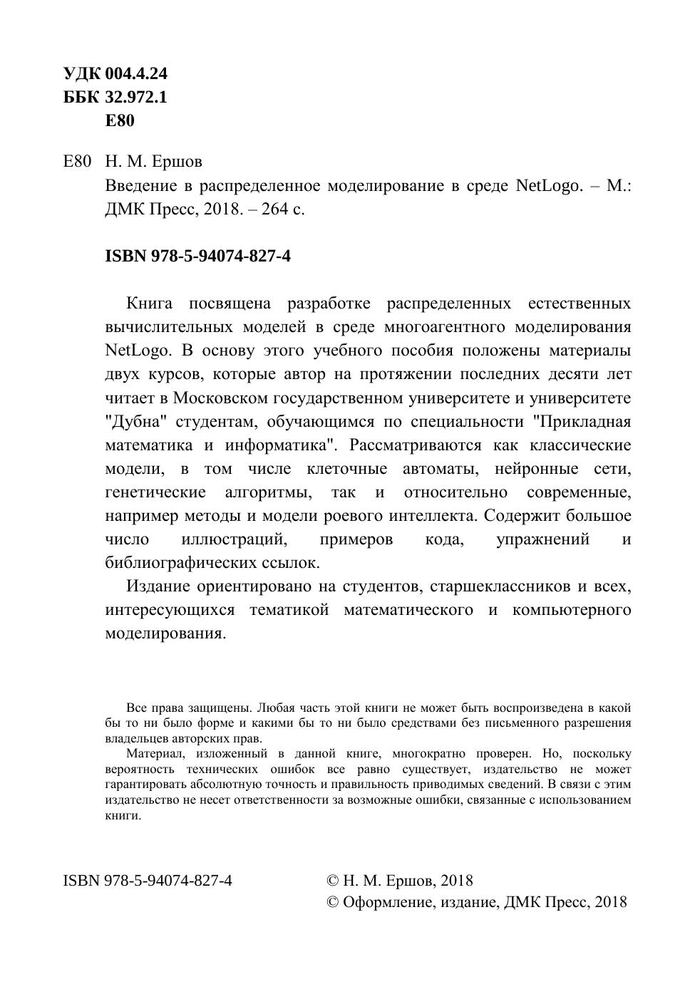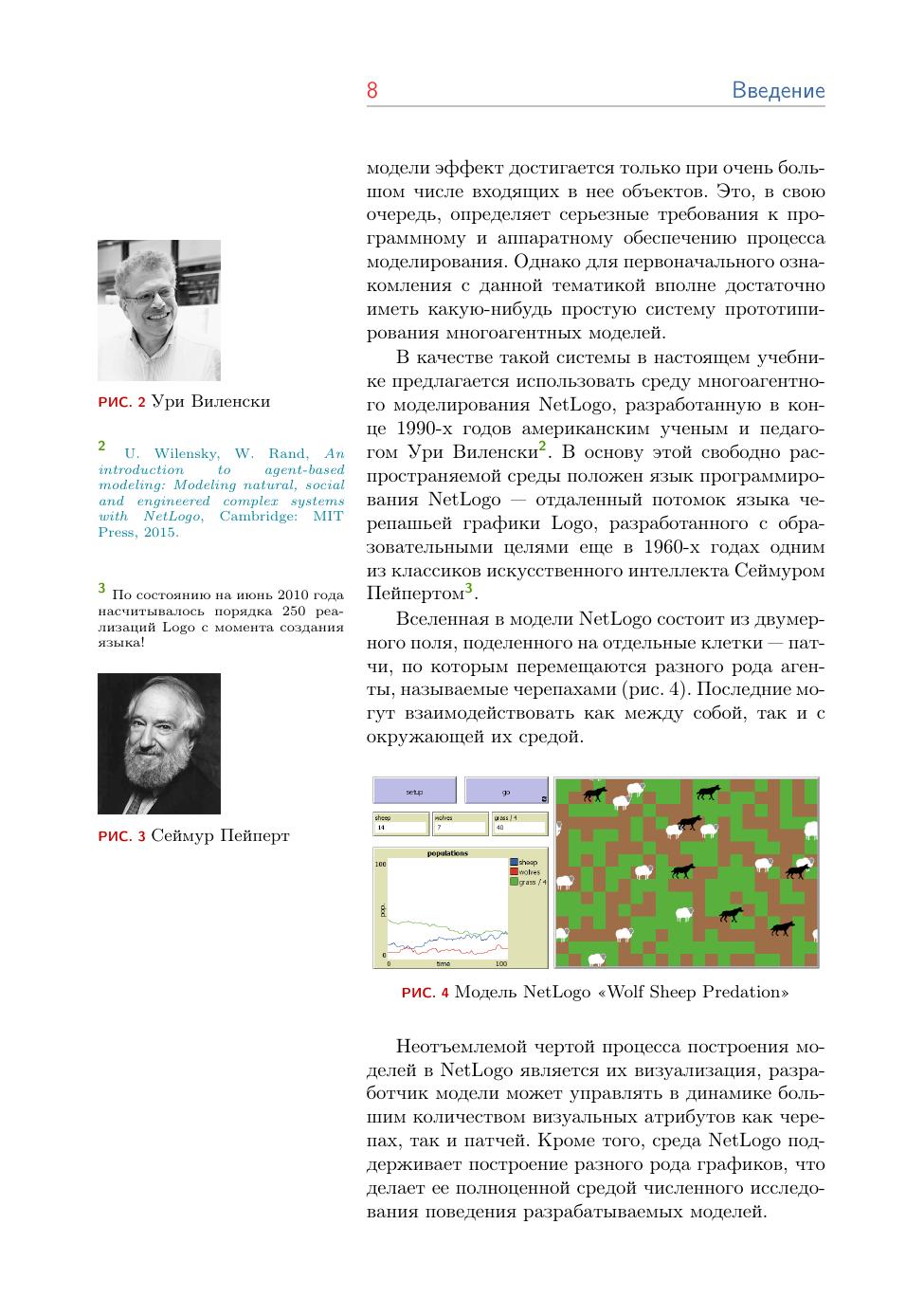 Книга содержит большое число иллюстраций, примеров кода, упражнений, библиографических ссылок и справочного материала по программированию в NetLogo.