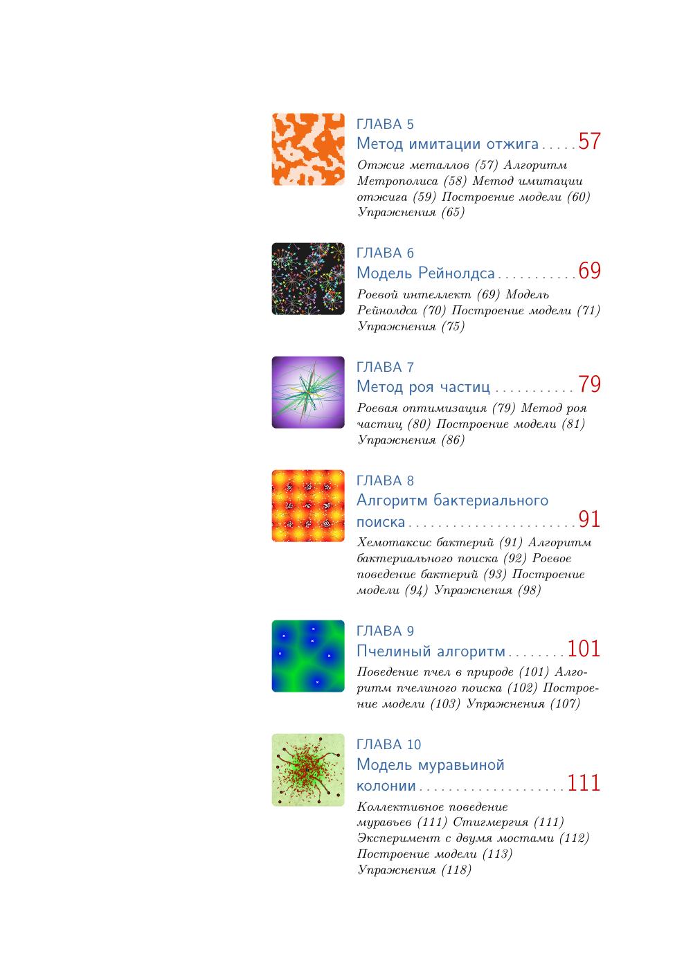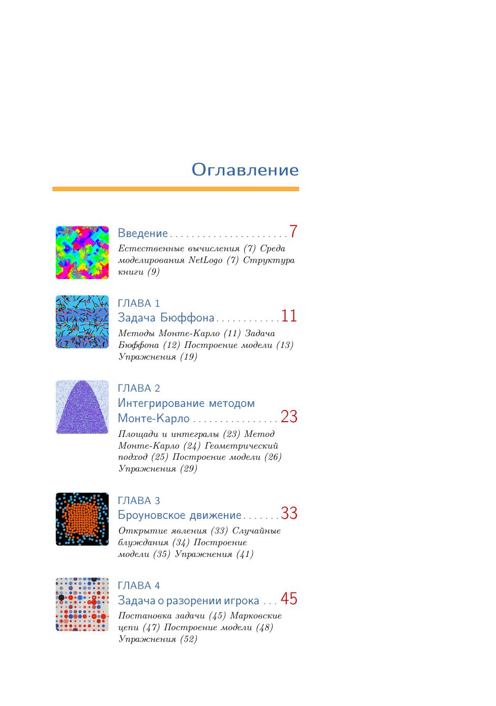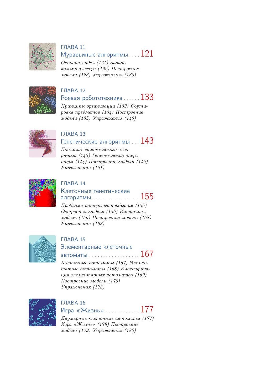 Каждая глава издания посвящена ровно одной модели: сначала рассматривается оригинальная модель, затем подробно описывается процесс ее реализации в среде NetLogo, в конце главы приводится набор упражнений для более глубокого самостоятельного изучения рассмотренной модели или ее вариаций.