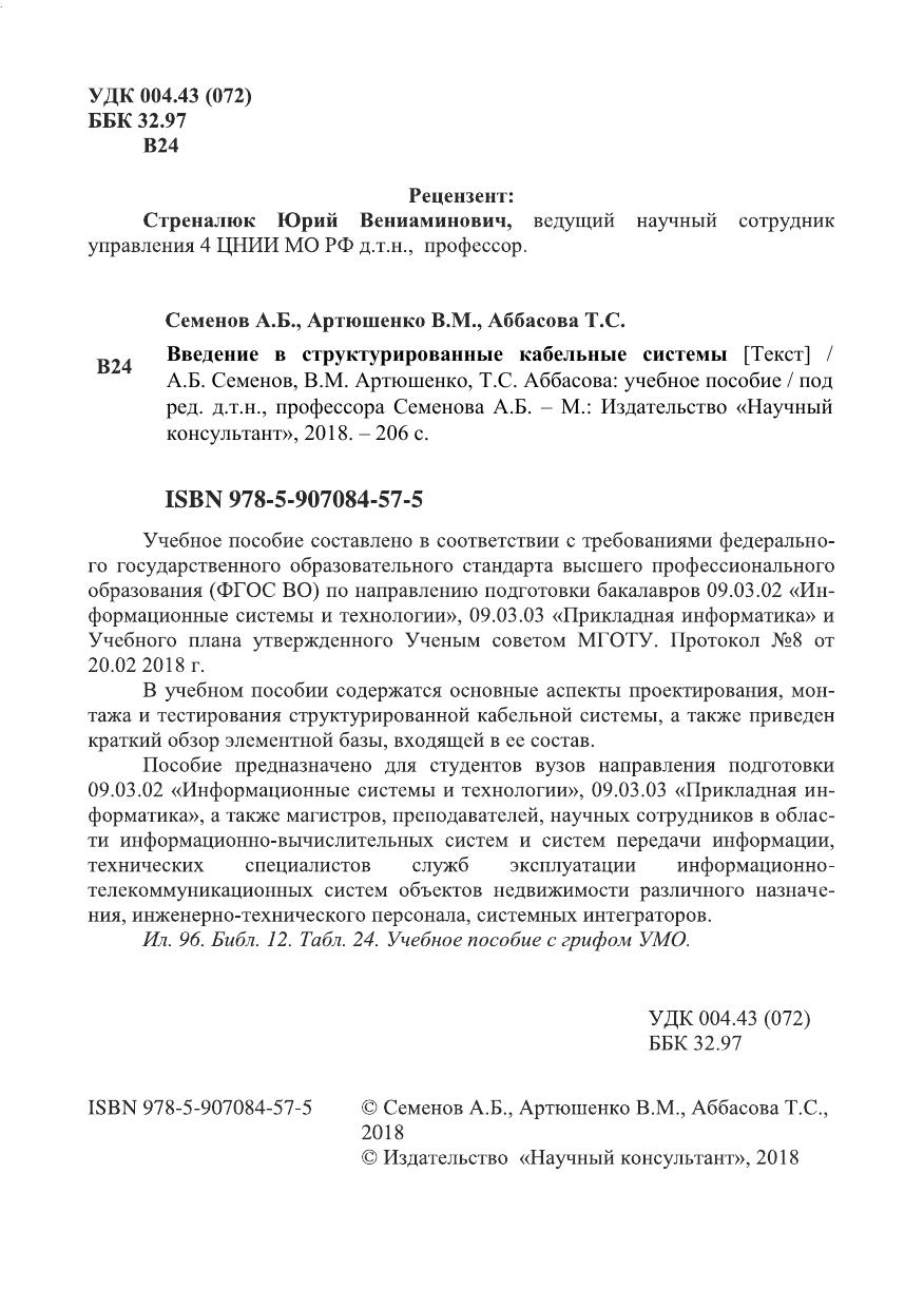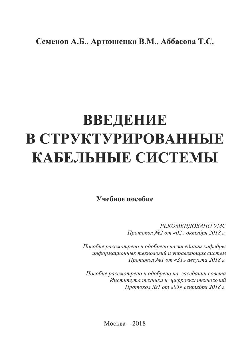 Учебное пособие составлено в соответствии с требованиями федерального государственного образовательного стандарта высшего профессионального образования (ФГОС ВО) по направлению подготовки бакалавров 09.03.02 «Информационные системы и технологии», 09.03.03 «Прикладная информатика» и Учебного плана утвержденного Ученым советом МГОТУ. Протокол №8 от 20.02 2018 г. В учебном пособии содержатся основные аспекты проектирования, монтажа и тестирования структурированной кабельной системы, а также приведен краткий обзор элементной базы, входящей в ее состав. Пособие предназначено для студентов вузов направления подготовки 09.03.02 «Информационные системы и технологии», 09.03.03 «Прикладная информатика», а также магистров, преподавателей, научных сотрудников в области информационно-вычислительных систем и систем передачи информации, технических специалистов служб эксплуатации информационнотелекоммуникационных систем объектов недвижимости различного назначения, инженерно-технического персонала, системных интеграторов. Ил. 96. Библ. 12. Табл. 24. Учебное пособие с грифом УМО.
