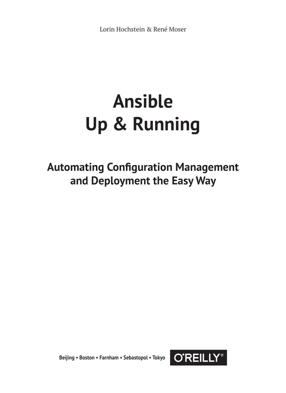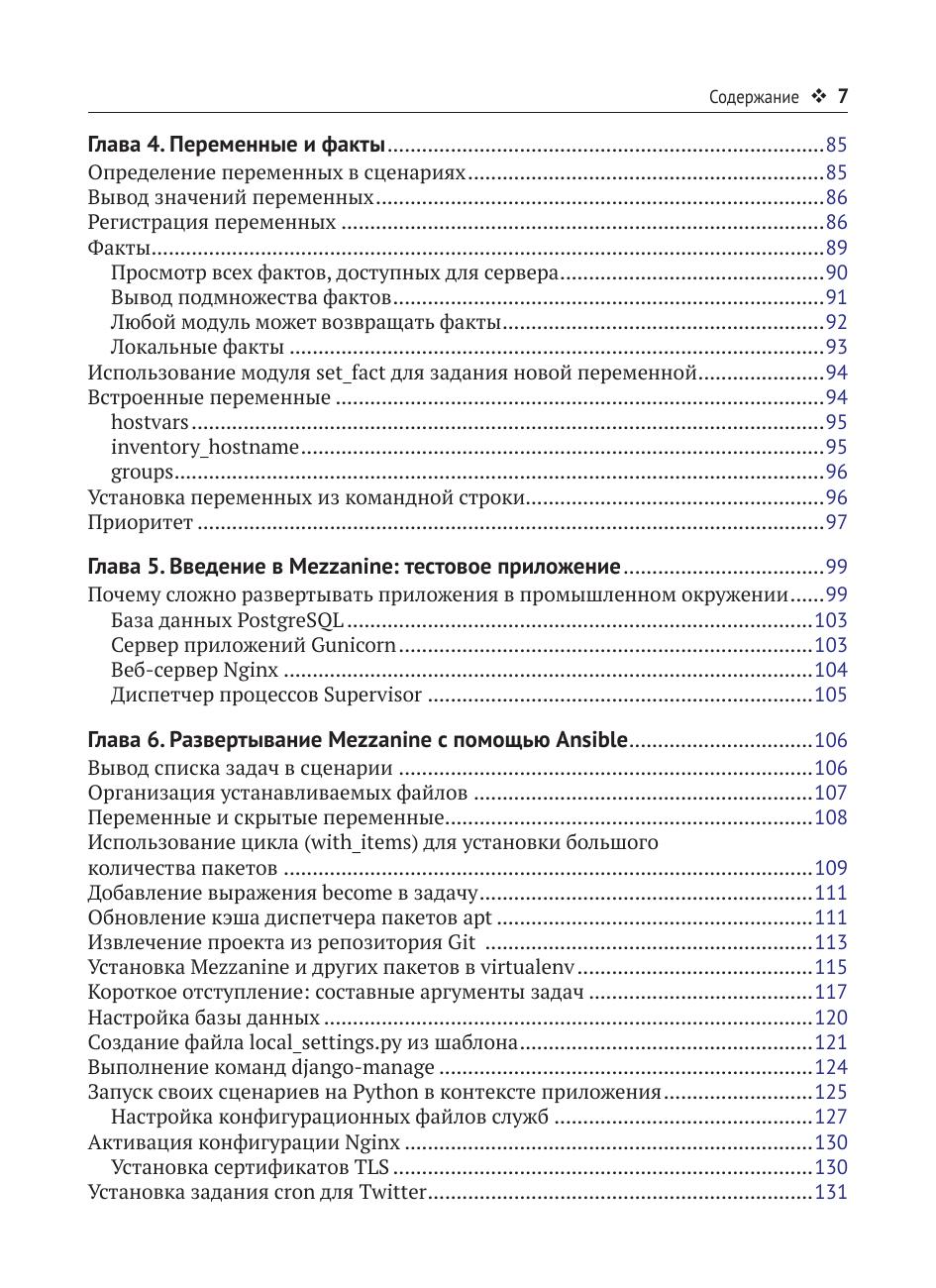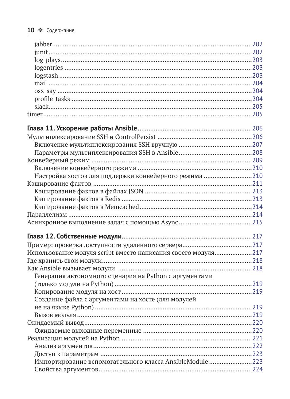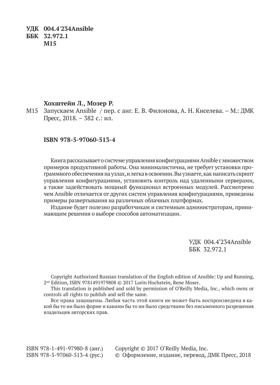 Книга рассказывает о системе управления конфигурациями Ansible с множеством примеров продуктивной работы. Она минималистична, не требует установки программного обеспечения на узлах, и легка в освоении. Вы узнаете, как написать скрипт