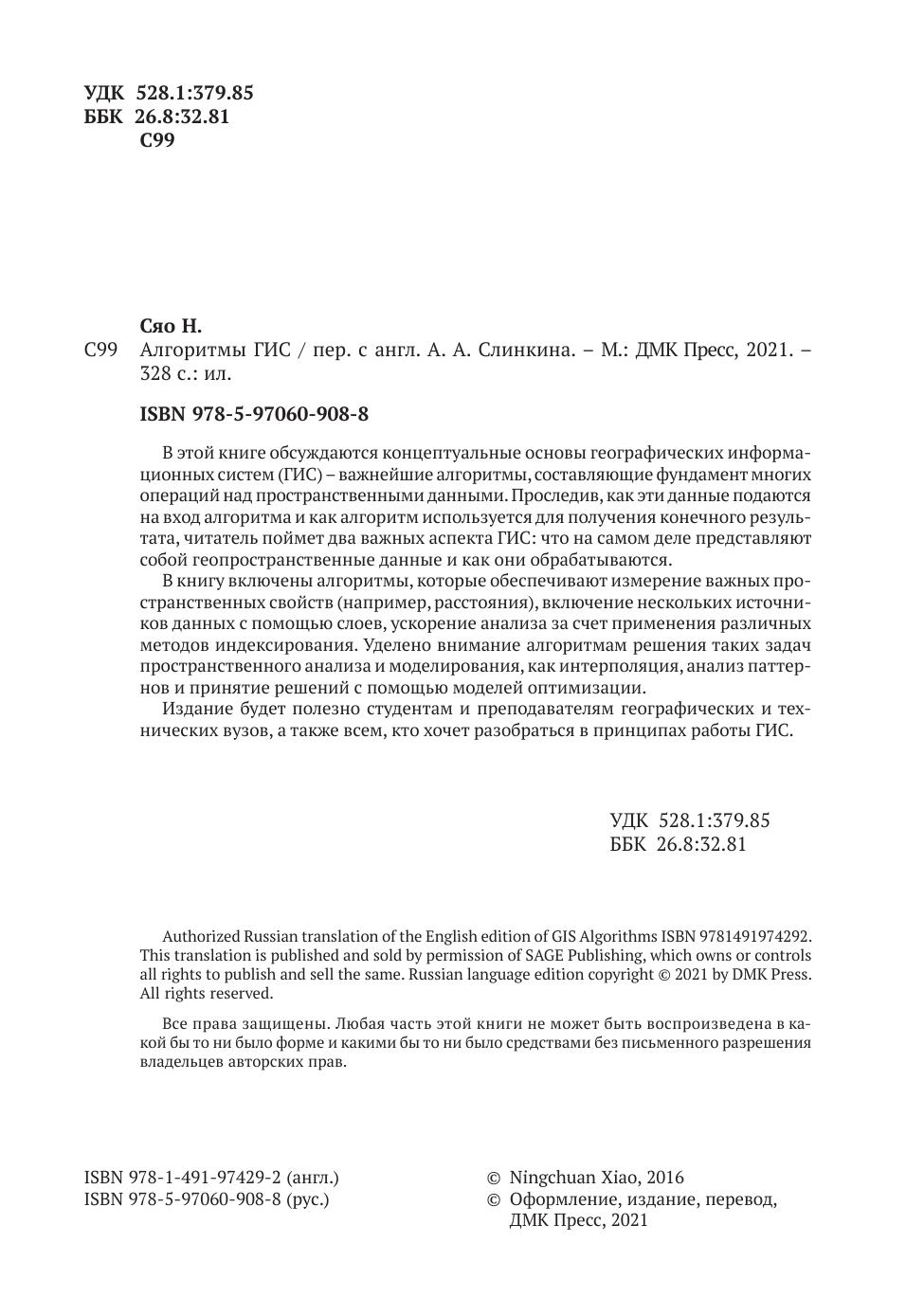 Географические информационные системы (ГИС) приобретают все большее значение, помогая нам понять сложную социальную, экономическую и природную динамику в ситуациях, где ключевую роль играют пространственные компоненты. Однако фундаментальные алгоритмы, применяемые в ГИС, трудны для понимания и преподавания, отчасти из-за отсутствия логически последовательного изложения. Настоящая книга – попытка решить эту проблему за счет сочетания строгого формализованного языка с практическими примерами и упражнениями.