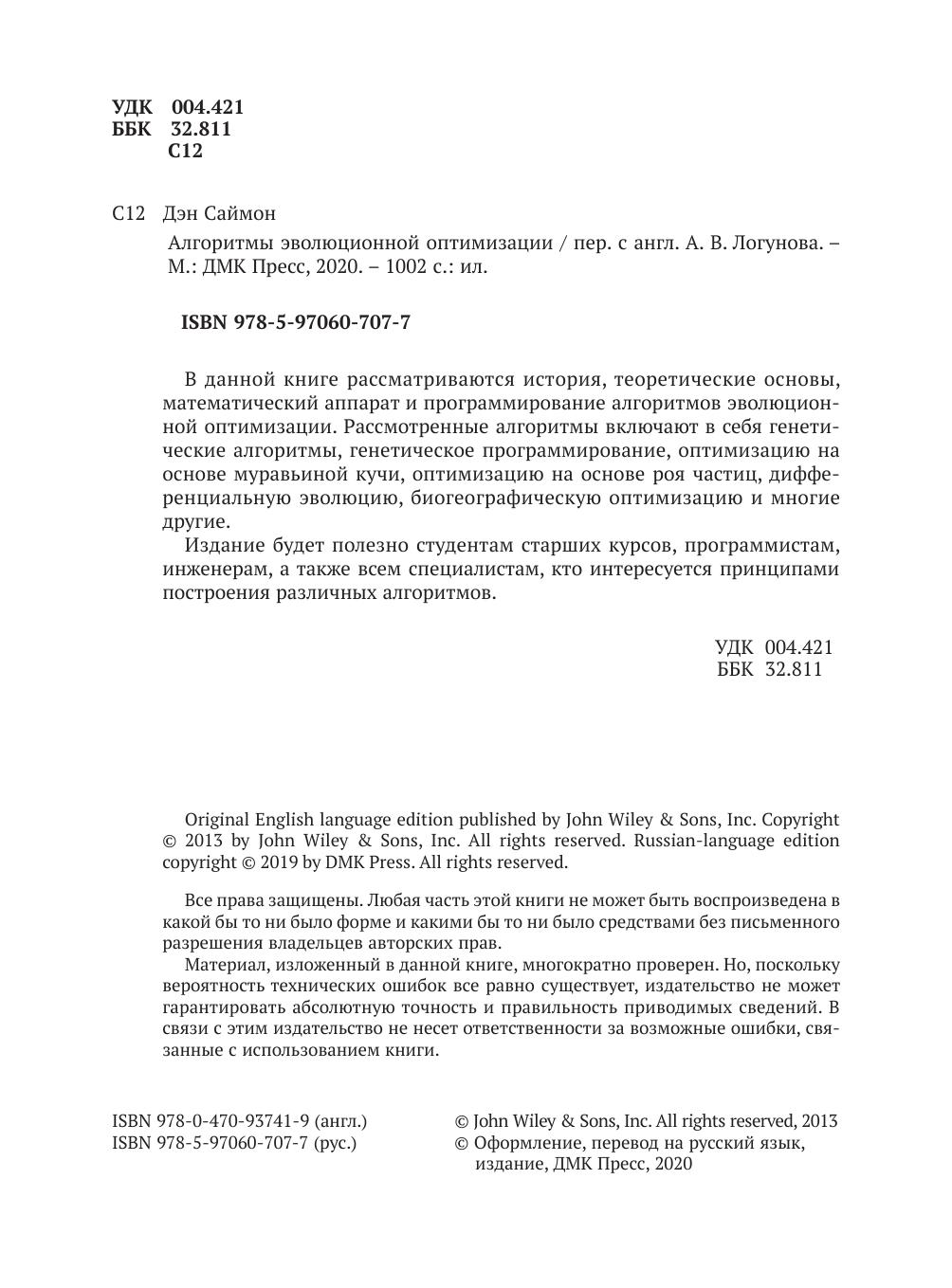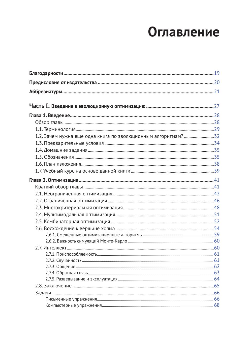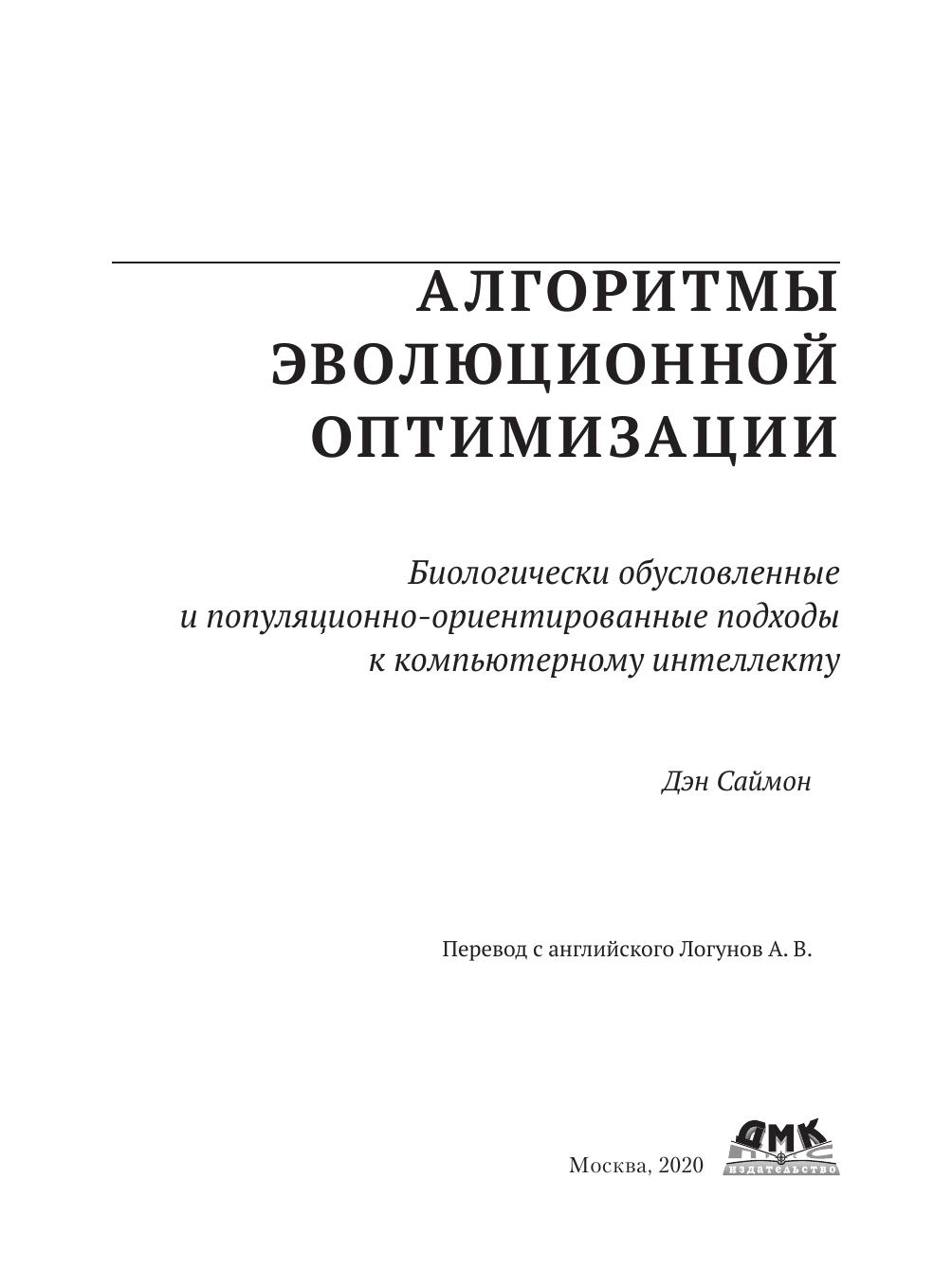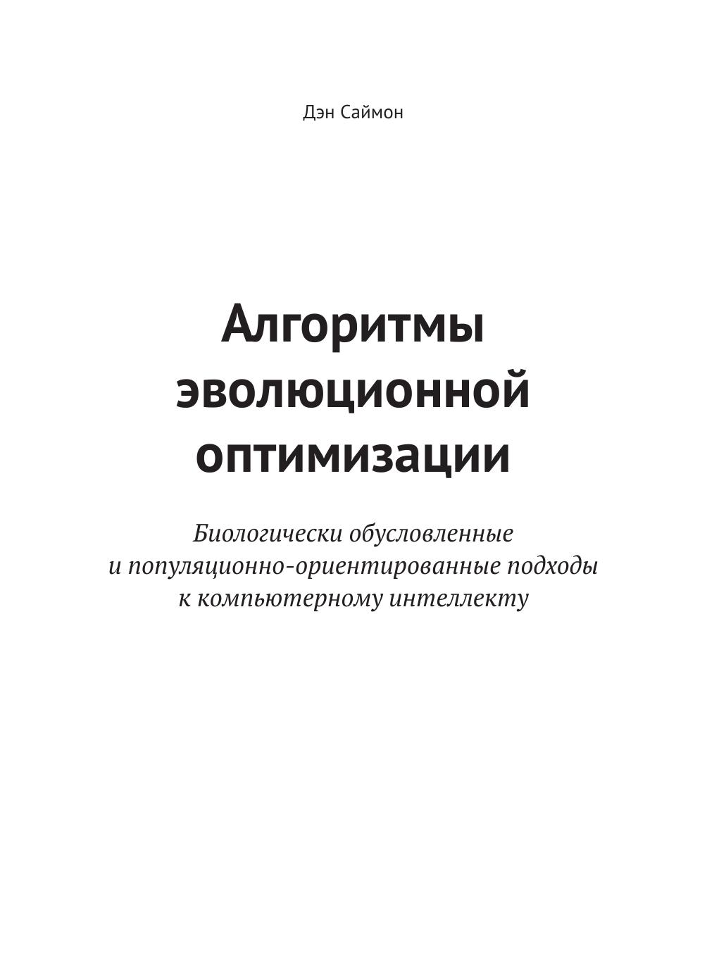 В данной книге рассматриваются история, теоретические основы, математический аппарат и программирование алгоритмов эволюционной оптимизации. Рассмотренные алгоритмы включают в себя генетические алгоритмы, генетическое программирование, оптимизацию на основе муравьиной кучи, оптимизацию на основе роя частиц, дифференциальную эволюцию, биогеографическую оптимизацию и многие другие.