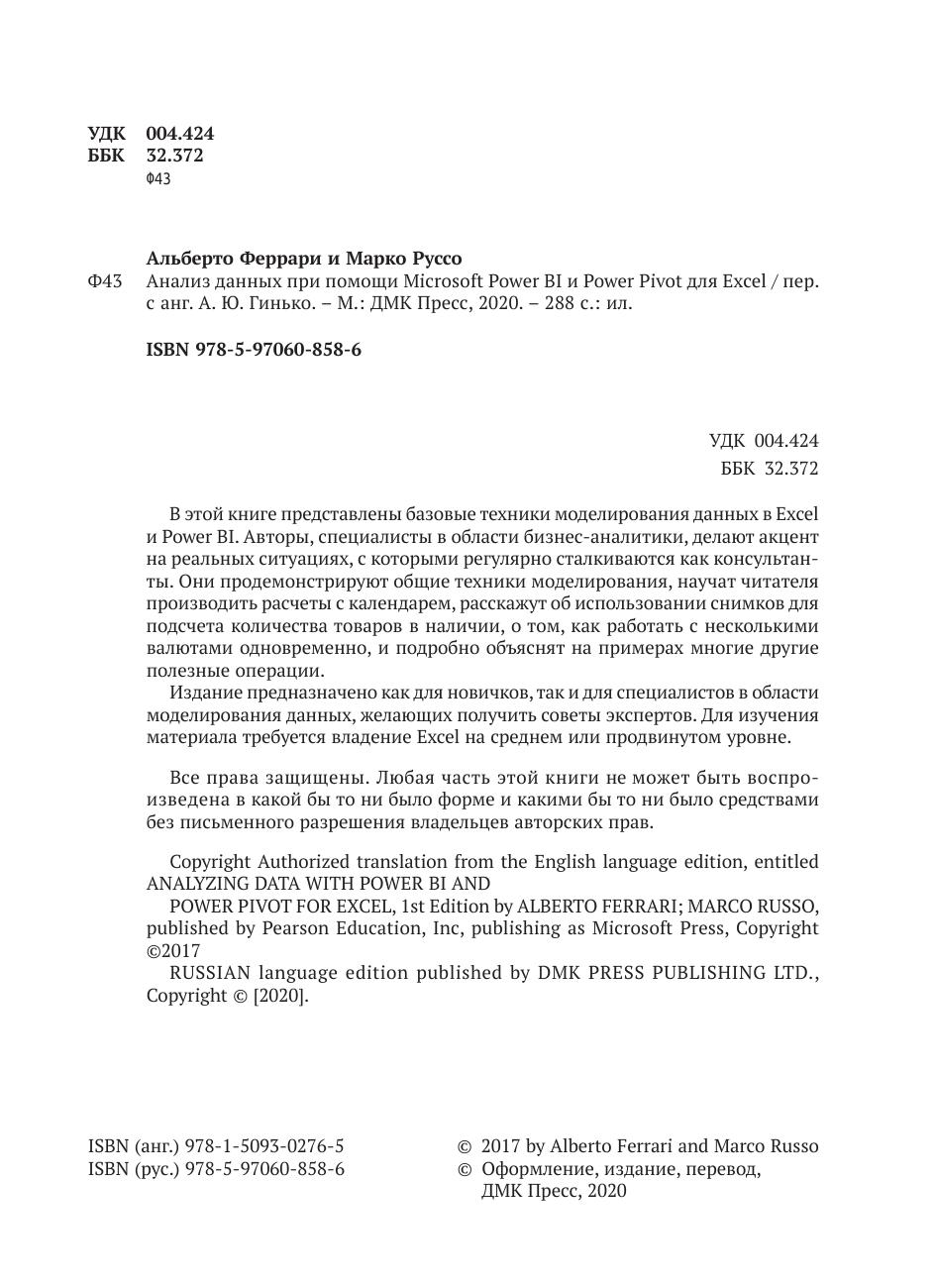 Если вы хотите использовать Power BI или Excel для анализа данных, реальные примеры из этой книги позволят вам иначе посмотреть на свои отчеты. С правильно спроектированной моделью данных ответы на все вопросы будут предельно простыми!