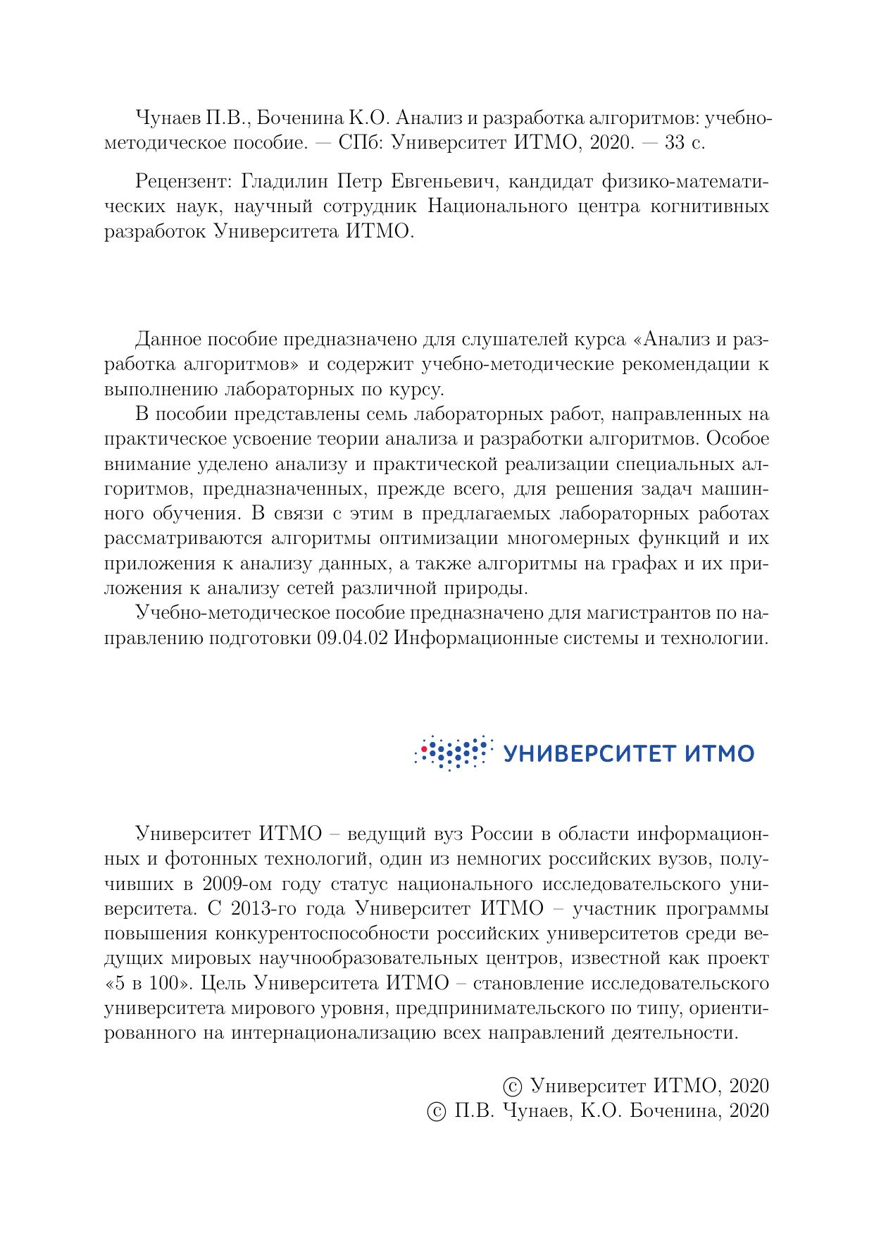 Данное пособие предназначено для слушателей курса "Анализ и разработка алгоритмов" и содержит учебно-методические рекомендации к выполнению лабораторных и практических работ по курсу. В пособии представлены семь лабораторных работ, направленных на практическое усвоение теории анализа и разработки алгоритмов. Особое внимание уделено анализу и практической реализации специальных алгоритмов, предназначенных прежде всего для решения задач машинного обучения. В связи с этим в предлагаемых лабораторных работах рассматривются алгоритмы оптимизации многомерных функций и их приложения к анализу данных, а также алгоритмы на графах и их приложения к анализу сетей различной природы. Учебно-методическое пособие предназначено для магистрантов по направлению подготовки 09.04.02 Информационные системы и технологии.