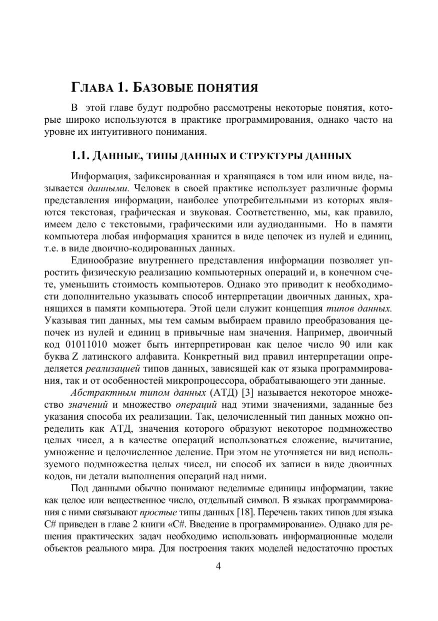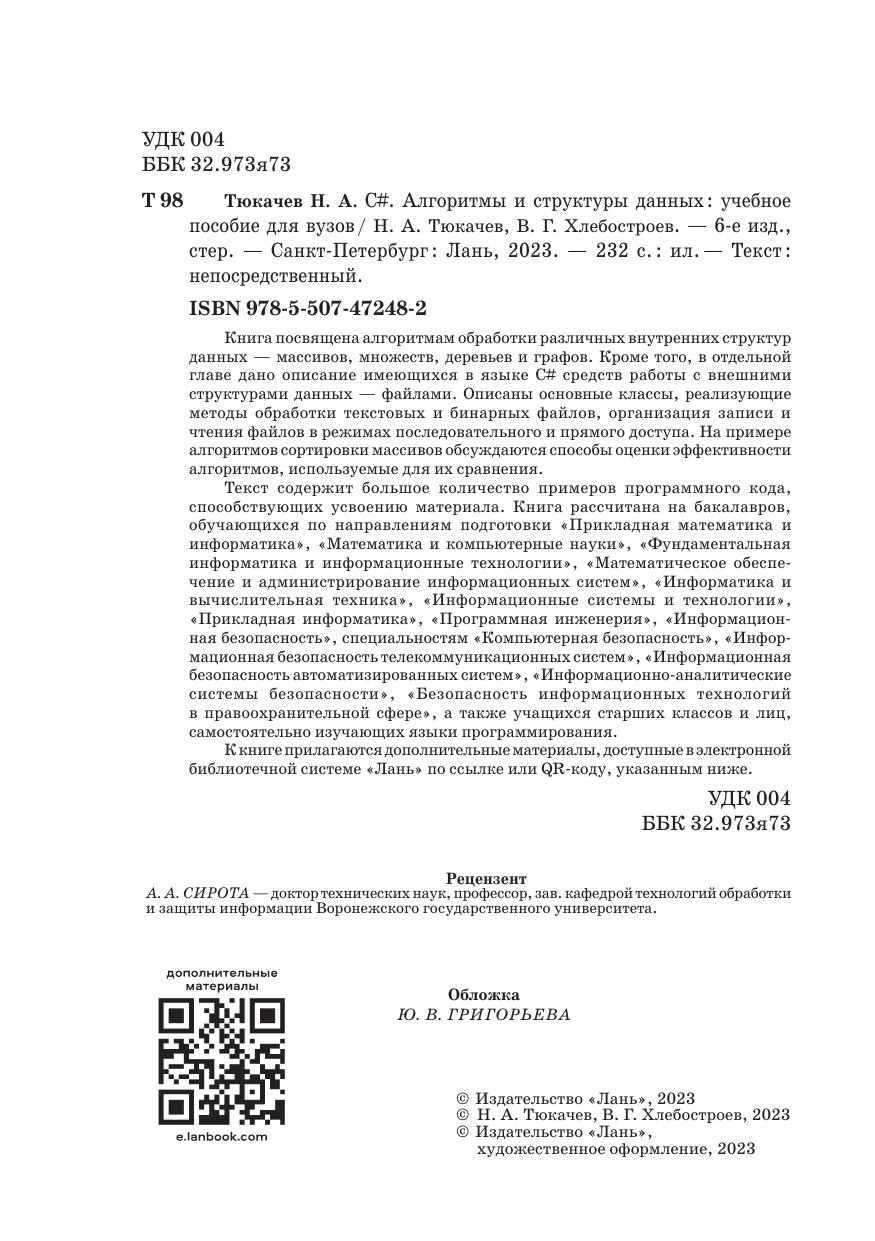 Книга посвящена алгоритмам обработки различных внутренних структур данных — массивов, множеств, деревьев и графов. Кроме того, в отдельной главе дано описание имеющихся в языке C# средств работы с внешними структурами данных — файлами. Описаны основные классы, реализующие методы обработки текстовых и бинарных файлов, организация записи и чтения файлов в режимах последовательного и прямого доступа. На примере алгоритмов сортировки массивов обсуждаются способы оценки эффективности алгоритмов, используемые для их сравнения. Текст содержит большое количество примеров программного кода, способствующих усвоению материала. Книга рассчитана на бакалавров, обучающихся по направлениям подготовки «Прикладная математика и информатика», «Математика и компьютерные науки», «Фундаментальная информатика и информационные технологии», «Математическое обеспечение и администрирование информационных систем», «Информатика и вычислительная техника», «Информационные системы и технологии», «Прикладная информатика», «Программная инженерия», «Информационная безопасность», специальностям «Компьютерная безопасность», «Информационная безопасность телекоммуникационных систем», «Информационная безопасность автоматизированных систем», «Информационно-аналитические системы безопасности», «Безопасность информационных технологий в правоохранительной сфере», а также учащихся старших классов и лиц, самостоятельно изучающих языки программирования.