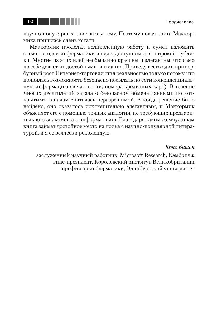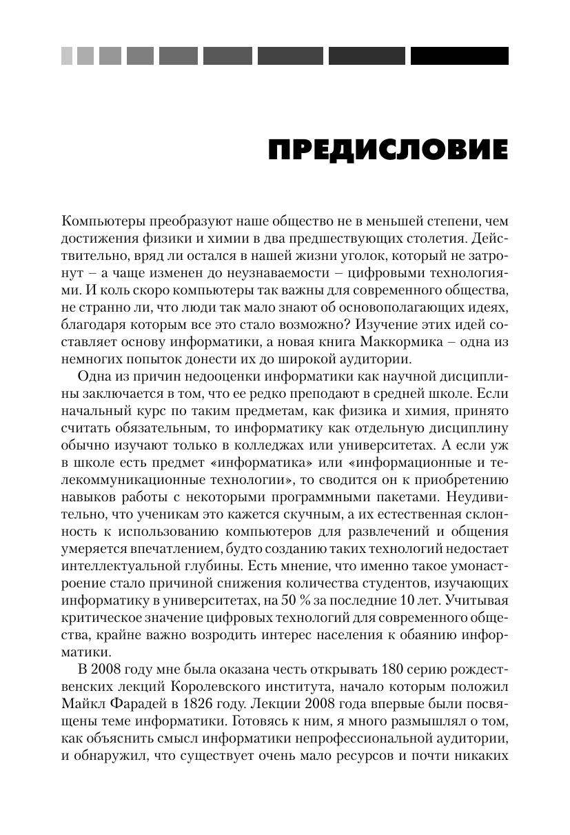 Ежедневно мы используем впечатляющие технологические достижения, даже не задумываясь об этом. Мы передаем по сети гигабайты информации, просматриваем тысячи документов в поисках необходимого, совершаем покупки в интернет-магазинах. Мы архивируем объемные материалы, так чтобы их можно было отправить по электронной почте, и пользуемся искусственным интеллектом компьютеров, которые автоматически исправляют опечатки в тексте, ретушируют фотографии и делают за нас многое другое... Все это при нынешнем уровне развития технологий воспринимается как должное. Но ведь такие «чудеса» были бы невозможны без величайших идей информатики, родившихся в XX веке! Эта книга – о том, как эти идеи зародились и как воплощались в жизнь. Издание рассчитано на широкую аудиторию. Предварительного знакомства с информатикой от читателей не требуется.