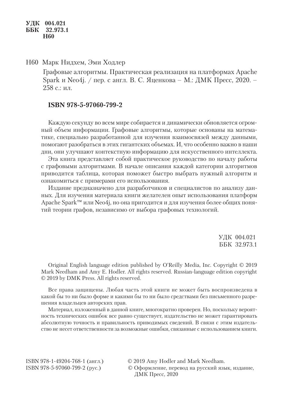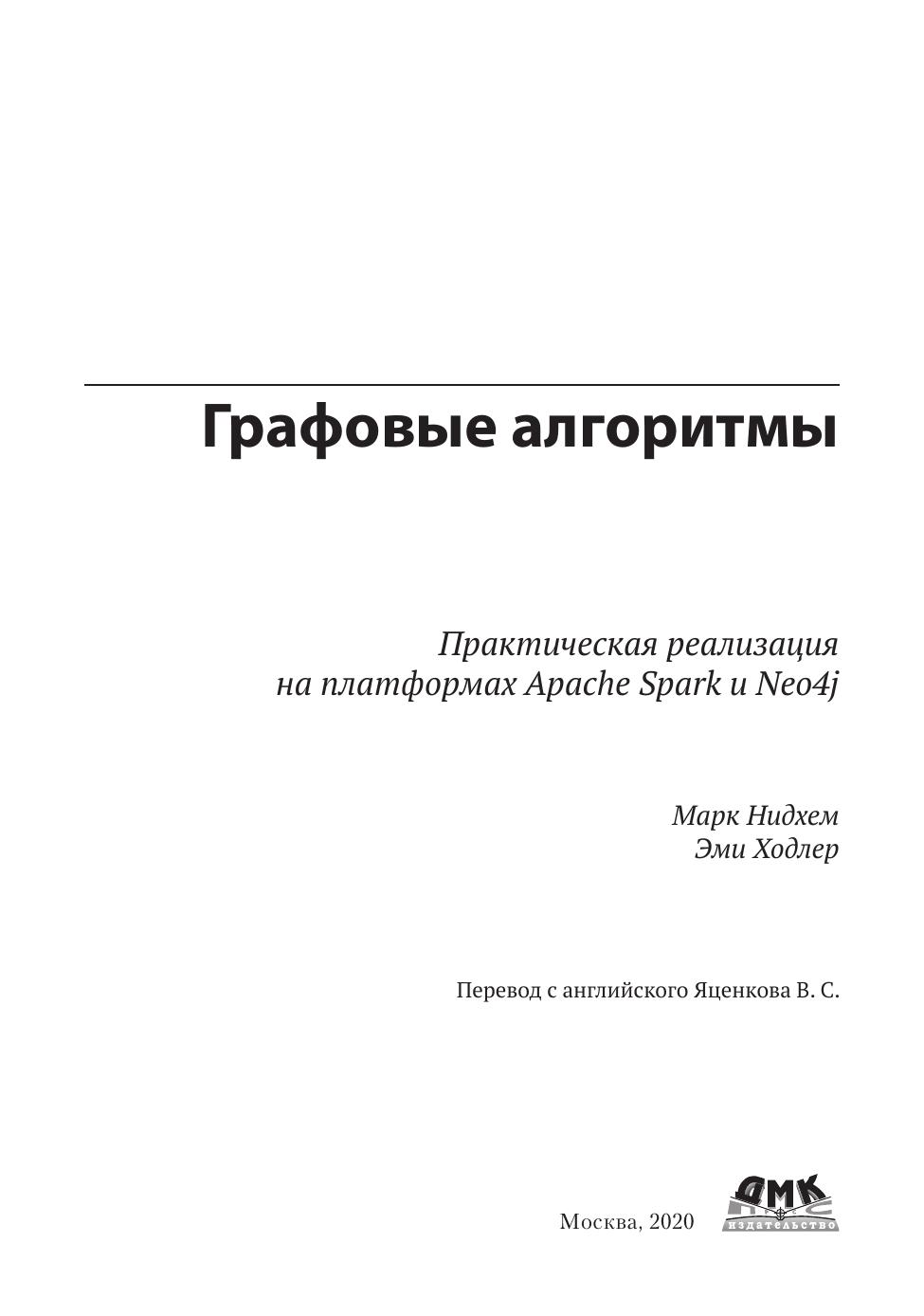 Издание предназначено для разработчиков и специалистов по анализу данных. Для изучения материала книги желателен опыт использования платформ Apache Spark™ или Neo4j, но она пригодится и для изучения более общих понятий теории графов, независимо от выбора графовых технологий.