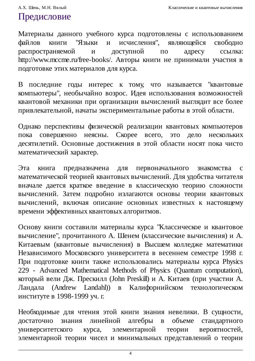 Этот курс предназначен для первоначального знакомства с новой быстро развивающейся и популярной областью исследований - теорией квантовых вычислений. Вначале приводится краткое введение в классическую теорию сложности вычислений. Затем подробно излагаются основы теории квантовых вычислений, включая описание основных известных к настоящему времени эффективных квантовых алгоритмов.