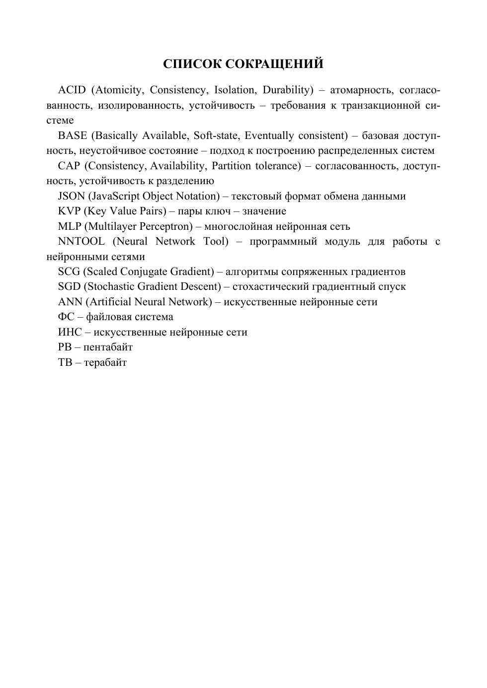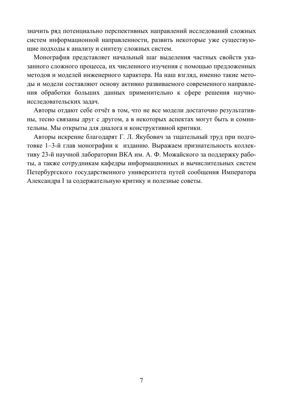 Создание, накопление, обработка и использование информации в мире составляет мощную информационную среду. Она занимает ведущее значение в различных областях человеческой деятельности. Монография представляет начальный шаг выделения частных свойств указанного сложного процесса, их численного изучения с помощью предложенных методов и моделей инженерного характера. На наш взгляд, именно такие методы и модели составляют основу обработки больших данных в сфере решения научно-исследовательских задач. Рассматриваются и усовершенствуются классические методы и модели исследования сложных систем, основные законы (Меткалфа, Амдала, Густавсона–Барсиса, Гроша) взаимодействия сетевых структур, модели и методы оценивания их эффективности и качества, а также модели и методы исследования сложных систем с нечеткими параметрами. Рассматриваются современные инструментальные средства и технологии интеллектуальной обработки больших данных. Представлены оригинальные результаты, касающиеся решения задач: информационного взаимодействия, контроля состояния, оценивания надежности и предсказания событий для сложных систем, оценивания эффективности, качества и производительности сетевых структур, а также оценивания и обеспечения их надежности, расчета функций принадлежности с нечётким аргументом и коэффициентом, решения нечётких нелинейных уравнений, поиска условного экстремума при нечётком ограничении, решения дифференциальных уравнений с нечёткими коэффициентами. Дан вариант обработки больших данных на основе совместного использования инструментальной системы Hadoop под управлением Windows и сверточной нейронной сети при решении задачи распознавания рукописных цифр. Обучение нейронной сети проводится на основе набора данных MNIST образцов написания рукописных цифр. Построение сверточной нейронной сети производится с помощью системы Neural Network Toolboox. Рекомендуется преподавателям и научным сотрудникам, а также магистрантам и аспирантам и при исследовании сложных систем и технологий обработки больших данных.