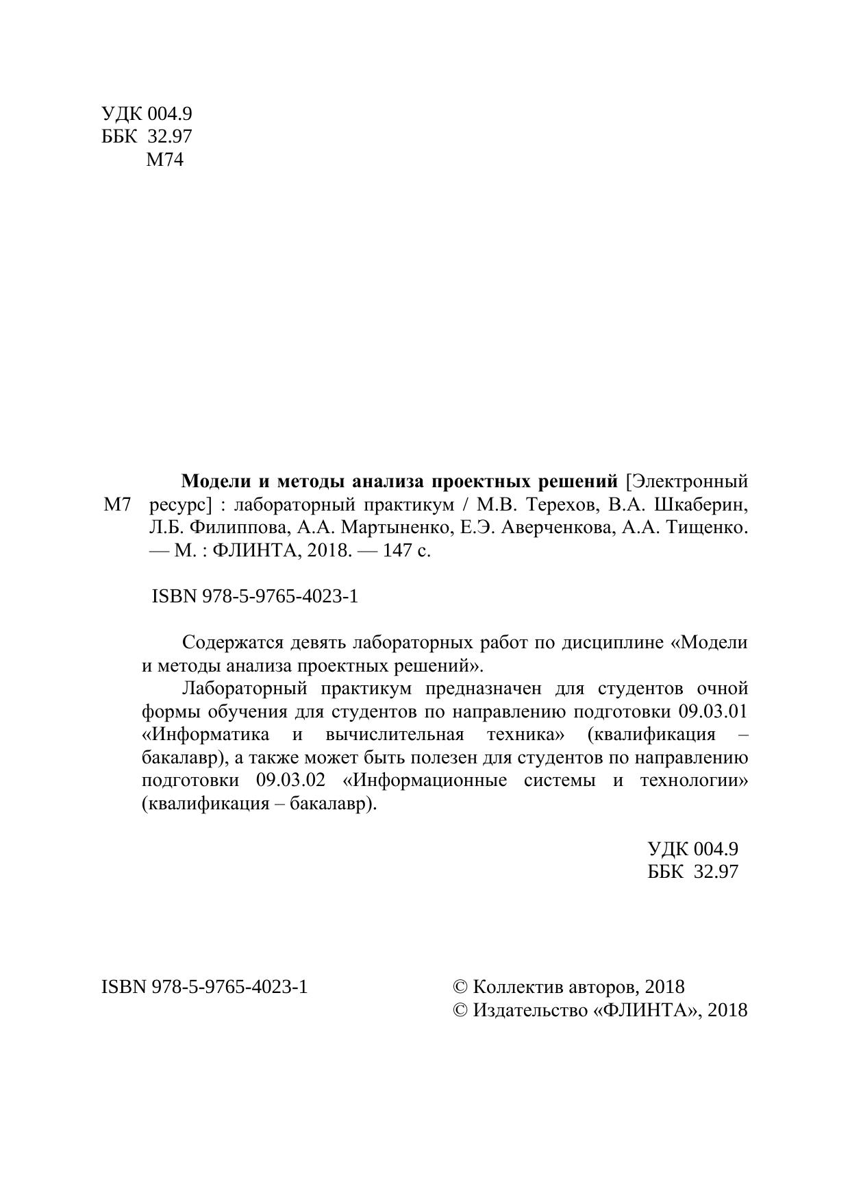 Содержатся девять лабораторных работ по дисциплине «Модели и методы анализа проектных решений». Лабораторный практикум предназначен для студентов очной формы обучения для студентов по направлению подготовки 09.03.01