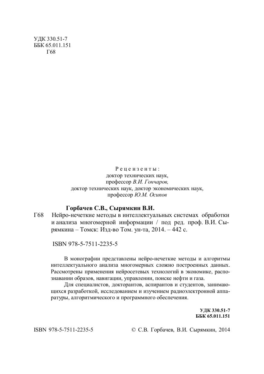 В монографии представлены нейро-нечеткие методы и алгоритмы интеллектуального анализа многомерных сложно построенных данных. Рассмотрены применения нейросетевых технологий в экономике, распознавании образов, навигации, управлении, поиске нефти и газа. Для специалистов, докторантов, аспирантов и студентов, занимающихся разработкой, исследованием и изучением радиоэлектронной аппаратуры, алгоритмического и программного обеспечения