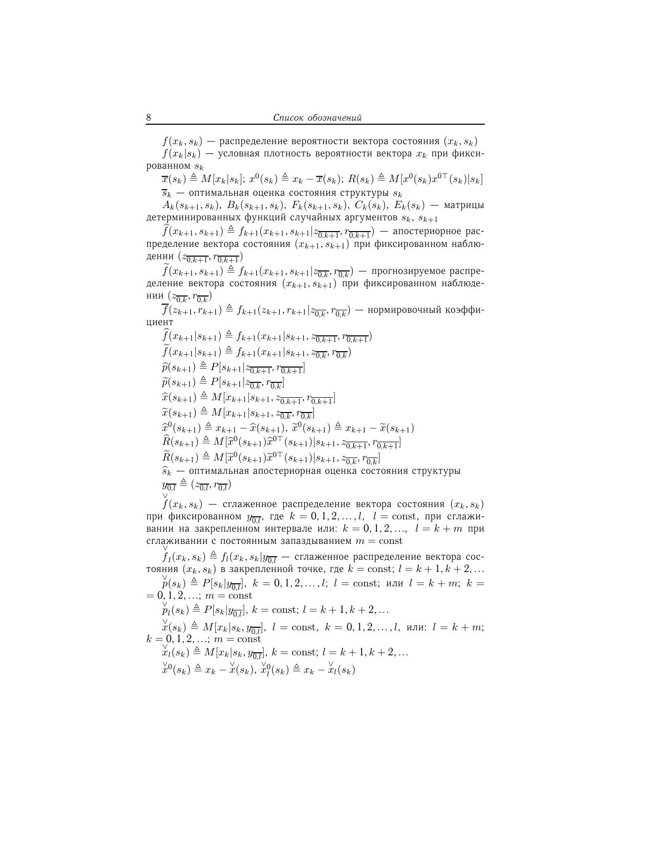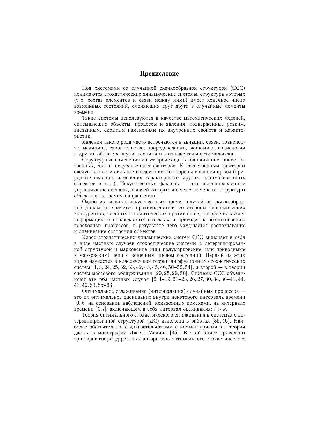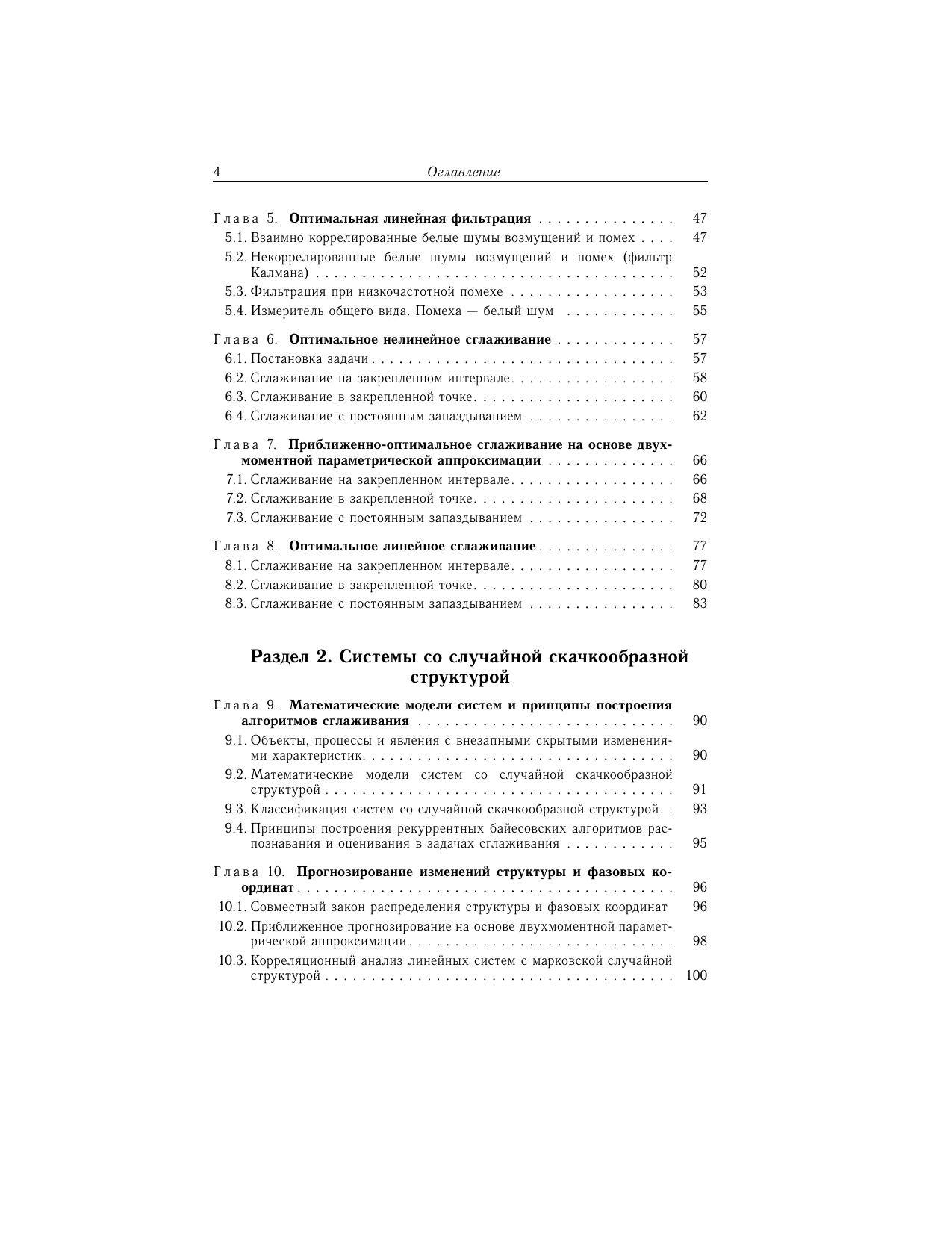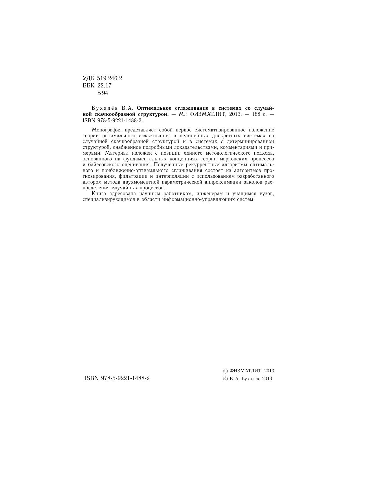 Монография представляет собой первое систематизированное изложение теории оптимального сглаживания в нелинейных дискретных системах со случайной скачкообразной структурой и в системах с детерминированной структурой, снабженное подробными доказательствами, комментариями и примерами. Материал изложен с позиции единого методологического подхода, основанного на фундаментальных концепциях теории марковских процессов и байесовского оценивания. Полученные рекуррентные алгоритмы оптимального и приближенно-оптимального сглаживания состоят из алгоритмов прогнозирования, фильтрации и интерполяции с использованием разработанного автором метода двухмоментной параметрической аппроксимации законов распределения случайных процессов. Книга адресована научным работникам, инженерам и учащимся вузов, специализирующимся в области информационно-управляющих систем.