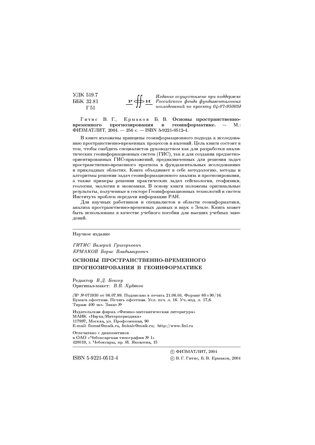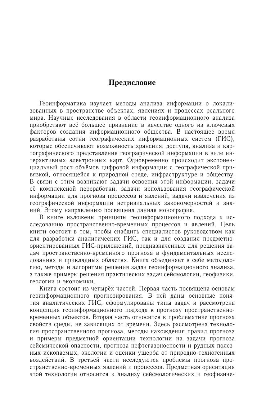 В книге изложены принципы геоинформационного подхода к исследованию пространственно-временных процессов и явлений. Цель книги состоит в том, чтобы снабдить специалистов руководством как для разработки аналитических геоинформационных систем (ГИС), так и для создания предметно-ориентированных ГИС-приложений, предназначенных для решения задач пространственно-временного прогноза в фундаментальных исследованиях и прикладных областях. Книга объединяет в себе методологию, методы и алгоритмы решения задач геоинформационного анализа и прогнозирования, а также примеры решения практических задач сейсмологии, геофизики, геологии, экологии и экономики. В основу книги положены оригинальные результаты, полученные в секторе Геоинформационных технологий и систем Института проблем передачи информации РАН. Для научных работников и специалистов в области геоинформатики, анализа пространственно-временных данных и наук о Земле. Книга может быть использована в качестве учебного пособия для высших учебных заведений