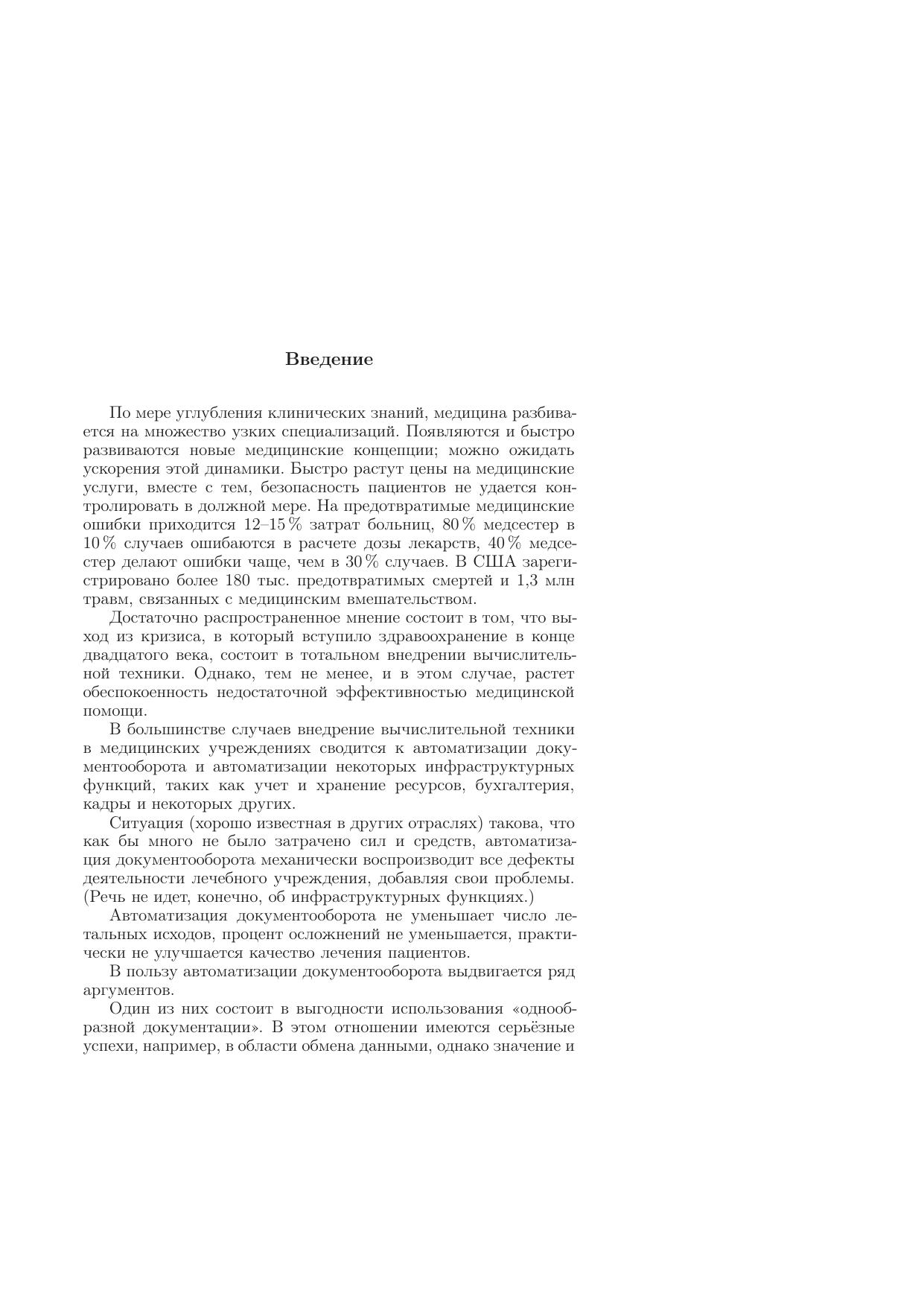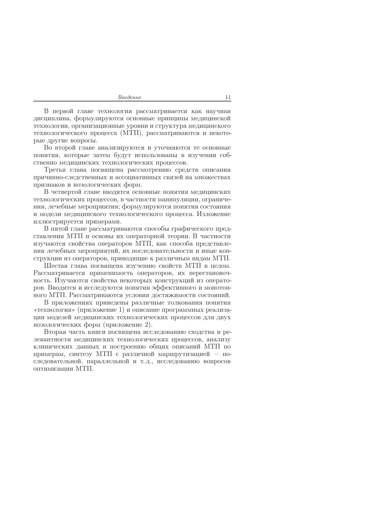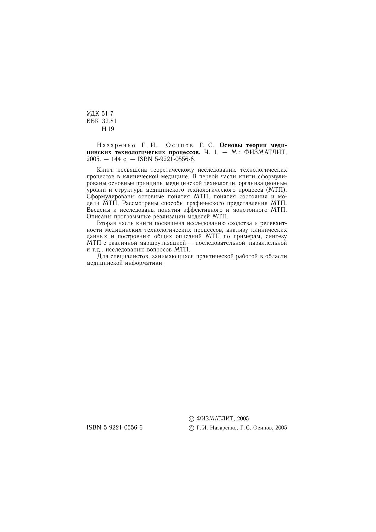 Книга посвящена теоретическому исследованию технологических процессов в клинической медицине. В первой части книги сформулированы основные принципы медицинской технологии, организационные уровни и структура медицинского технологического процесса (МТП). Сформулированы основные понятия МТП, понятия состояния и модели МТП. Рассмотрены способы графического представления МТП. Введены и исследованы понятия эффективного и монотонного МТП. Описаны программные реализации моделей МТП. Вторая часть книги посвящена исследованию сходства и релевантности медицинских технологических процессов, анализу клинических данных и построению общих описаний МТП по примерам, синтезуМТП с различной маршрутизацией — последовательной, параллельной и т.д., исследованию вопросов МТП. Для специалистов, занимающихся практической работой в области медицинской информатики.