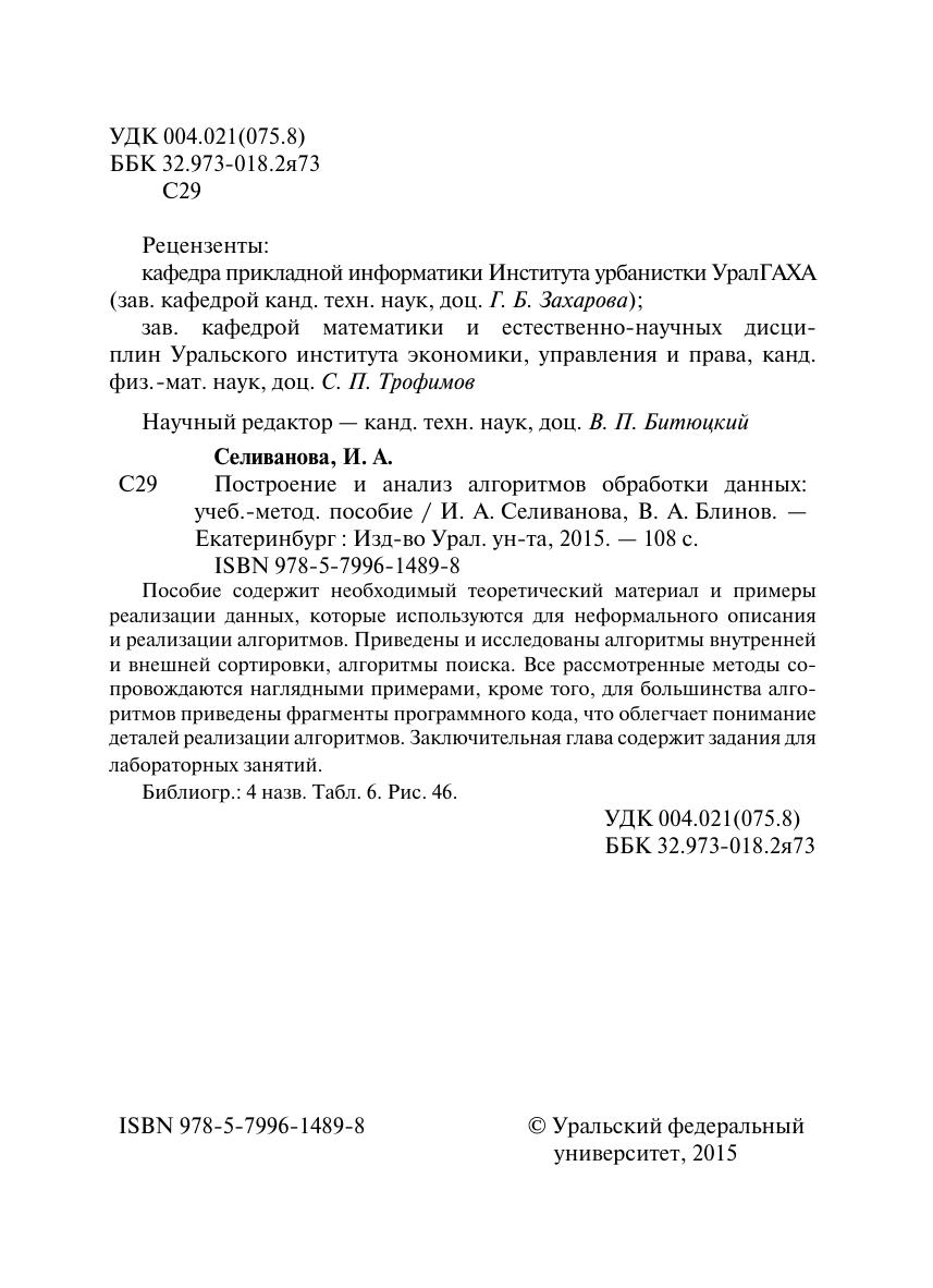 Пособие содержит необходимый теоретический материал и примеры реализации данных, которые используются для неформального описания и реализации алгоритмов. Приведены и исследованы алгоритмы внутренней и внешней сортировки, алгоритмы поиска. Все рассмотренные методы сопровождаются наглядными примерами, кроме того, для большинства алгоритмов приведены фрагменты программного кода, что облегчает понимание деталей реализации алгоритмов. Заключительная глава содержит задания для лабораторных занятий.