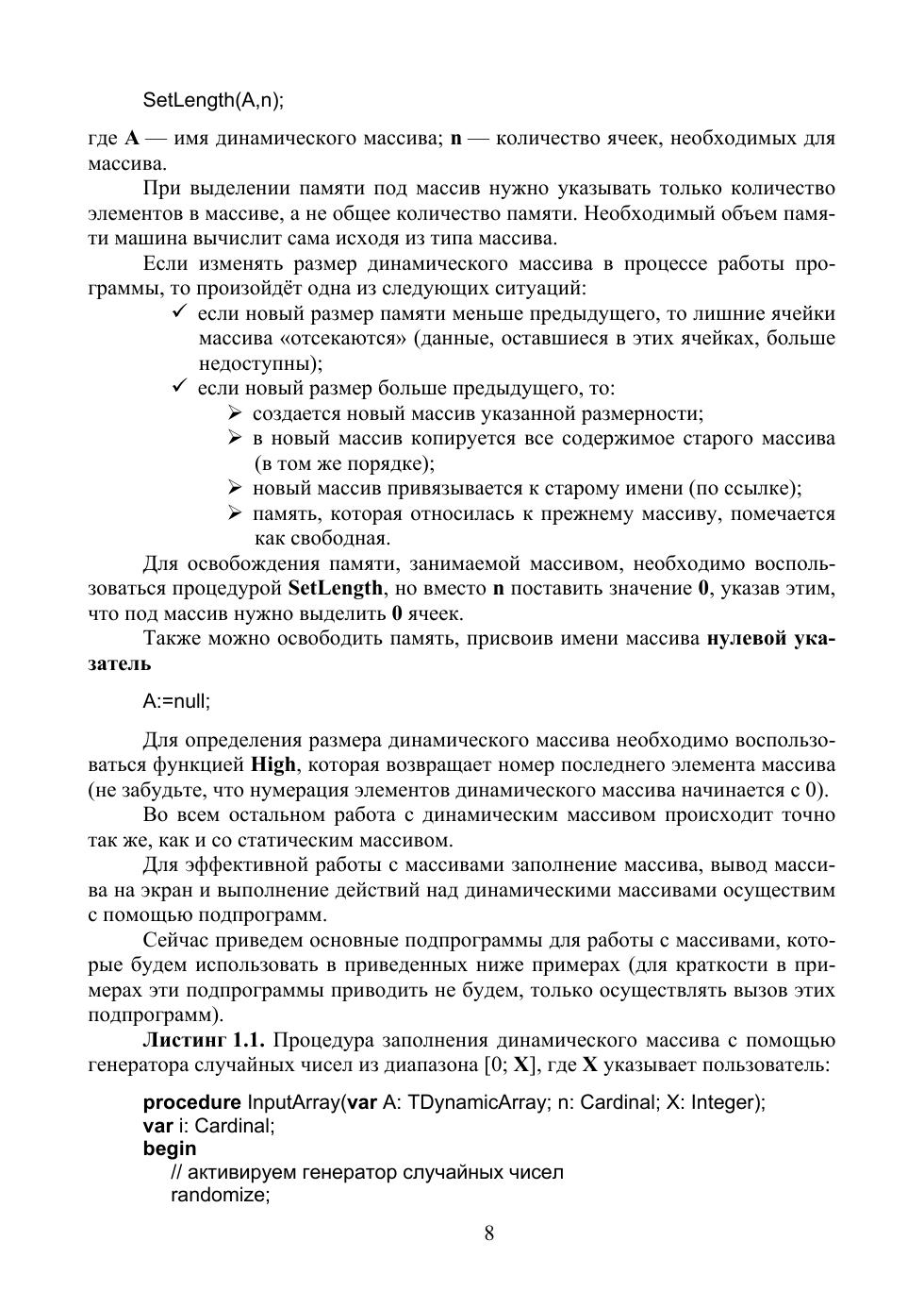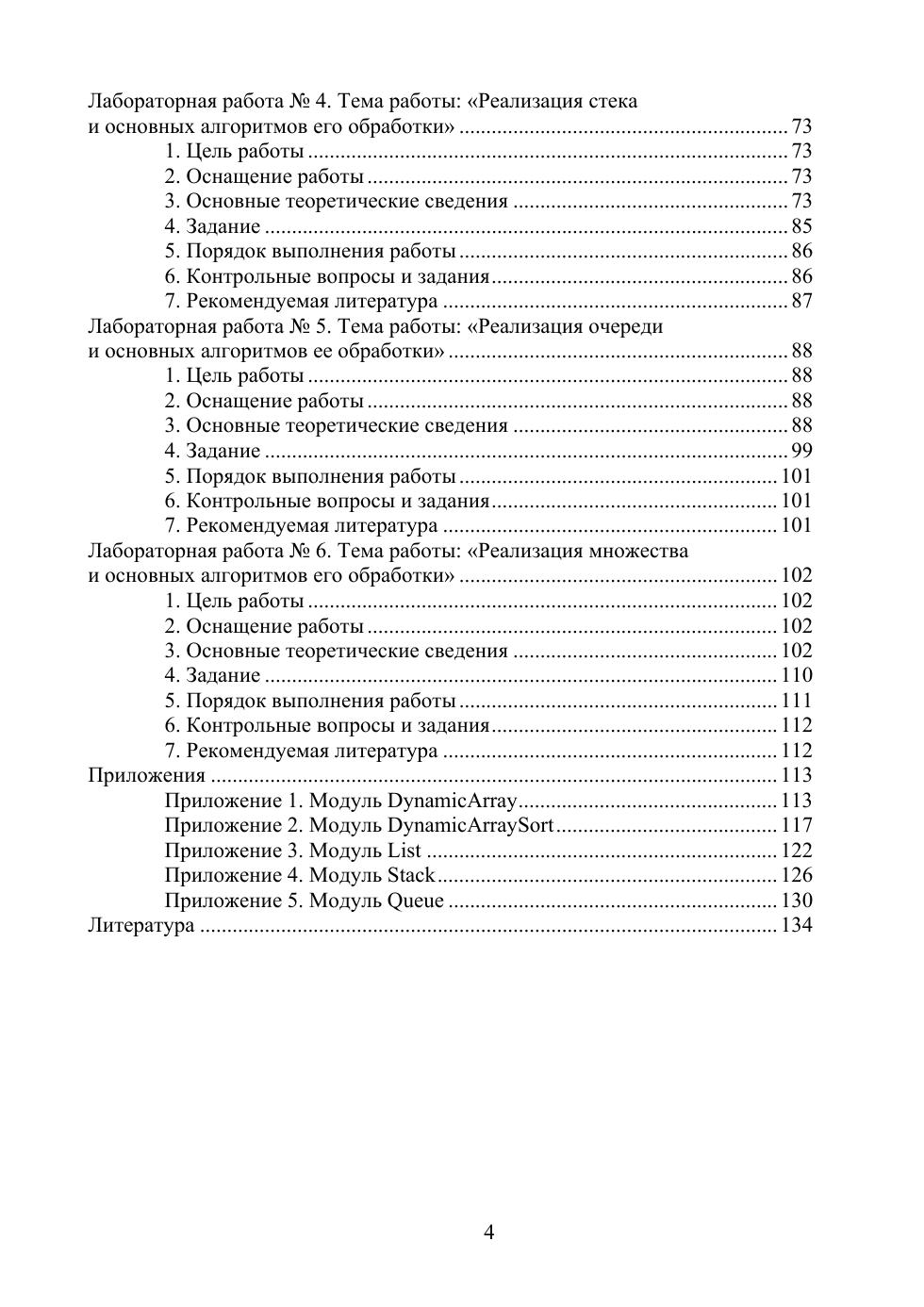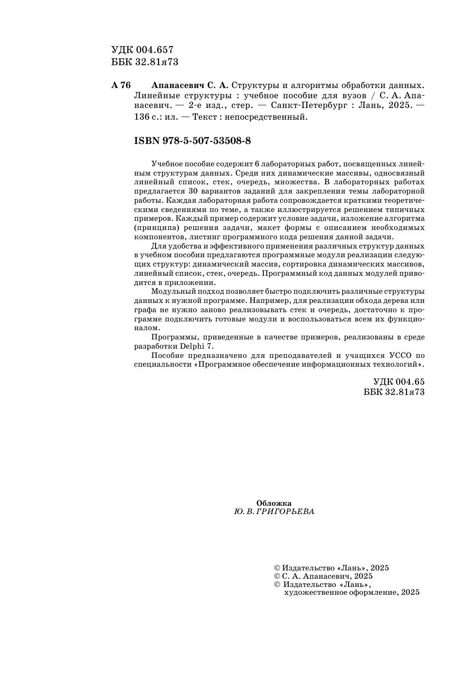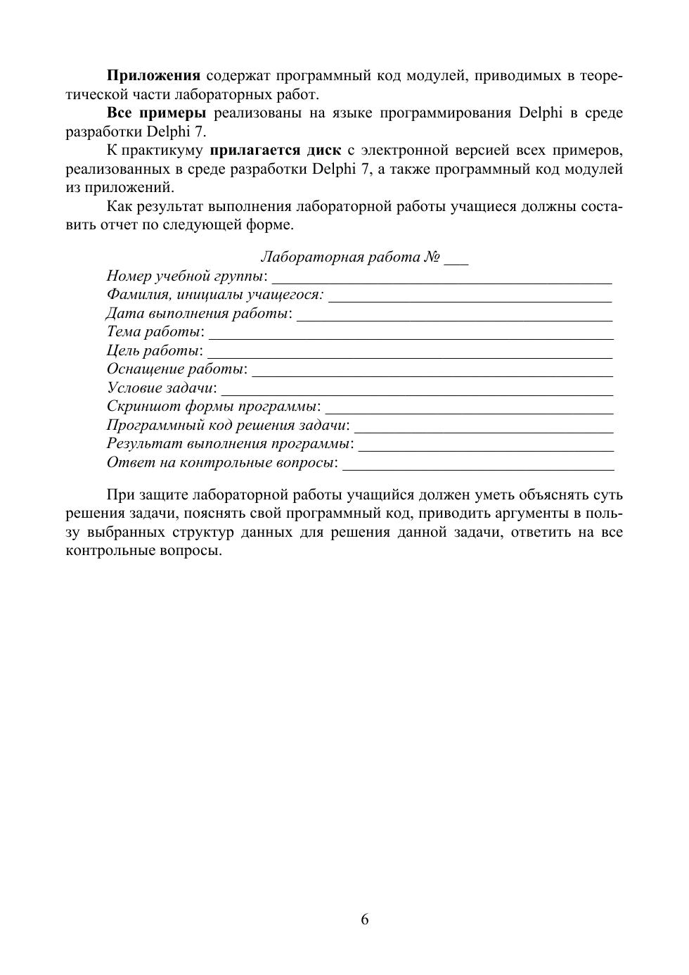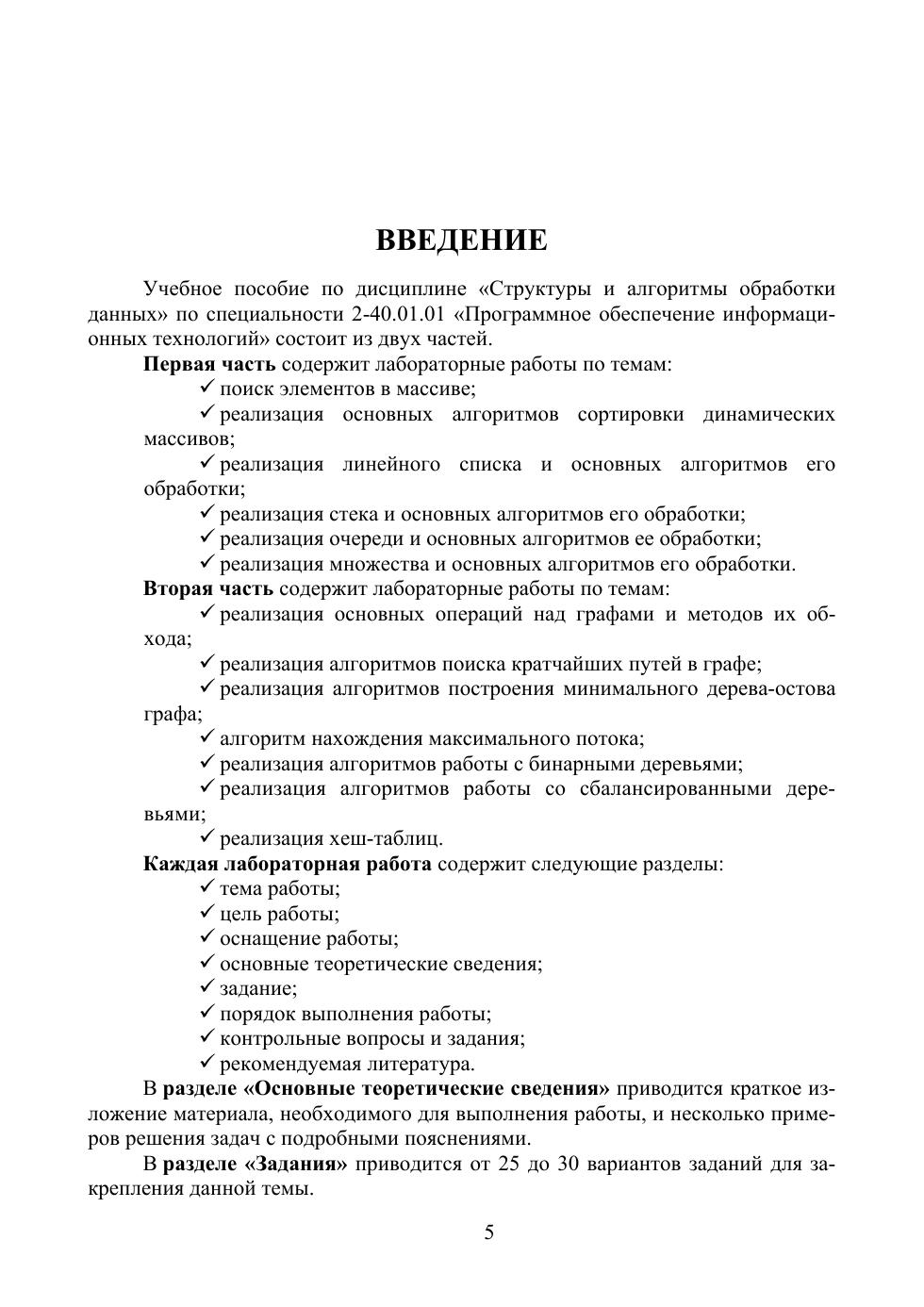Учебное пособие содержит 6 лабораторных работ, посвященных линейным структурам данных. Среди них динамические массивы, односвязный линейный список, стек, очередь, множества. В лабораторных работах предлагается 30 вариантов заданий для закрепления темы лабораторной работы. Каждая лабораторная работа сопровождается краткими теоритическими сведениями по теме, а также иллюстрируется решением типичных примеров. Каждый пример содержит условие задачи, изложение алгоритма (принципа) решения задачи, макет формы с описанием необходимых компонентов, листинг программного кода решения данной задачи. Для удобства и эффективного применения различных структур данных в учебном пособии предлагаются программные модули реализации следующих структур: динамический массив, сортировка динамических массивов, линейный список, стек, очередь. Программный код данных модулей приводится в приложении. Модульный подход позволяет быстро подключить различные структуры данных к нужной программе. Например, для реализации обхода дерева или графа не нужно заново реализовывать стек и очередь, достаточно к программе подключить готовые модули и воспользоваться всем их функционалом. Программы, приведенные в качестве примеров, реализованы в среде разработки Delphi 7. Пособие предназначено для преподавателей и учащихся УССО по специальности «Программное обеспечение информационных технологий».