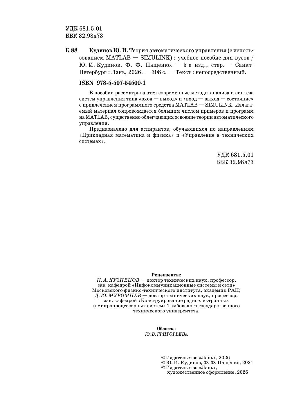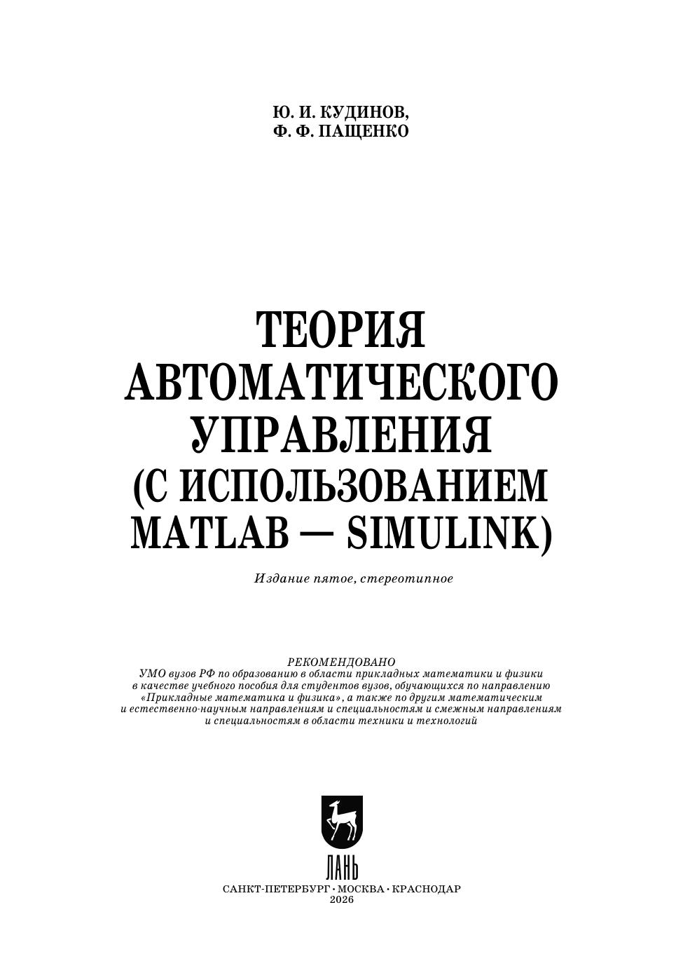 В пособии рассматриваются современные методы анализа и синтеза систем управления типа «вход — выход» и «вход — выход — состояние» с привлечением программного средства MATLAB – SIMULINK. Излагаемый материал сопровождается большим числом примеров и программ на MATLAB, существенно облегчающих освоение теории автоматического управления.Предназначено для бакалавров, магистров и аспирантов, обучающихся по направлениям «Прикладная математика и физика» и «Управление в технических системах».