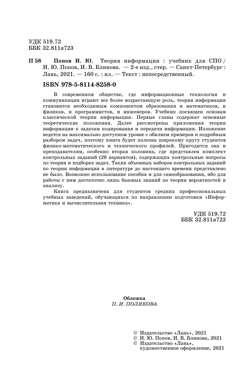 В современном обществе, где информационные технологии и коммуникации играют все более возрастающую роль, теория информации становится необходимым компонентом образования и математиков, и физиков, и программистов, и инженеров. Учебник посвящен основам классической теории информации. Первые главы содержат основные теоретические положения. Далее рассмотрены приложения теории информации к задачам кодирования и передачи информации. Изложение ведется на максимально доступном уровне с обилием примеров и подробным разбором задач, поэтому книга будет полезна широкому кругу студентов физико-математического и технического профилей. Пригодится она и преподавателям, особенно вторая половина, где представлен комплект контрольных заданий (20 вариантов), содержащих контрольные вопросы по теории и подборке задач. Таких объемных наборов контрольных заданий по теории информации в литературе до настоящего времени представлено не было. Возможно использование пособия и для самообразования, ибо для работы с ним достаточно лишь базовых знаний по теории вероятностей и анализу.