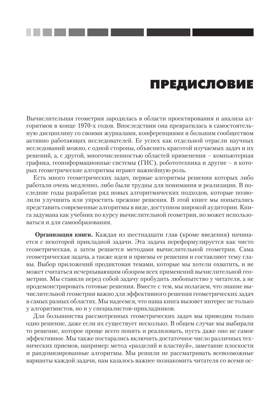 Все методы и решения, разрабатываемые в рамках вычислительной геометрии, связаны с конкретными применениями в робототехнике, компьютерной графике, САПР/АСУП и геоинформационных системах. Для большинства рассмотренных геометрических задач приводится одно, наиболее оптимальное решение. Рассмотрены все основные, а также ряд специальных тем вычислительной геометрии.