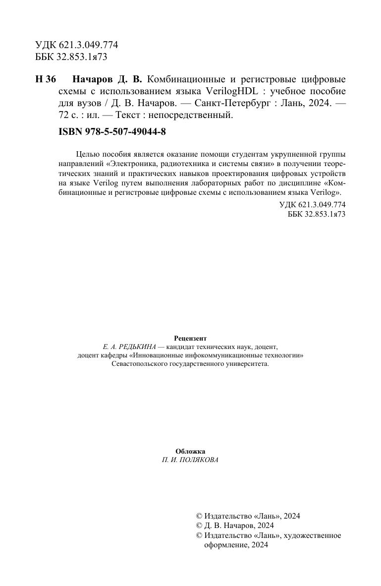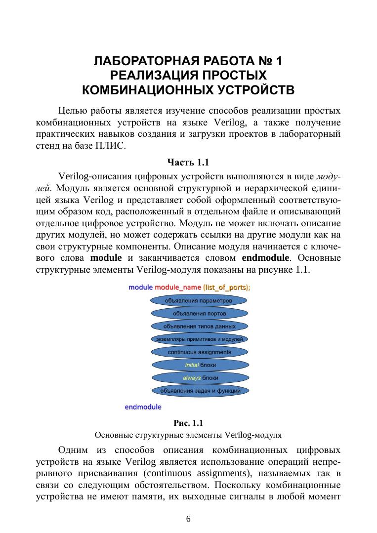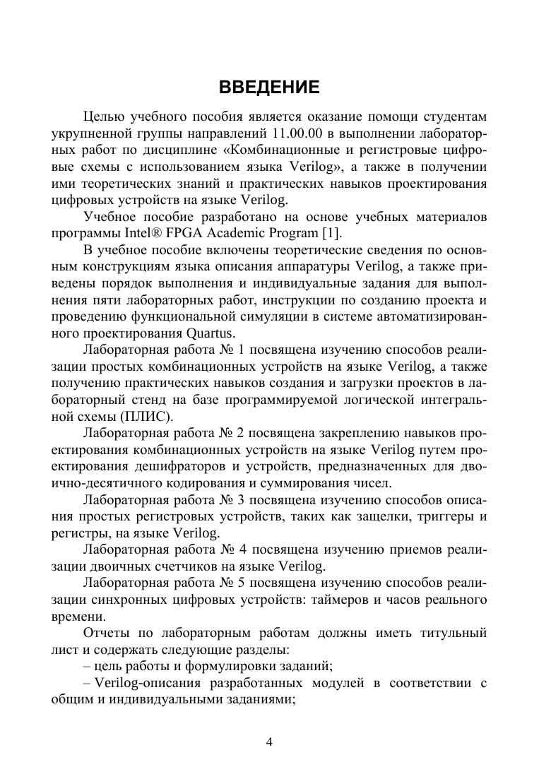 Целью пособия является оказание помощи студентам укрупненной группы направлений «Электроника, радиотехника и системы связи» в полу-чении теоретических знаний и практических навыков проектирования цифровых устройств на языке Verilog путем выполнения лабораторных работ по дисциплине «Комбинационные и регистровые цифровые схемы с использованием языка Verilog».