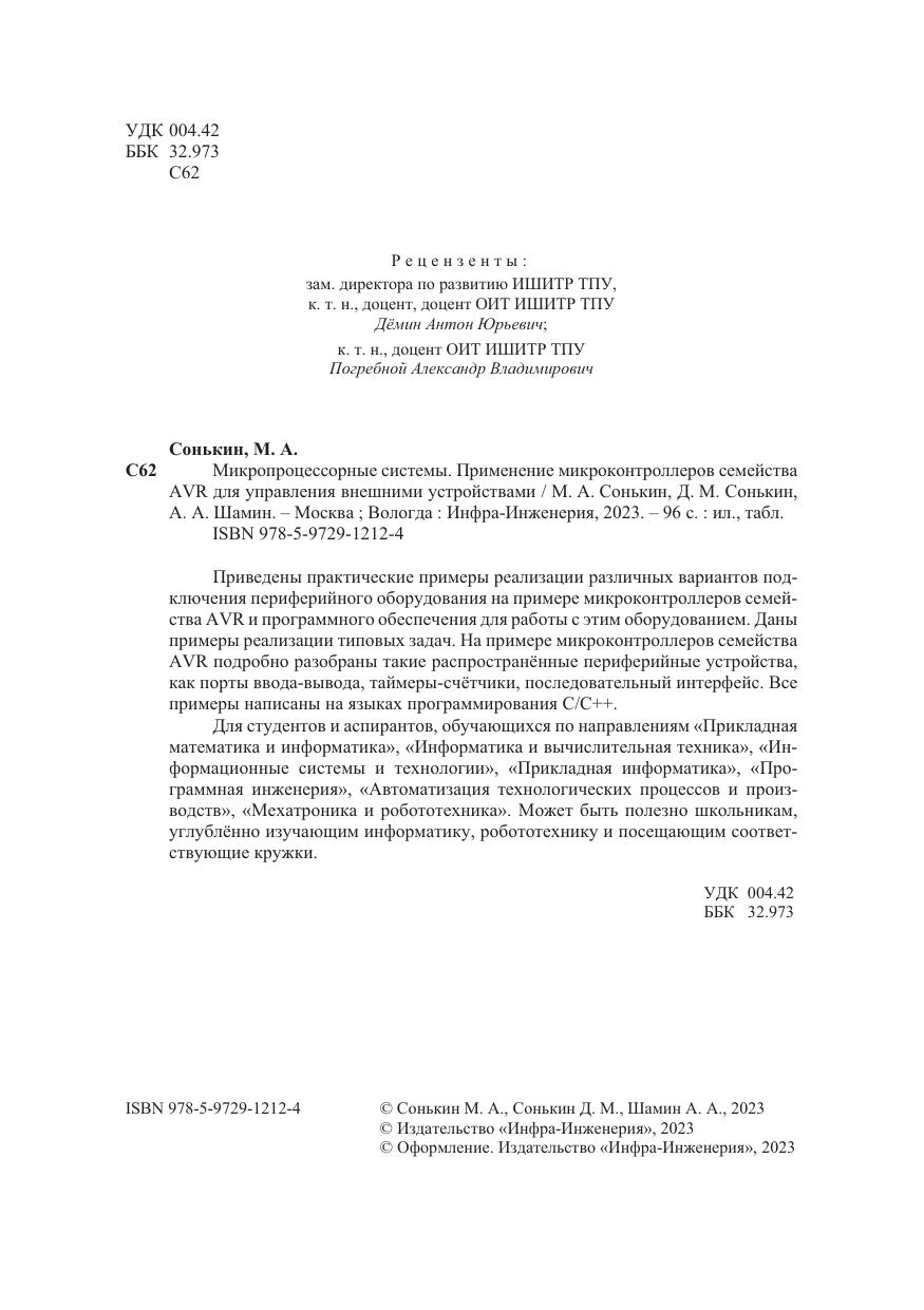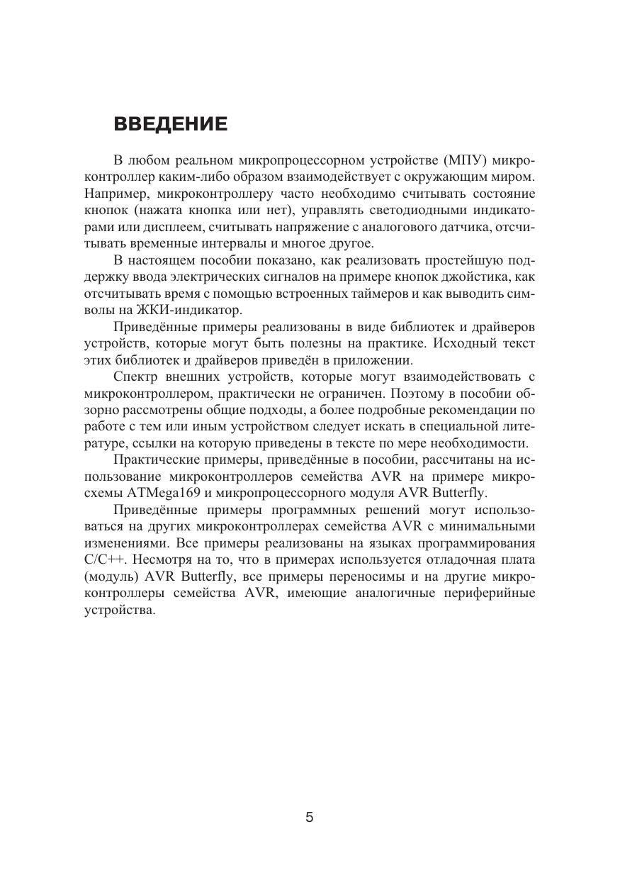 Приведены практические примеры реализации различных вариантов подключения периферийного оборудования на примере микроконтроллеров семейства AVR и программного обеспечения для работы с этим оборудованием. Даны примеры реализации типовых задач. На примере микроконтроллеров семейства AVR подробно разобраны такие распространённые периферийные устройства, как порты ввода-вывода, таймеры-счётчики, последовательный интерфейс. Все примеры написаны на языках программирования С/C++.