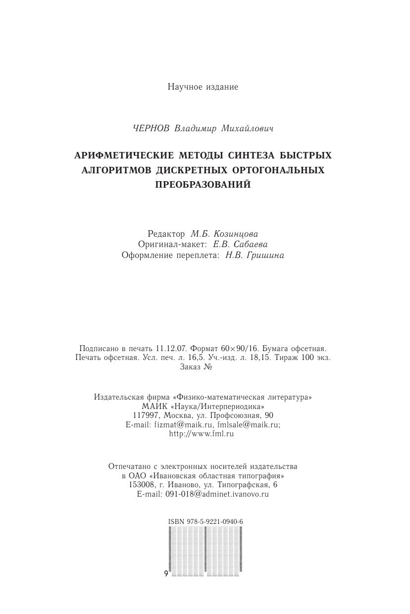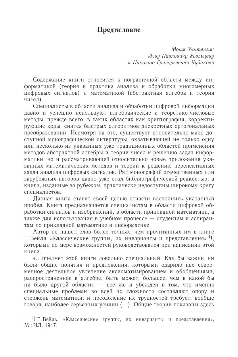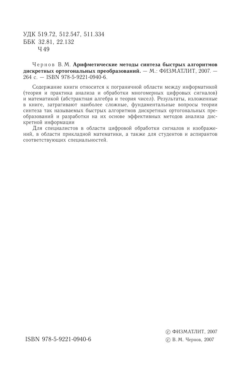 Содержание книги относится к пограничной области между информатикой (теория и практика анализа и обработки многомерных цифровых сигналов) и математикой (абстрактная алгебра и теория чисел). Результаты, изложенные в книге, затрагивают наиболее сложные, фундаментальные вопросы теории синтеза так называемых быстрых алгоритмов дискретных ортогональных преобразований и разработки на их основе эффективных методов анализа дискретной информации. Для специалистов в области цифровой обработки сигналов и изображений, в области прикладной математики, а также для студентов и аспирантов соответствующих специальностей.