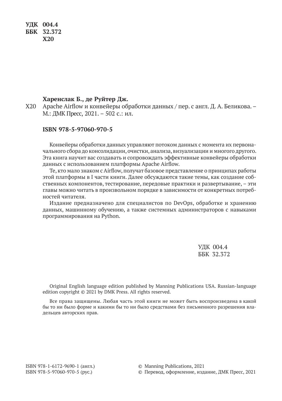 Эта книга научит вас создавать и сопровождать эффективные конвейеры обработки данных. Вы изучите наиболее распространен-ные модели их использования, особенности ориентированных ациклических графов (ОАГ), которые обеспечивают работу Airflow, а также способы их настройки в соответствии с потребностями вашего конвейера.
