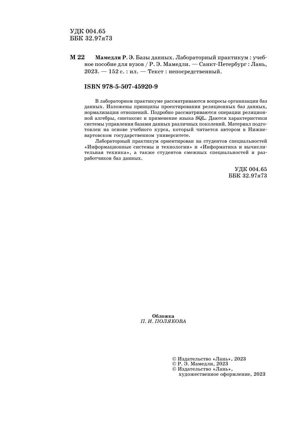 В лабораторном практикуме рассматриваются вопросы организации баз данных. Изложены принципы проектирования реляционных баз данных, нормализация отношений. Подробно рассматриваются операции реляционной алгебры, синтаксис и применение языка SQL. Даются характеристики системы управления базами данных различных поколений. Материал подготовлен на основе учебного курса, который читается автором в Нижневартовском государственном университете. Лабораторный практикум ориентирован на студентов специальностей «Информационные системы и технологии» и «Информатика и вычислительная техника», а также студентов смежных специальностей и разработчиков баз данных.