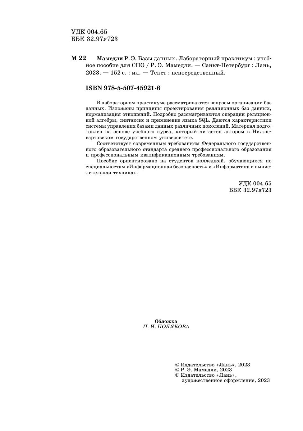 В лабораторном практикуме рассматриваются вопросы организации баз данных. Изложены принципы проектирования реляционных баз данных, нормализация отношений. Подробно рассматриваются операции реляционной алгебры, синтаксис и применение языка SQL. Даются характеристики системы управления базами данных различных поколений. Материал подготовлен на основе учебного курса, который читается автором в Нижневартовском государственном университете. Соответствует современным требованиям Федерального государственного образовательного стандарта среднего профессионального образования и профессиональным квалификационным требованиям. Пособие ориентировано на студентов колледжей, обучающихся по специальностям «Информационная безопасность» и «Информатика и вычислительная техника».