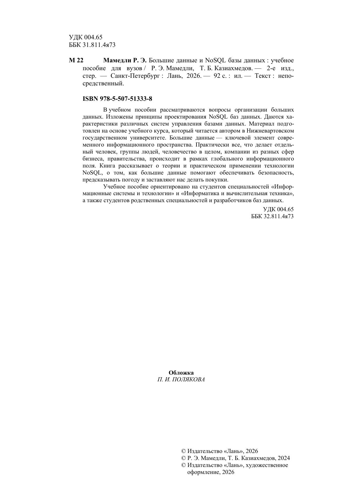В учебном пособии рассматриваются вопросы организации больших данных. Изложены принципы проектирования NoSQL баз данных. Даются характеристики различных систем управления базами данных. Материал подготовлен на основе учебного курса, который читается автором в Нижневартовском государственном университете. Большие данные — ключевой элемент современного информационного пространства. Практически все, что делает отдельный человек, группы людей, человечество в целом, компании из разных сфер бизнеса, правительства, происходит в рамках глобального информационного поля. Книга рассказывает о теории и практическом применении технологии NoSQL, о том, как большие данные помогают обеспечивать безопасность, предсказывать погоду и заставляют нас делать покупки. Учебное пособие ориентировано на студентов специальностей «Информационные системы и технологии» и «Информатика и вычислительная техника», а также студентов родственных специальностей и разработчиков баз данных.