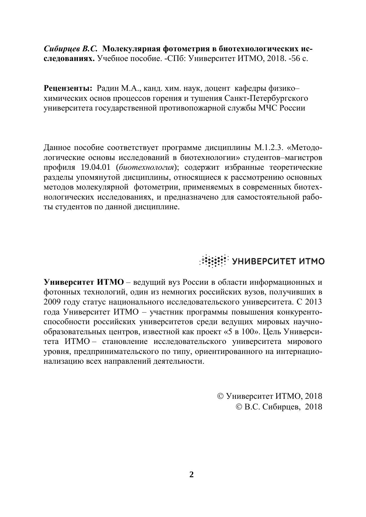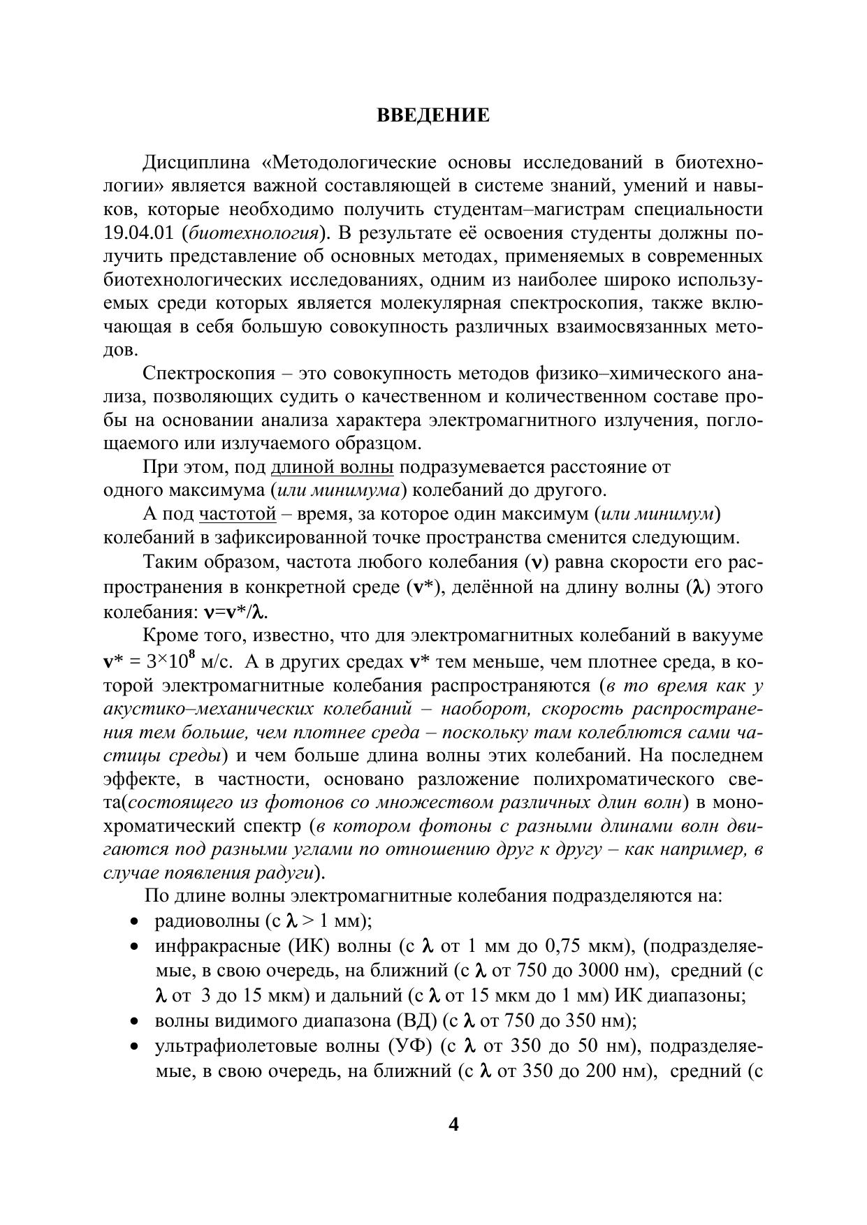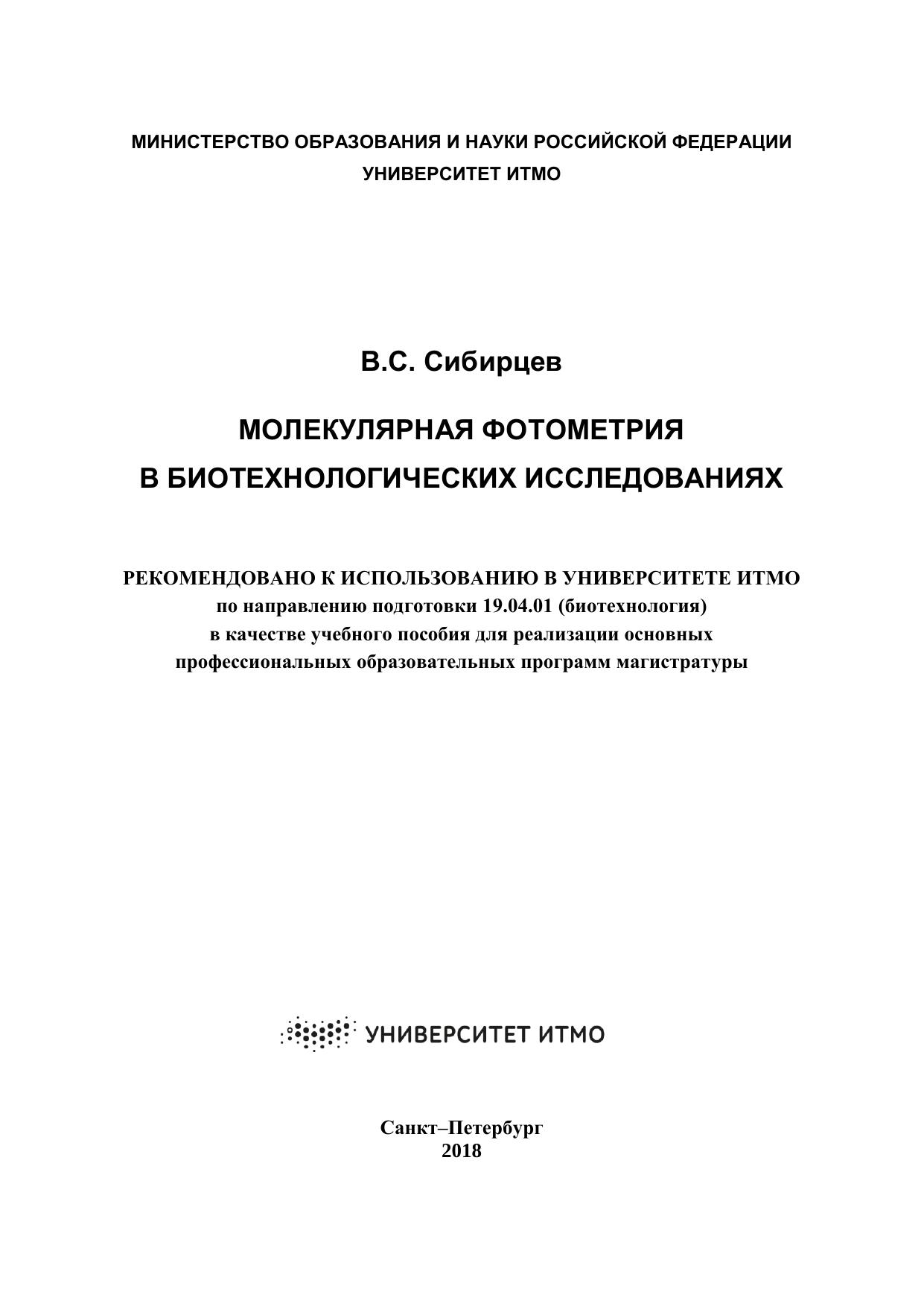 Данное пособие соответствует программе дисциплины М.1.2.3. «Методологические основы исследований в биотехнологии» студентов–магистров профиля 19.04.01 (биотехнология); содержит избранные теоретические разделы упомянутой дисциплины, относящиеся к рассмотрению основных методов молекулярной фотометрии, применяемых в современных биотехнологических исследованиях, и предназначено для самостоятельной работы студентов по данной дисциплине.