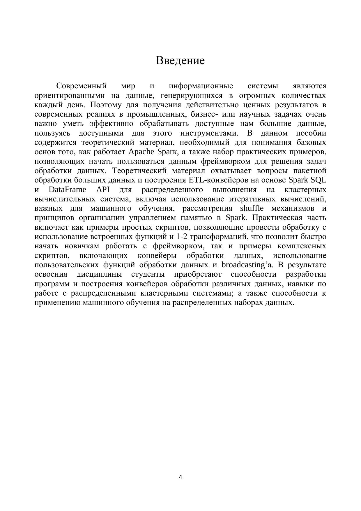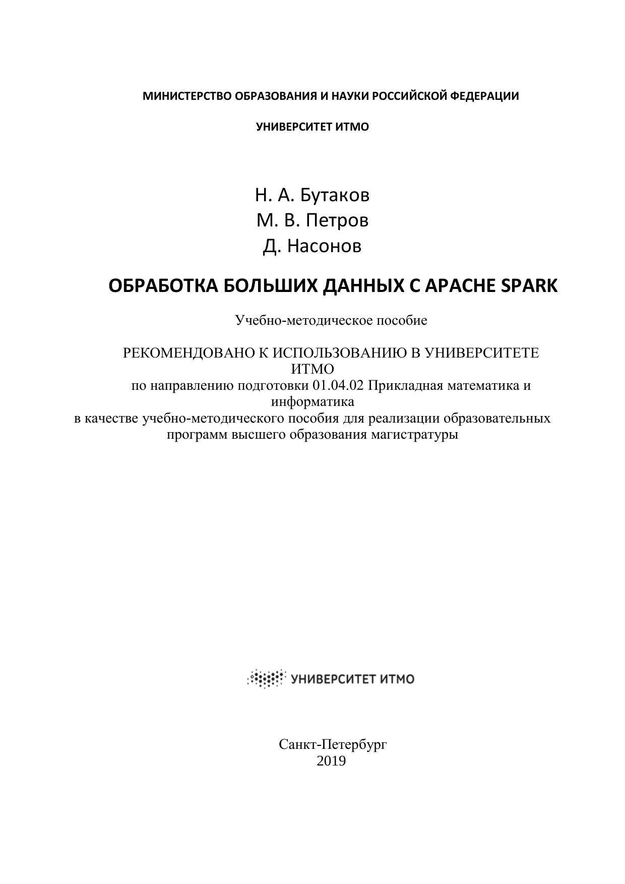 Учебно-методическое пособие содержит теоретический материал и примеры выполнения задач для курса «Введение в технологии обработки больших данных». Пособие составлено с учётом проведения лабораторных работ с помощью фреймворка Apache Spark. Содержание дисциплины охватывает круг вопросов, связанных с организацией построения ETLконвейеров на основе Spark SQL и DataFrame API для распределенного выполнения на кластерных вычислительных система, включая использование итеративных вычислений, важных для машинного обучения, рассмотрения shuffle механизмов и принципов организации управлением памятью в Spark. В результате освоения дисциплины студенты приобретают способности разработки программ и построения конвейеров обработки различных данных, навыки по работе с распределенными кластерными системами, а также способности к применению машинного обучения на распределенных наборах данных