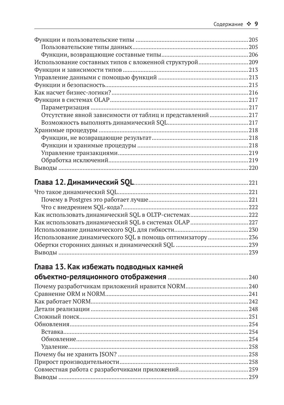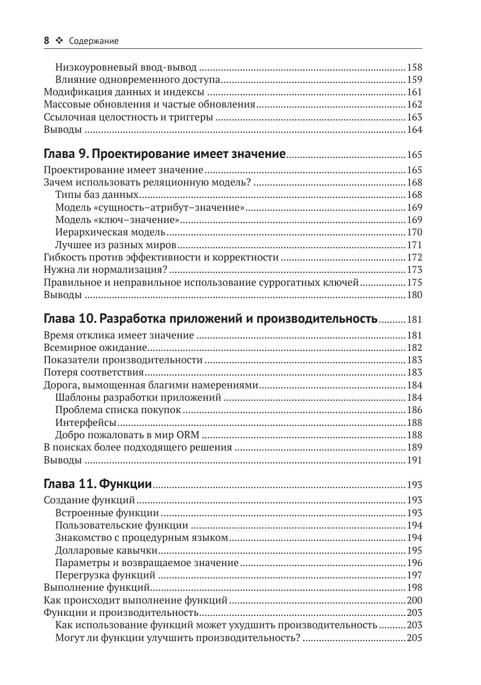 В первых главах книги рассказывается о том, что такое эффективная система, как измерить производительность и поставить связанные с этим показателем цели. Представлены различные классы запросов и подходящие для каждого из них методы оптимизации, такие как использование индексов и определенных алгоритмов соединения. Объясняется, как читать и понимать планы выполнения запросов, какие существуют методы воздействия на эти планы с точки зрения оптимизации производительности. Далее рассматриваются сложные темы: использование функций и процедур, динамический SQL и сгенерированные запросы. Показано, как эти методы используются вместе для создания эффективных приложений.