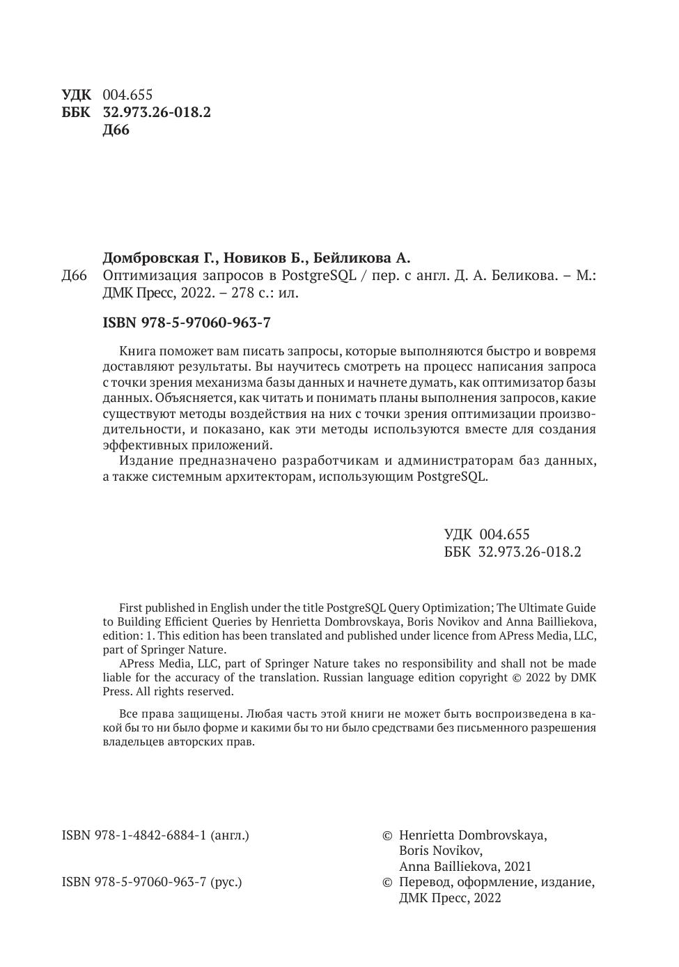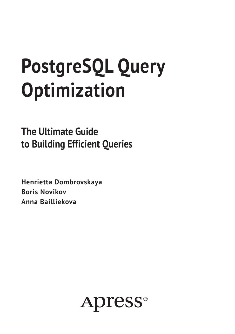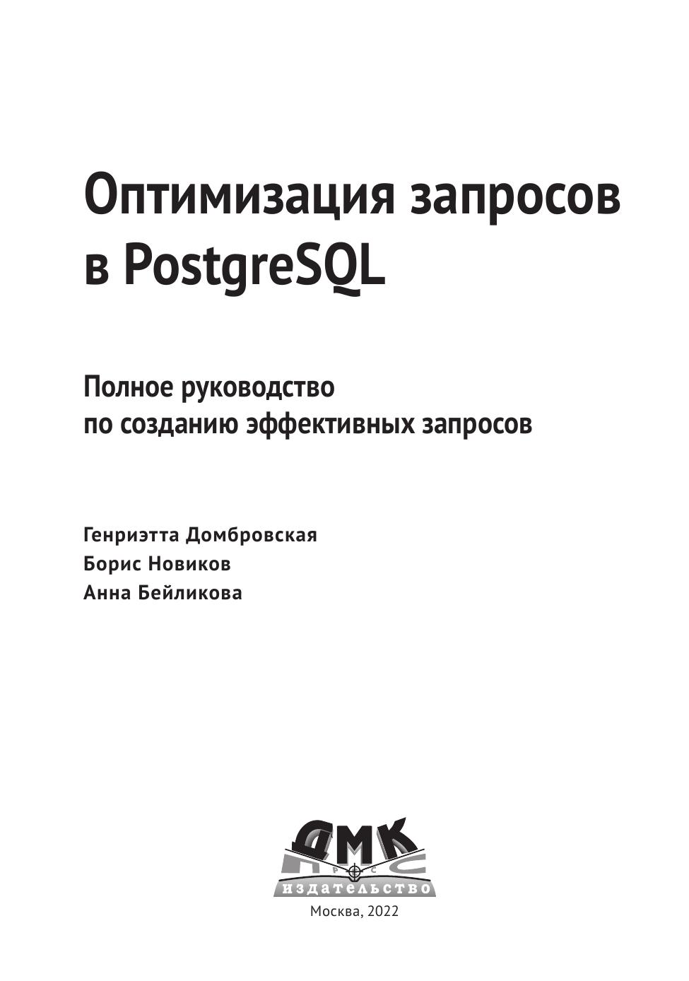 Книга предназначена для ИТ-специалистов, которые хотят разрабатывать производительные и масштабируемые приложения. Она будет полезна разработчикам и администраторам баз данных, тем, кто разрабатывает серверную часть и отвечает за написание вызовов к базам данных, а также системным архитекторам, участвующим в проектировании прикладных систем, использующих базу данных PostgreSQL.